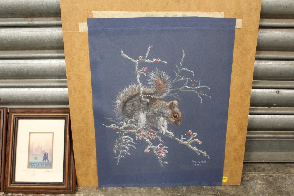 A UNFRAMED PASTEL PICTURE OF A SQUIRREL ON A BRANCH TOGETHER WITH TWO SIGNED LIMITED EDITION GLYN MATTHEWS PRINTS ETC. (5)