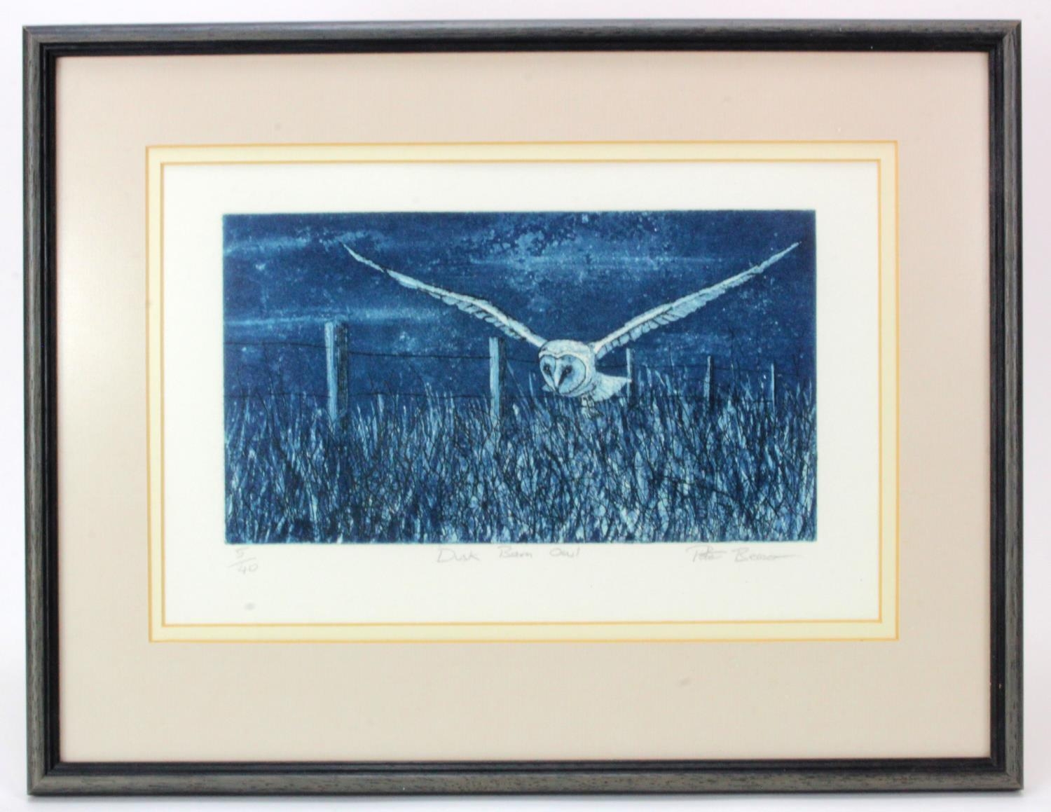 Peter Beeson. Dusk Barn Owl Limited edition print 5/40. Signed in pencil. Framed and glazed. Measures approx 25cm x 17cm