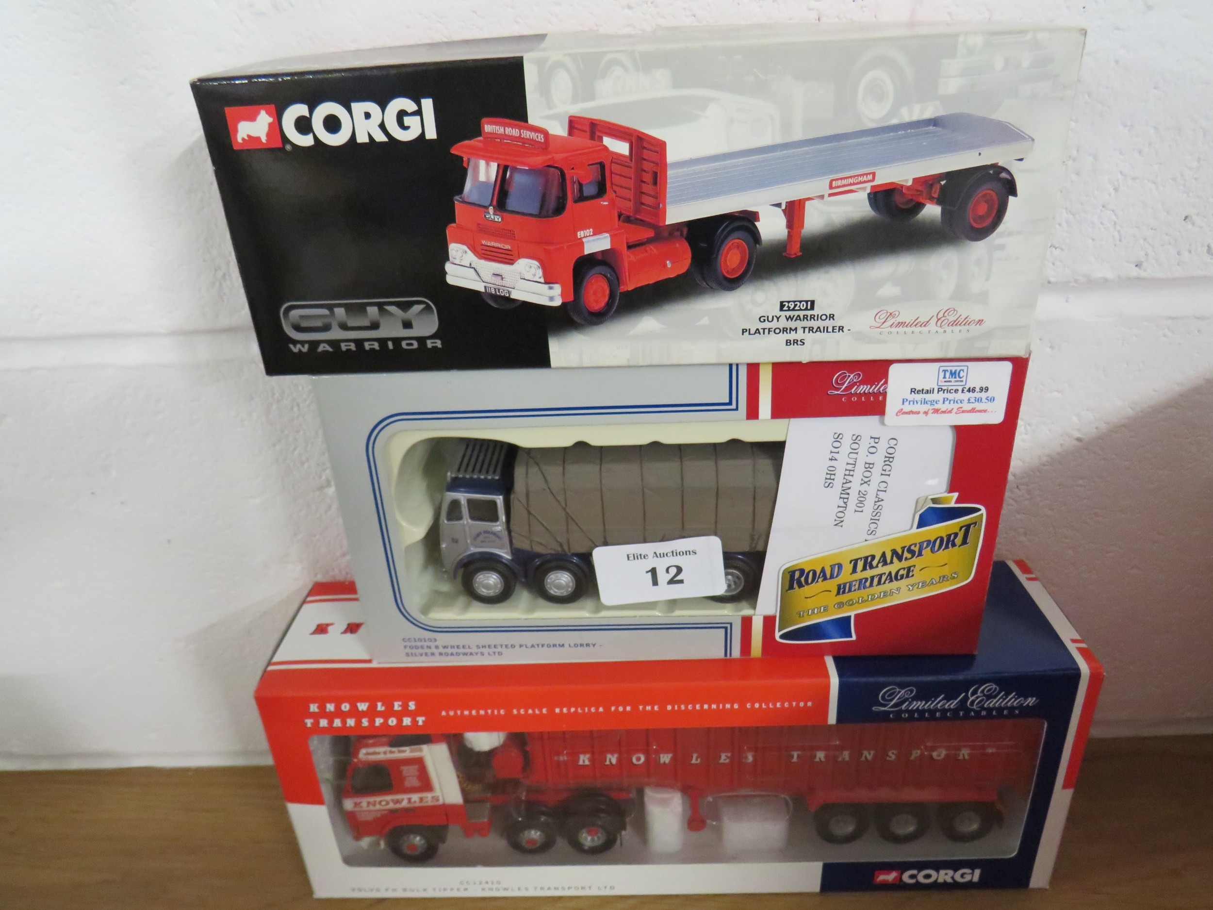 Three boxed corgi diecast trucks to include Guy Warrior, Road Transport Heritage and Knowles Transport