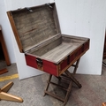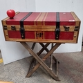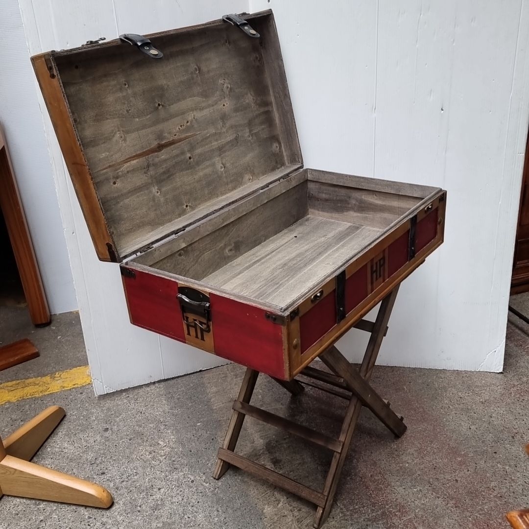 A HARRY POTTER Antique-style red trunk with wooden trim and black leather straps, featuring "HP" initials, mounted on a folding wooden stand. It contained a bunch of spells but when we opened it they all flew away. If we find them, will include them.