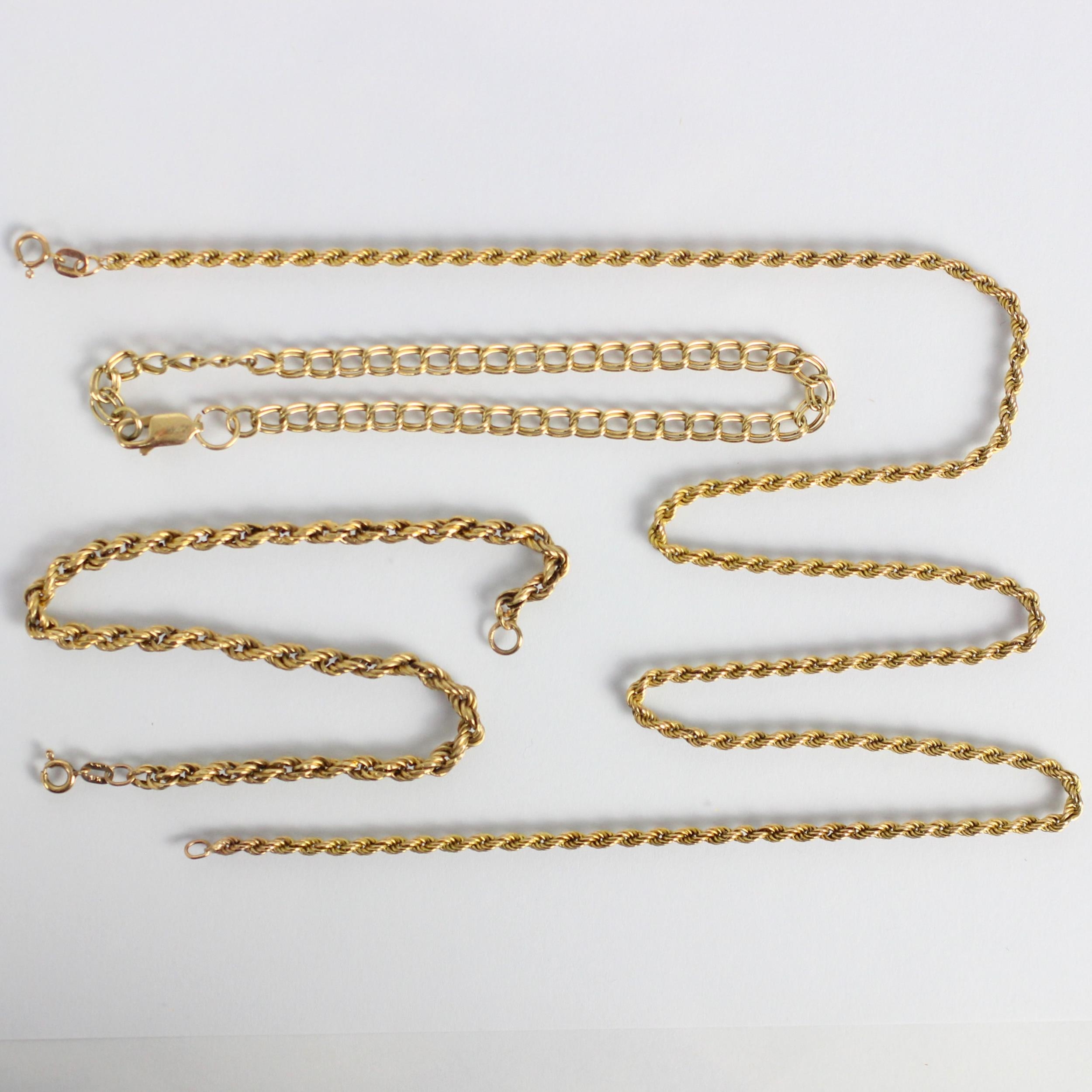 A group of yellow metal jewellery, including a 9ct rope twist bracelet, with bolt ring fastening, 21cm long, a 9ct rope twist necklace, 51.5cm long, and a yellow metal bracelet, gross weight 10gms (3)