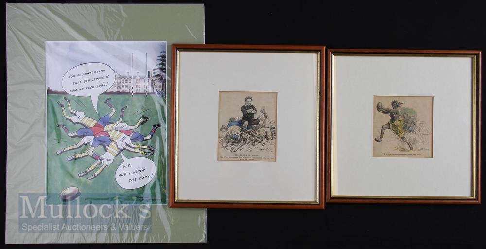 Two Framed & One Mounted Rugby Cartoon Art (3): Two 10.5 v 10 mounted, wood-framed & glazed Punch type 20s/30s rugby Cartoons, one far from politically correct, the other of All Black genius George Nepia sitting on the ruins of the London team, 1924; plus a lovely coloured Schweppes advert from 1947 featuring a maul of sorts at a Rugby School lookalike, 12.5 v 15.5 inc mount. Very good