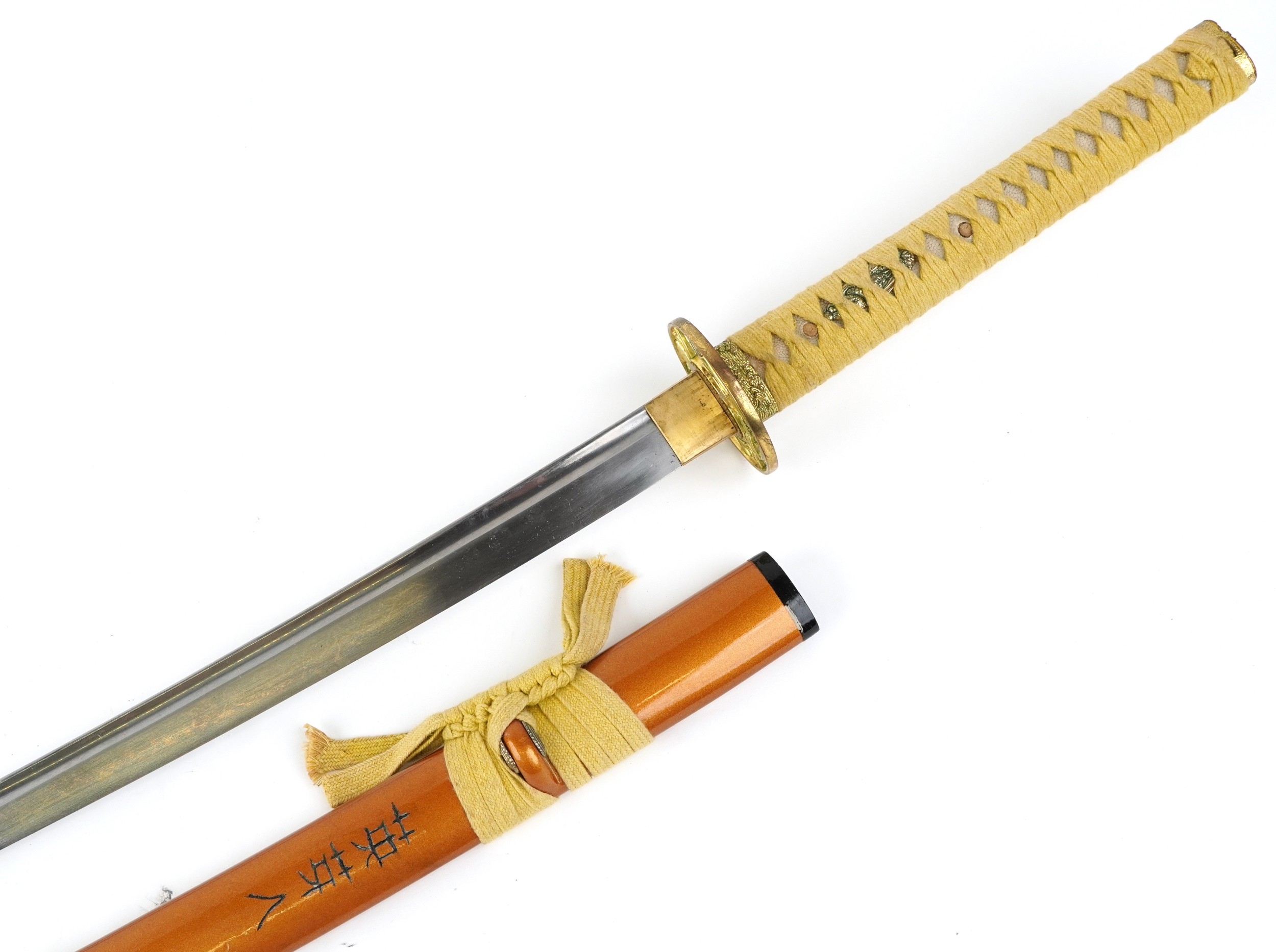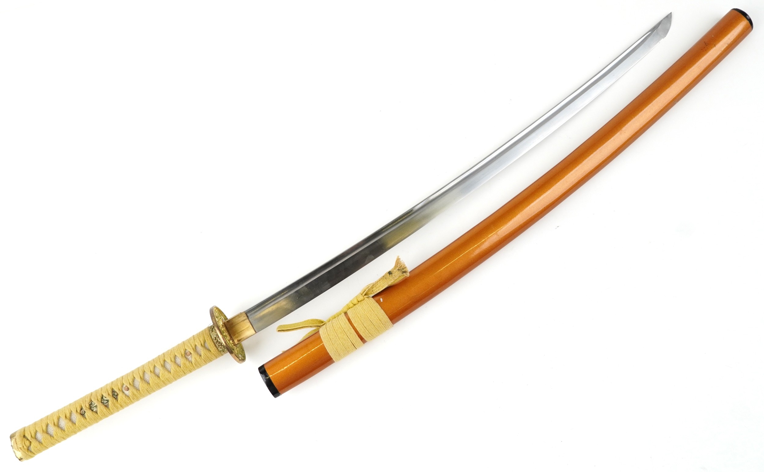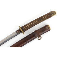 A decorative Japanese Katana sword with a string bound shagreen grip, the sheath signed, overall 103cm in length.