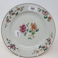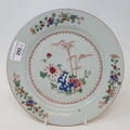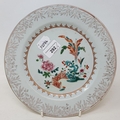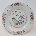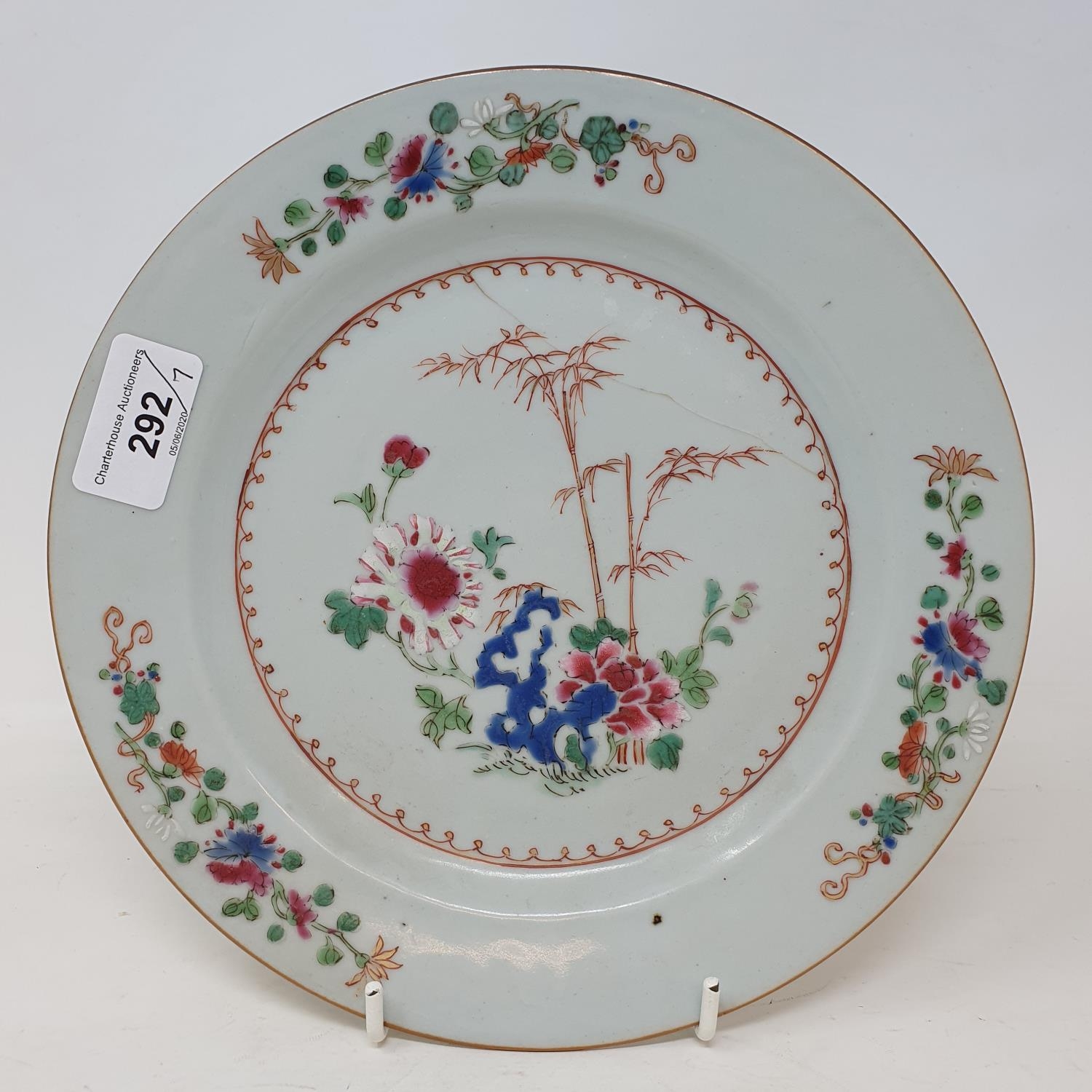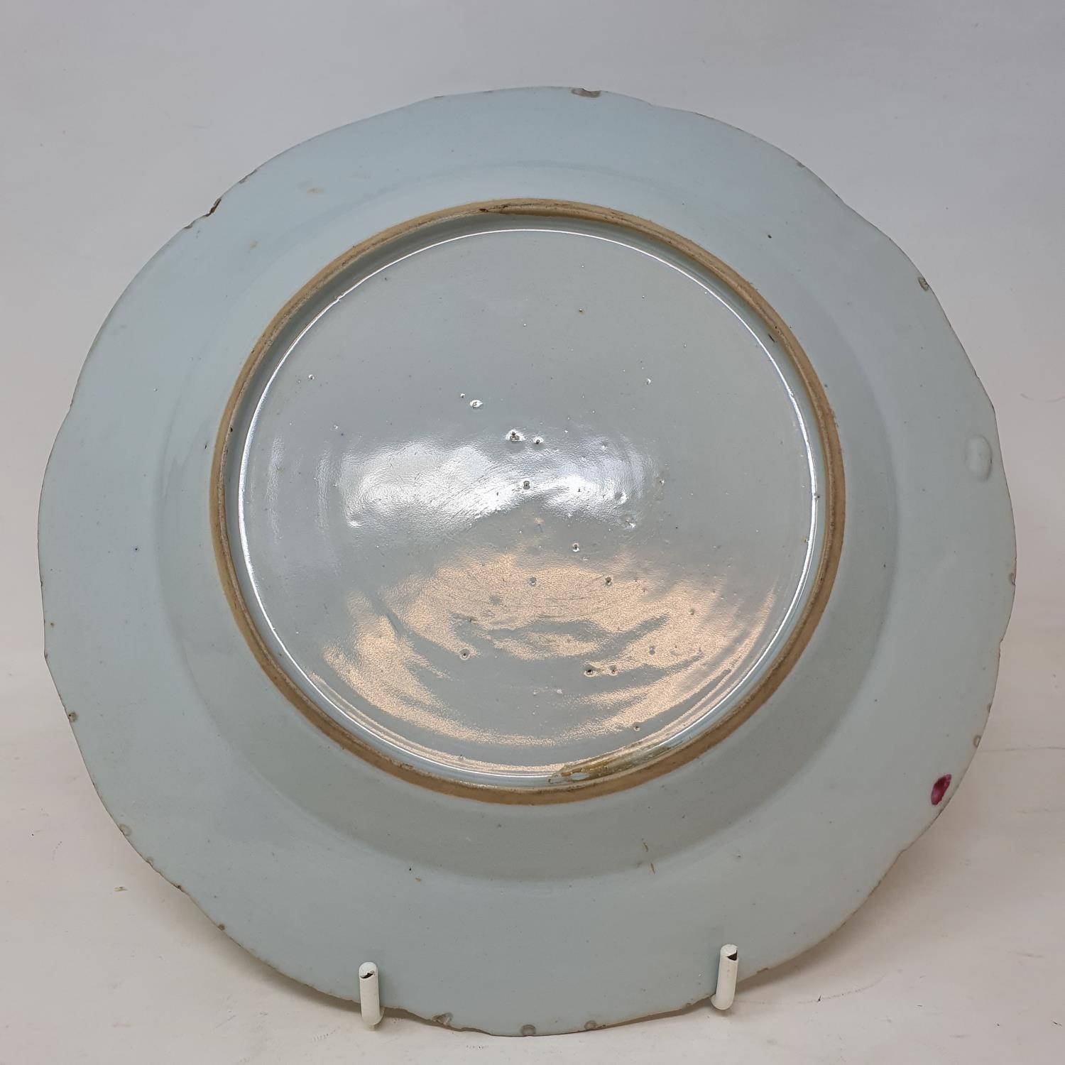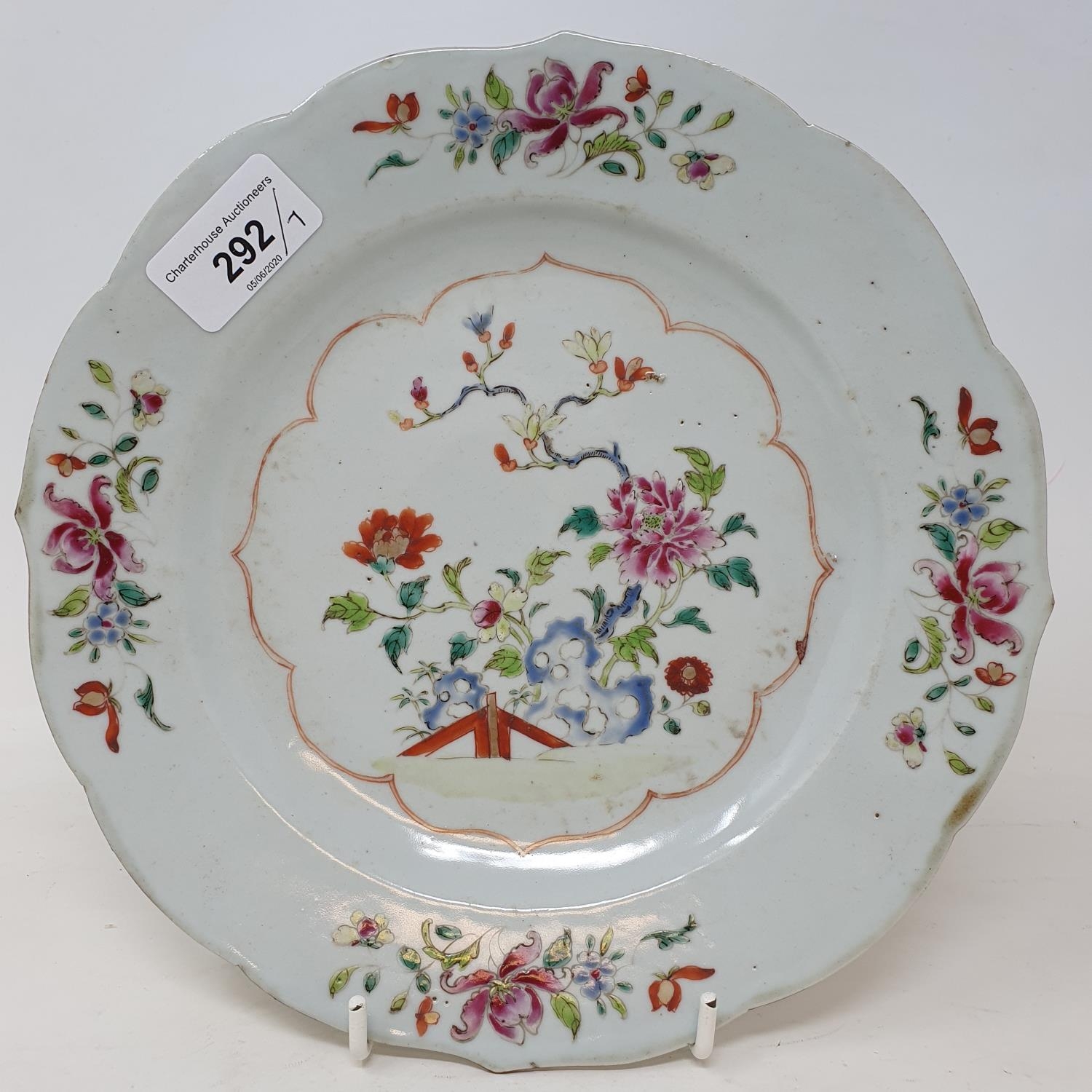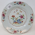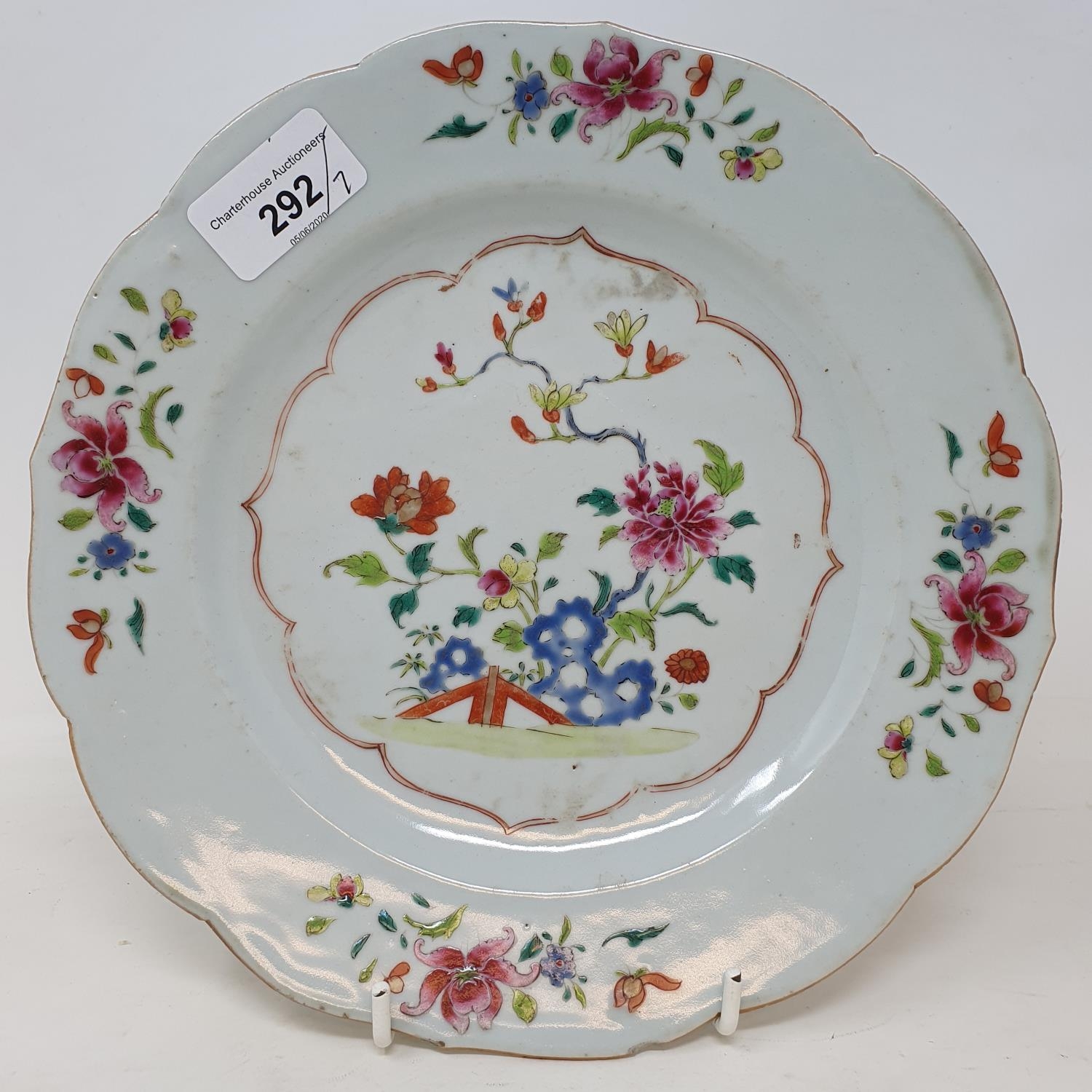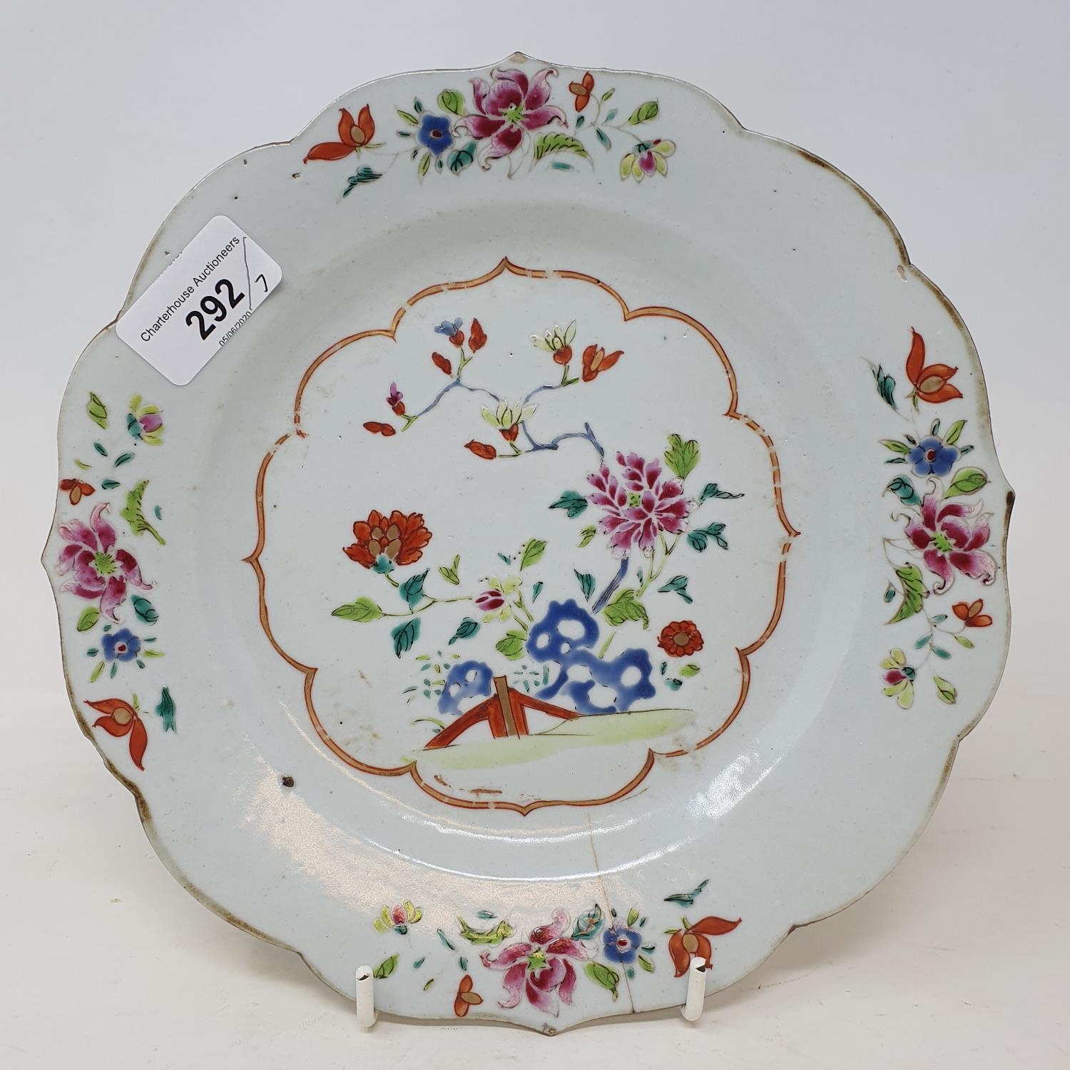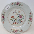 A set of four Chinese porcelain famille rose plates, of shaped circular form, decorated flowers and foliage, 23 cm diameter, and three other similar plates, mostly with rim chips and/or cracks (7)