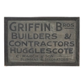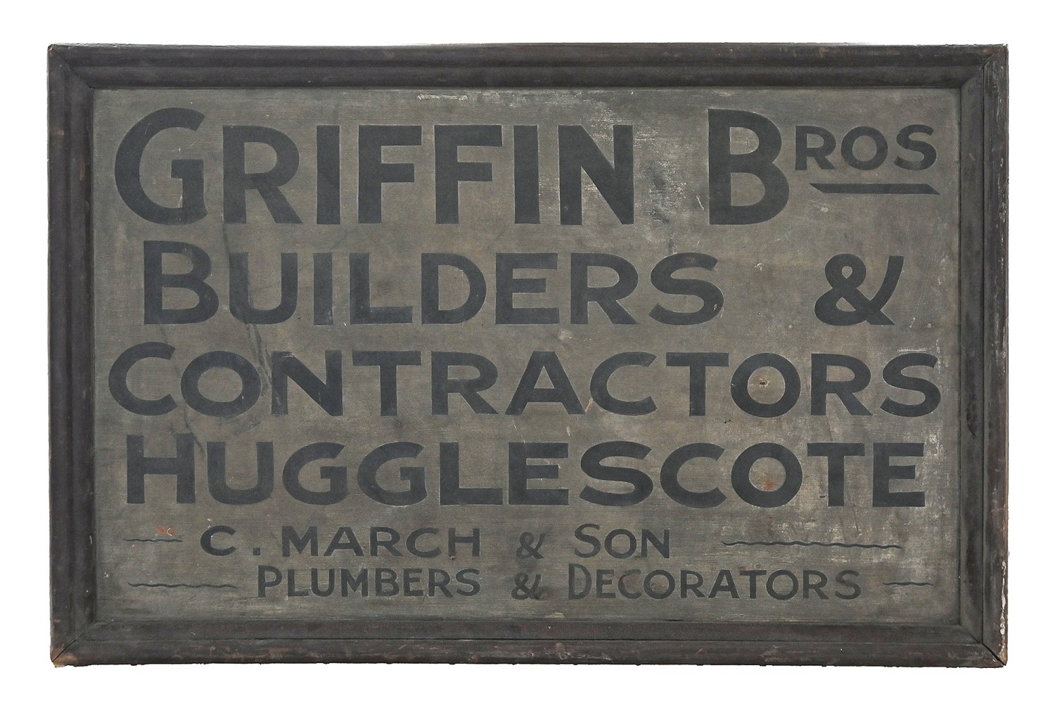 Advertising. A painted wood tradesman's name board, early 20th c, inscribed GRIFFIN BROS BUILDERS & CONTRACTORS HAGGLESCOTE C. MARCH & SONS PLUMBERS & DECORATORS, 56 x 84cm