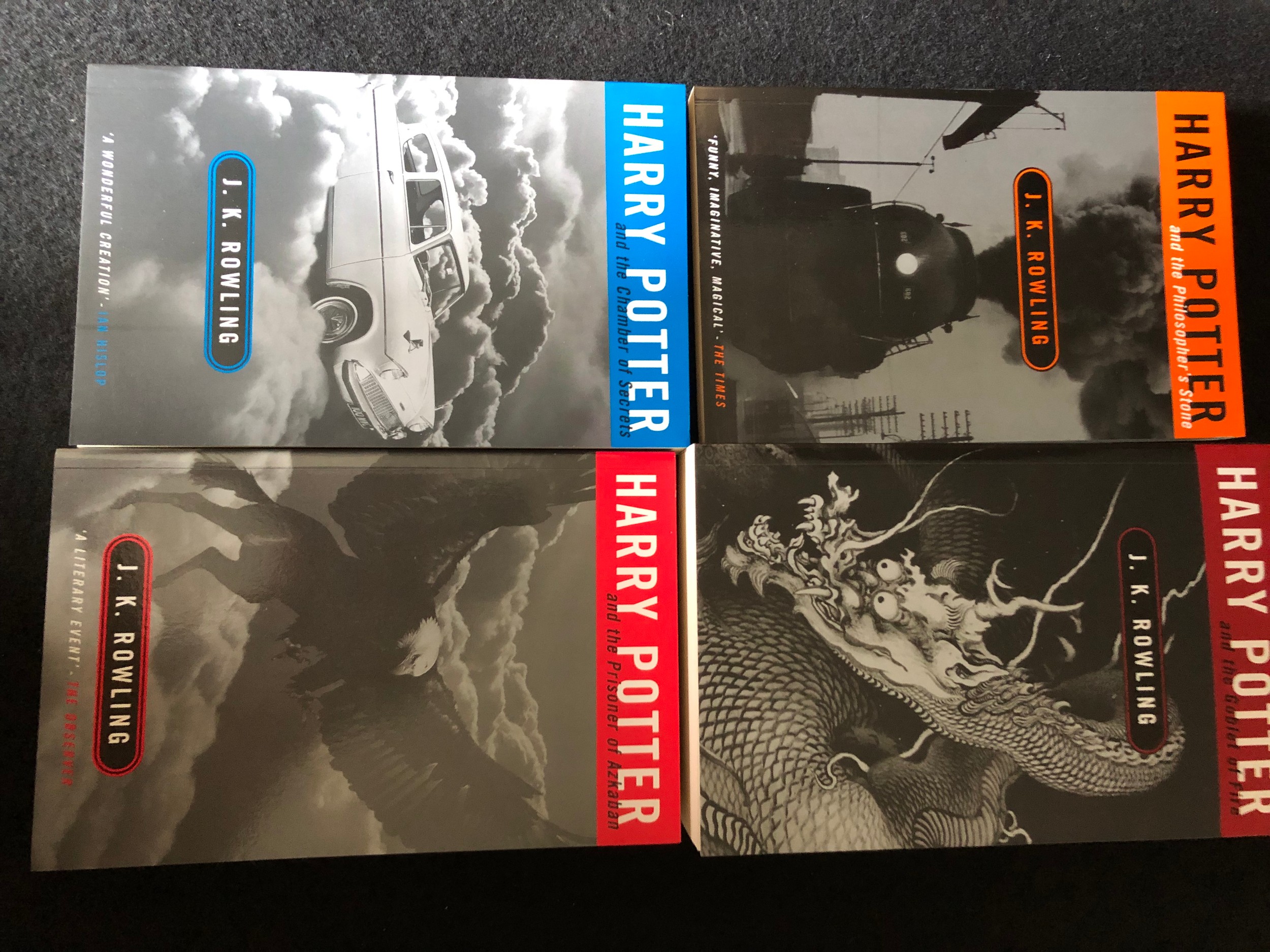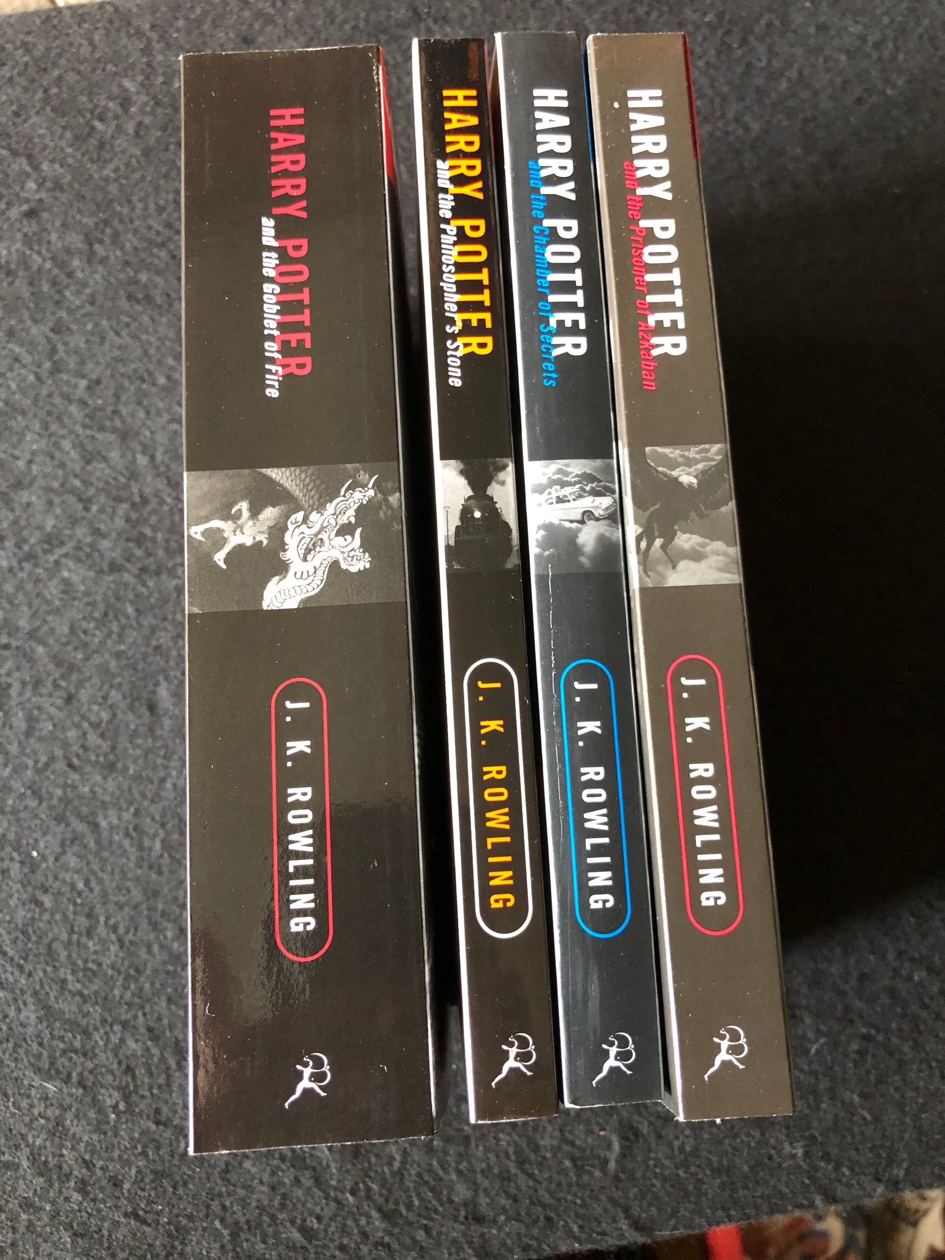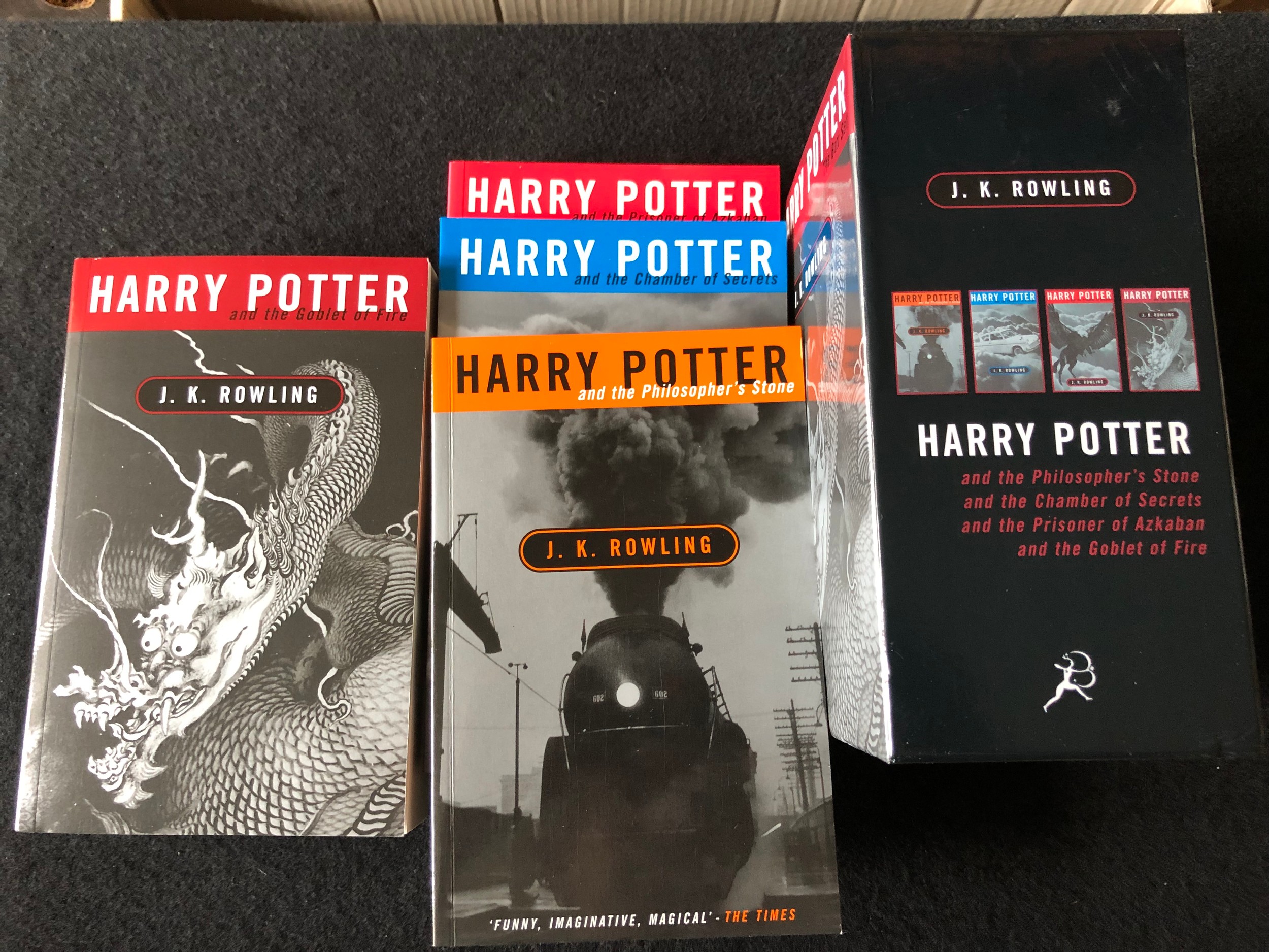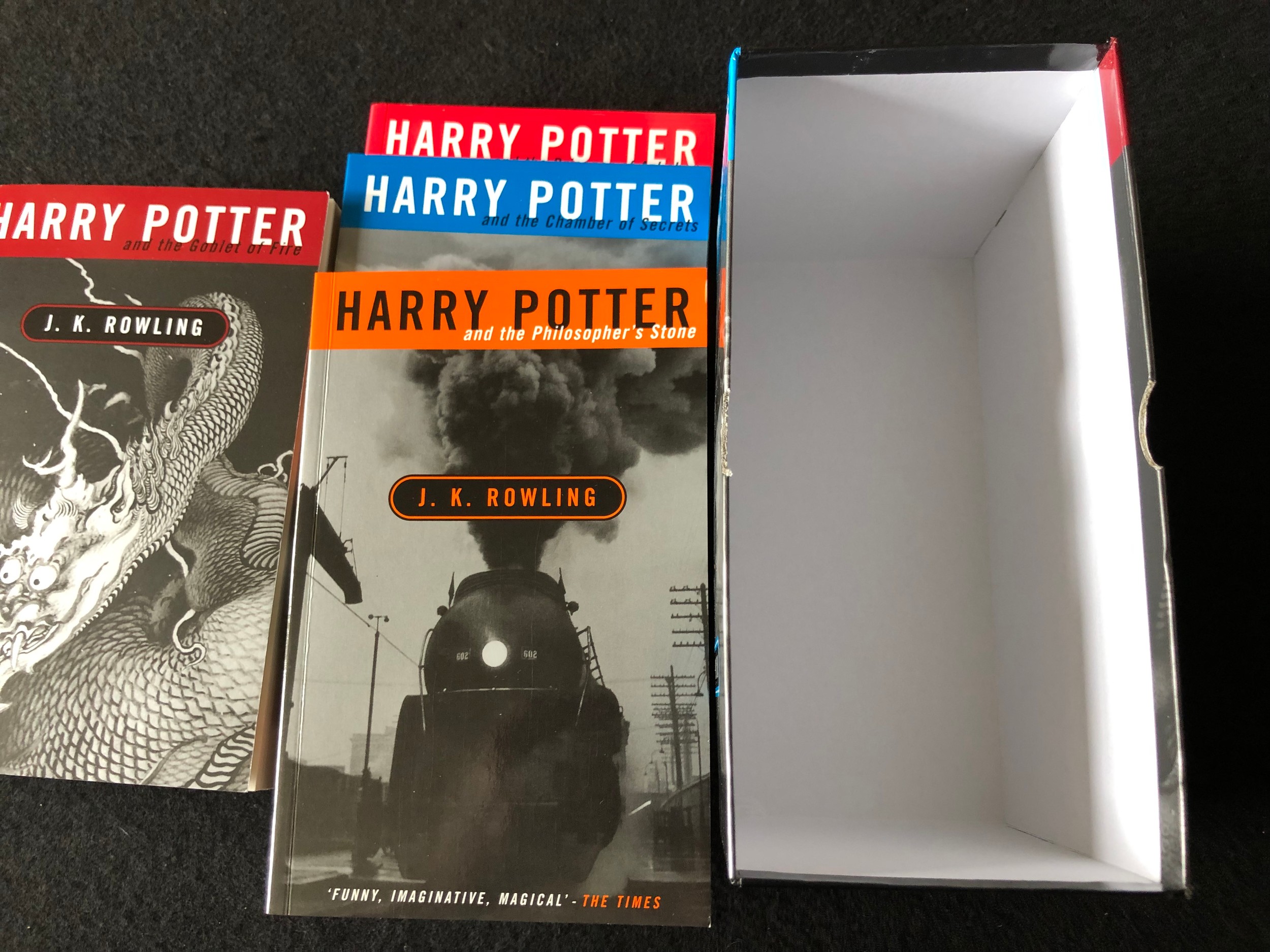 In excellent condition. Never opened to read. As close to new as you can get. Please note that one book is copyright Joanne Rowling which is rare.