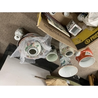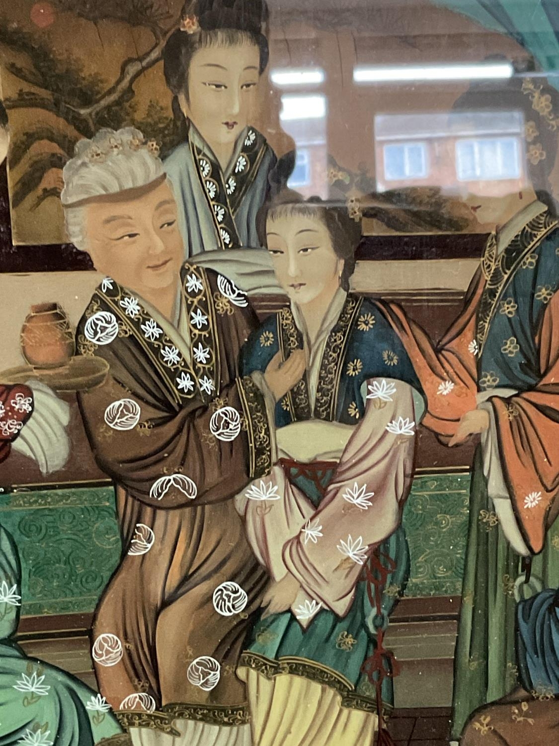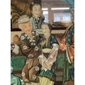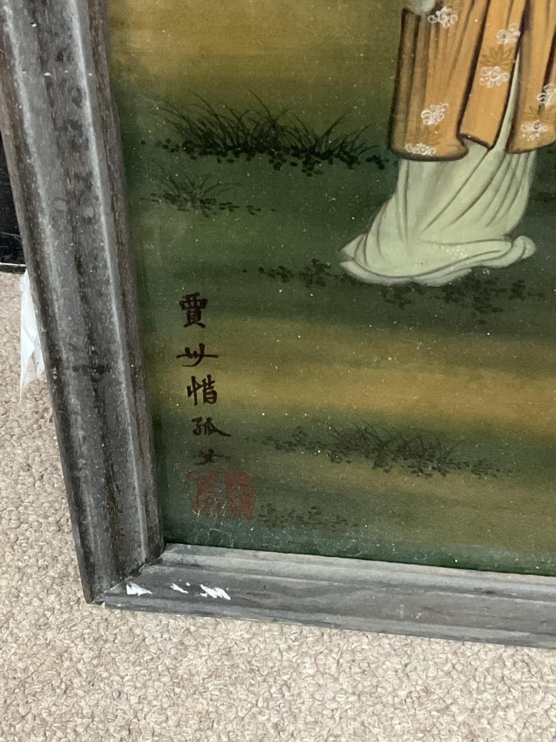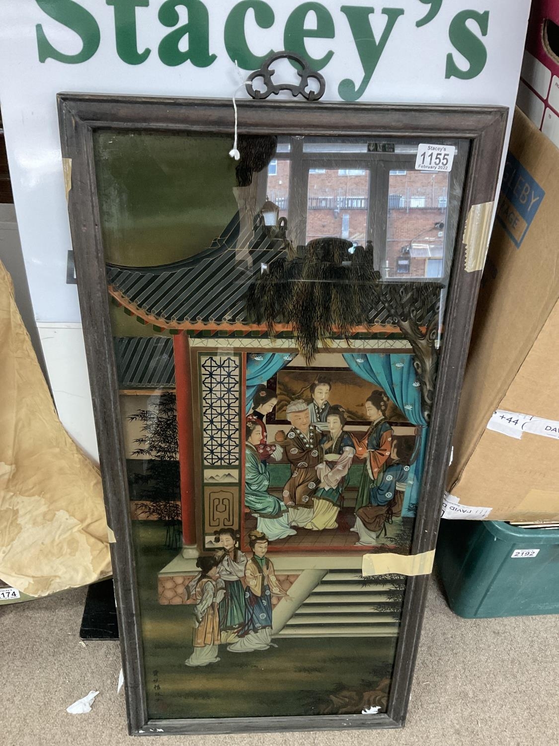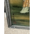 A large Chinese reverse hand painted glass panel with elm frame. 93 x 44cm.