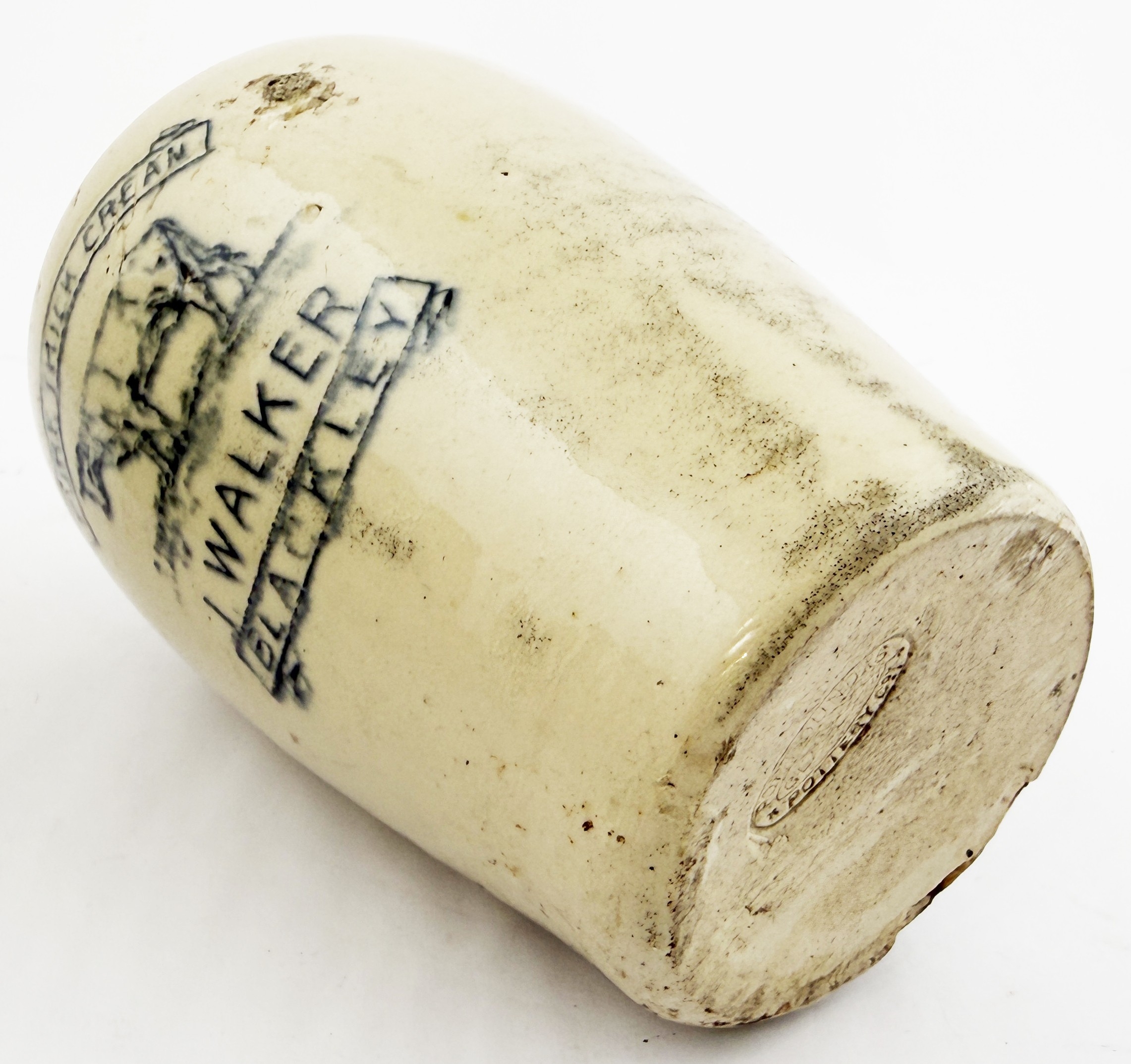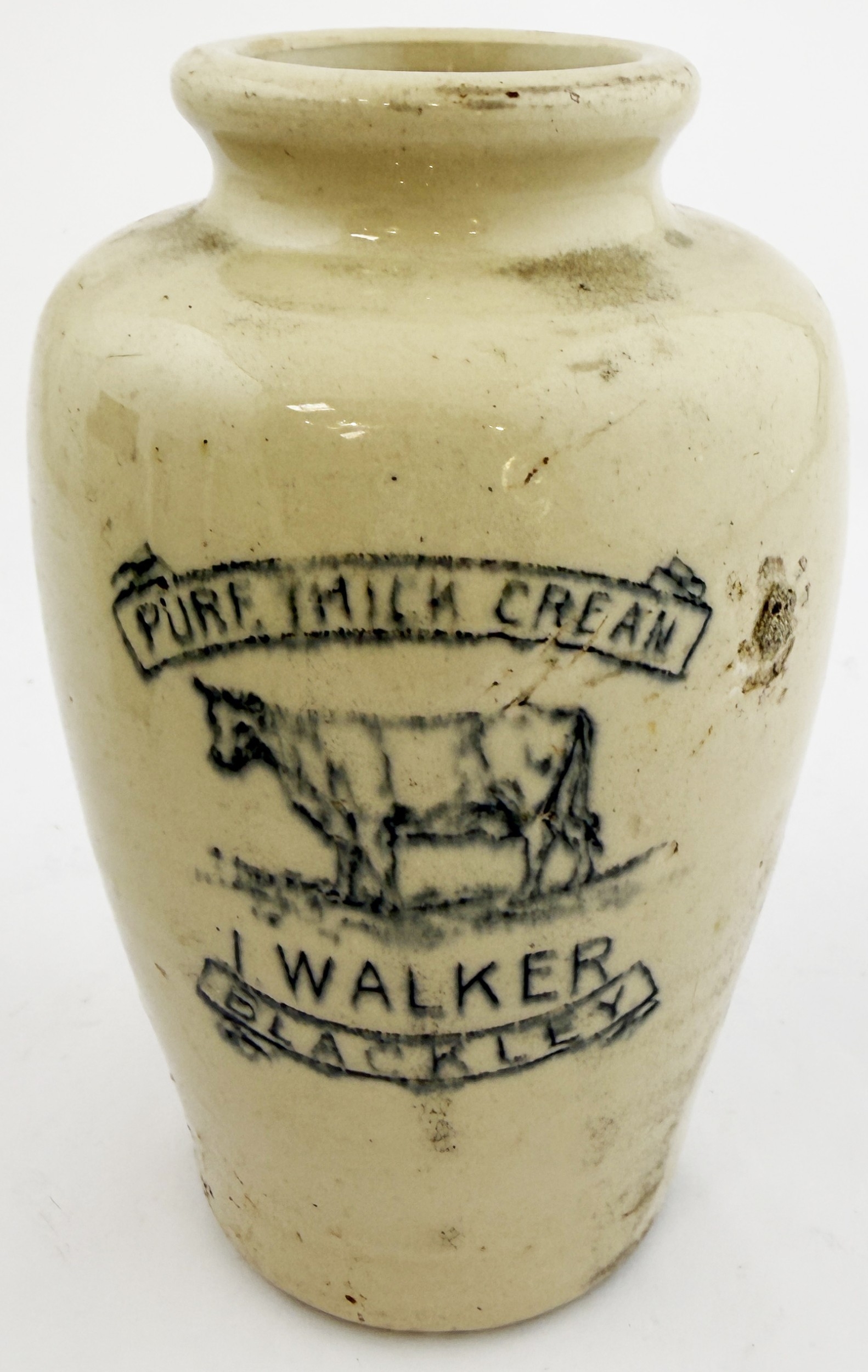 LARGE WALKER BLACKLEY CREAM POT. 6.1ins. A scarce very large size all-white cream pot printed PURE THICK CREAM/ I.WALKER/ BLACKLEY around a standing cow pict. Port Dundas base p.m. Hugh Davidson collection. Chip (or possibly kiln pull) to rear base edge otherwise very good.