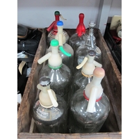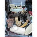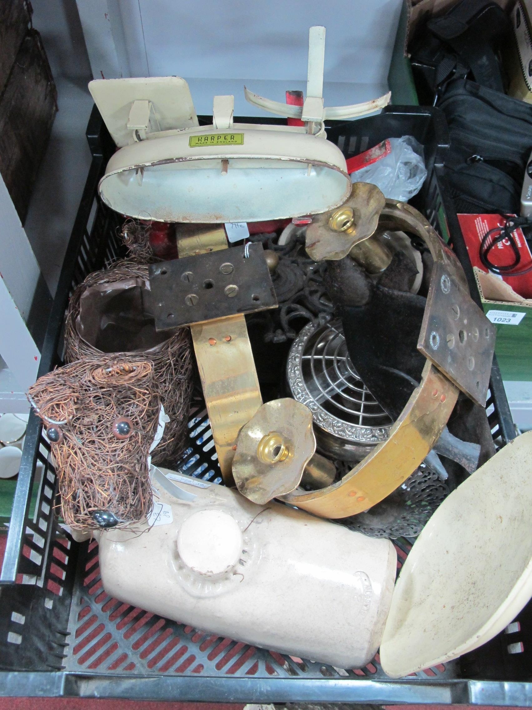A pair of heavy brass two candle sconces, two sets of scales and set of weights, stone ware jelly mould and hot water bottle, small dog planter, other metal work. One Box