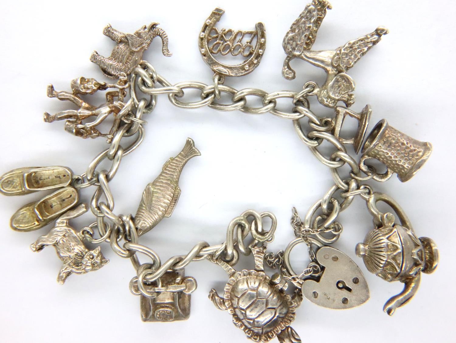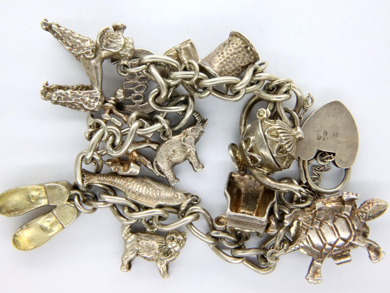 925 silver charm bracelet with twelve charms to include fish, poodle etc, L: 16 cm, combined 45g. P&P Group 1 (£14+VAT for the first lot and £1+VAT for subsequent lots)