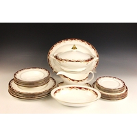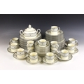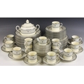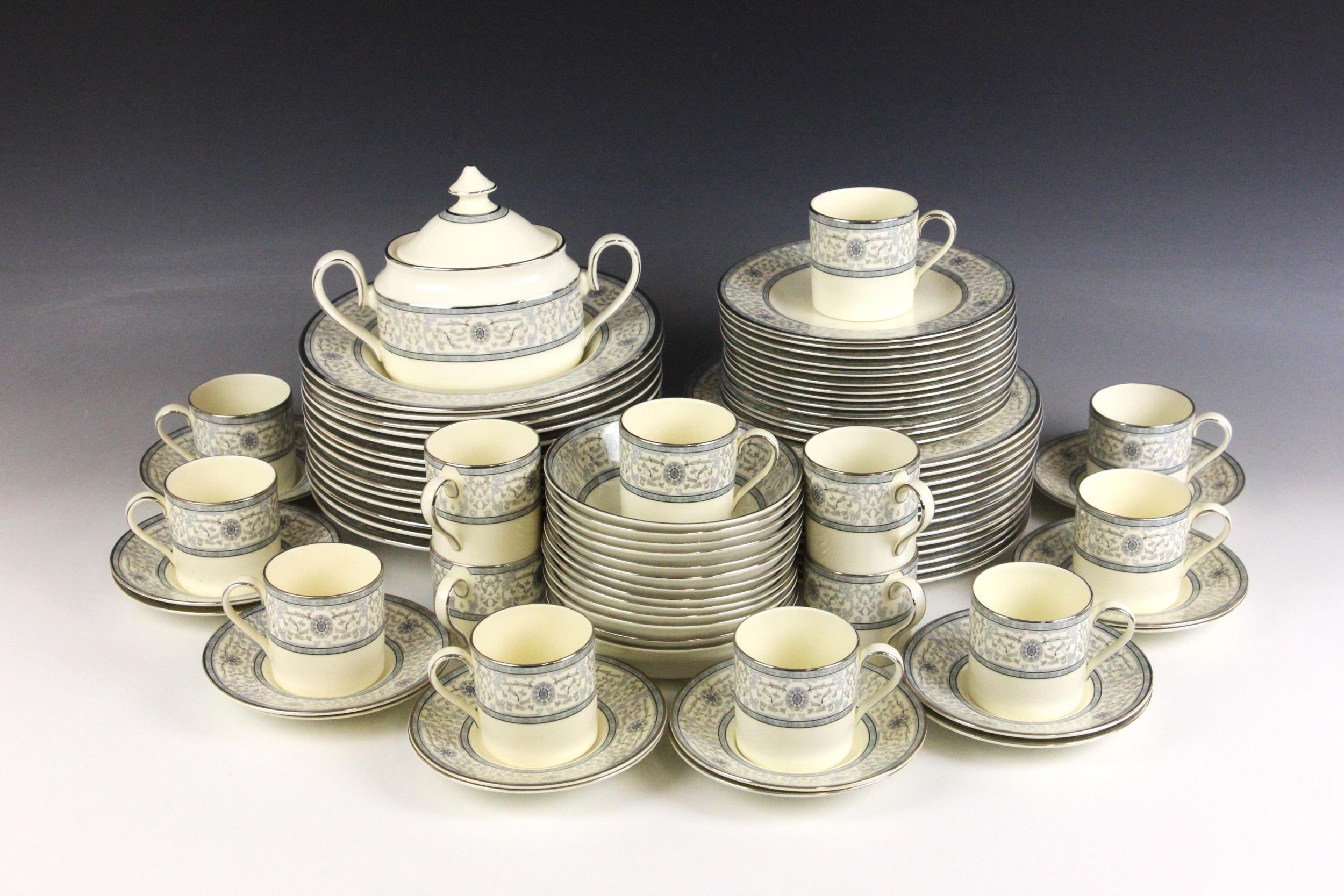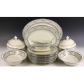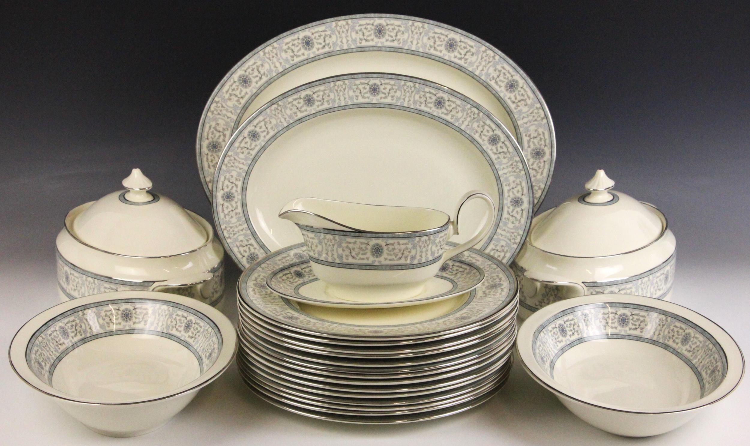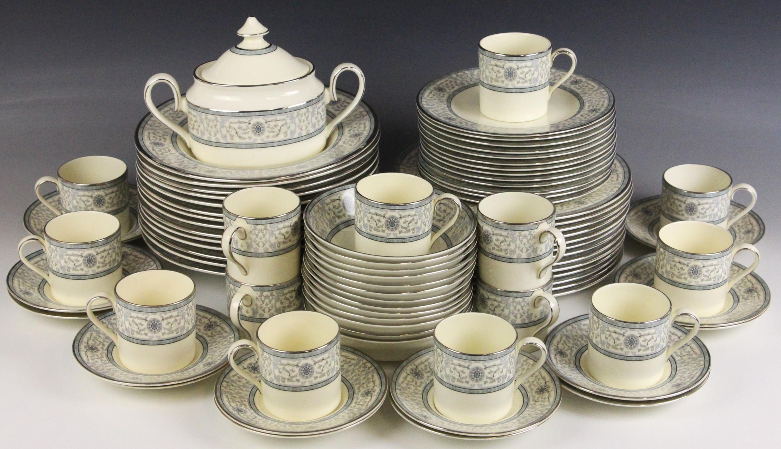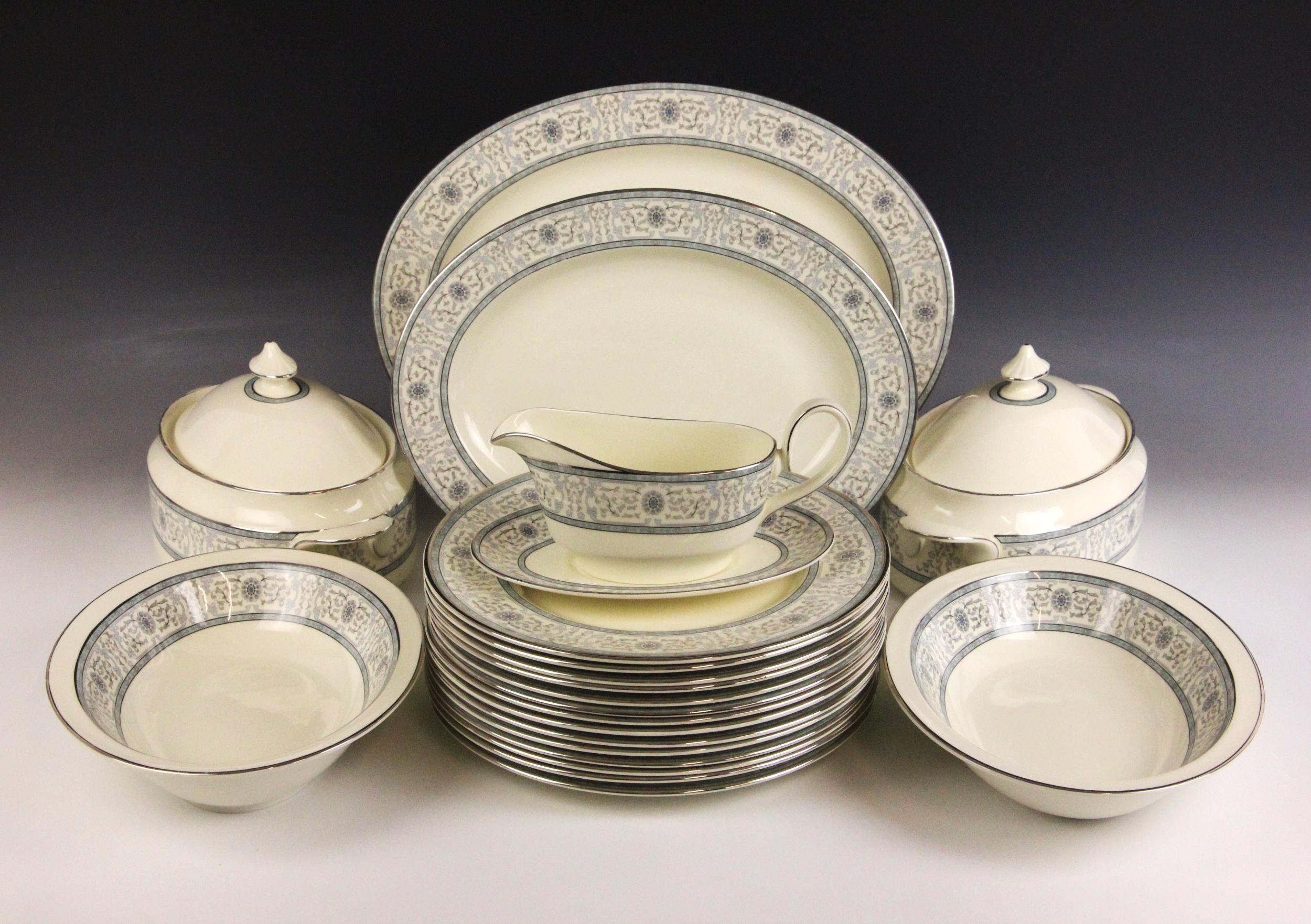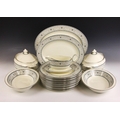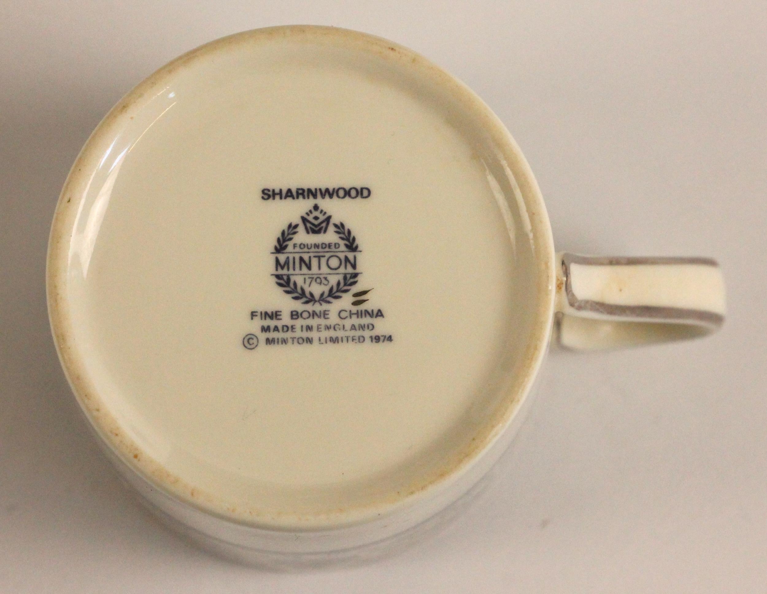 A Minton part dinner service in the 'Sharnwood' pattern, comprising: fourteen soup plates, 20.5cm diameter; thirteen salad plates, 20.5cm diameter; fourteen dinner plates, 27cm diameter; thirteen side plates, 17cm diameter; thirteen dessert bowls, 13.5cm diameter; a large meat plate, 41cm wide; and small meat plate, 34cm wide; two covered serving dishes, each 29cm wide; two open serving dishes, each 27cm wide; a sauce boat and stand; fourteen coffee cans and saucers; and a sucrier and cover; each piece with printed maker's mark (Qty)
