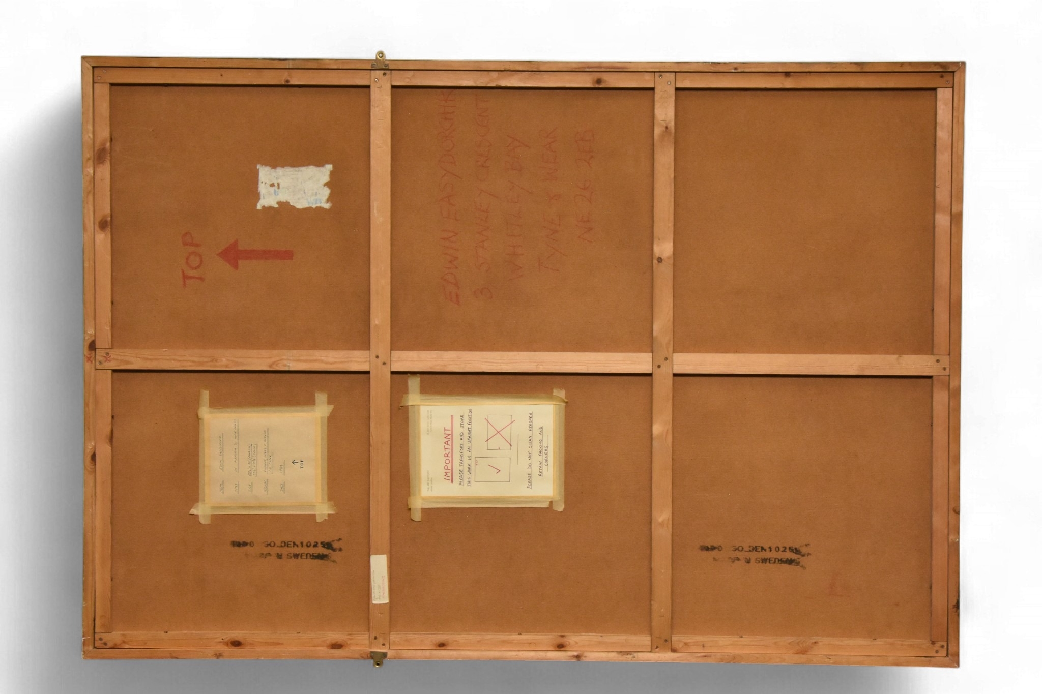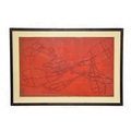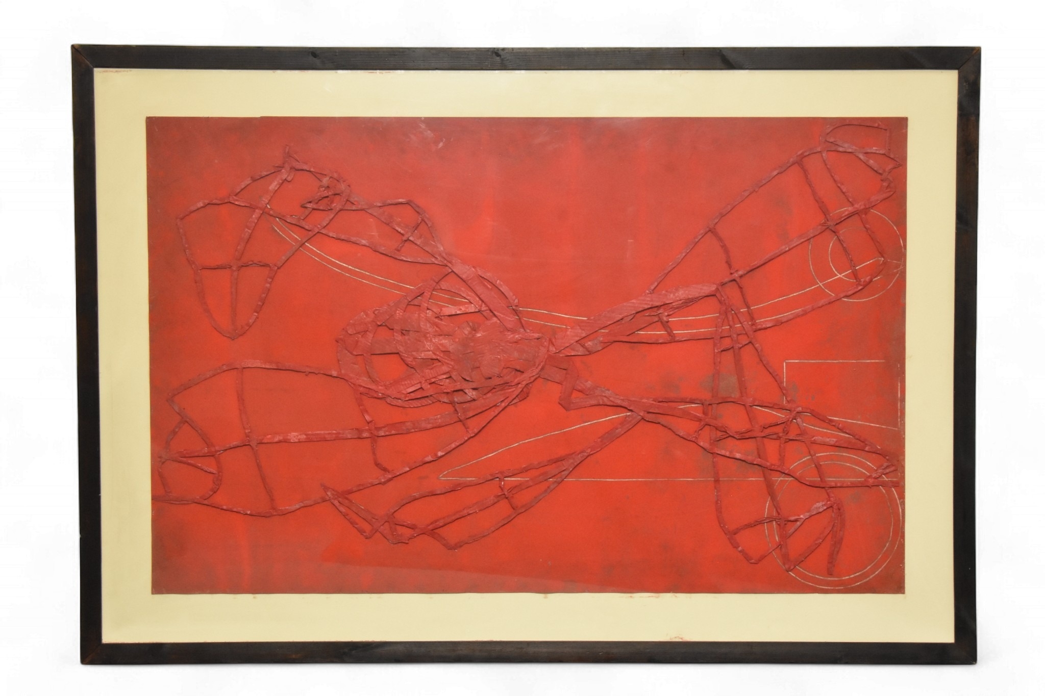 Edwin Easydorchik (b.1949) mixed media collage in red, on paper, 16 x 101cm, frame 189.5 x 130.5cm, glazed