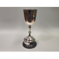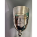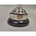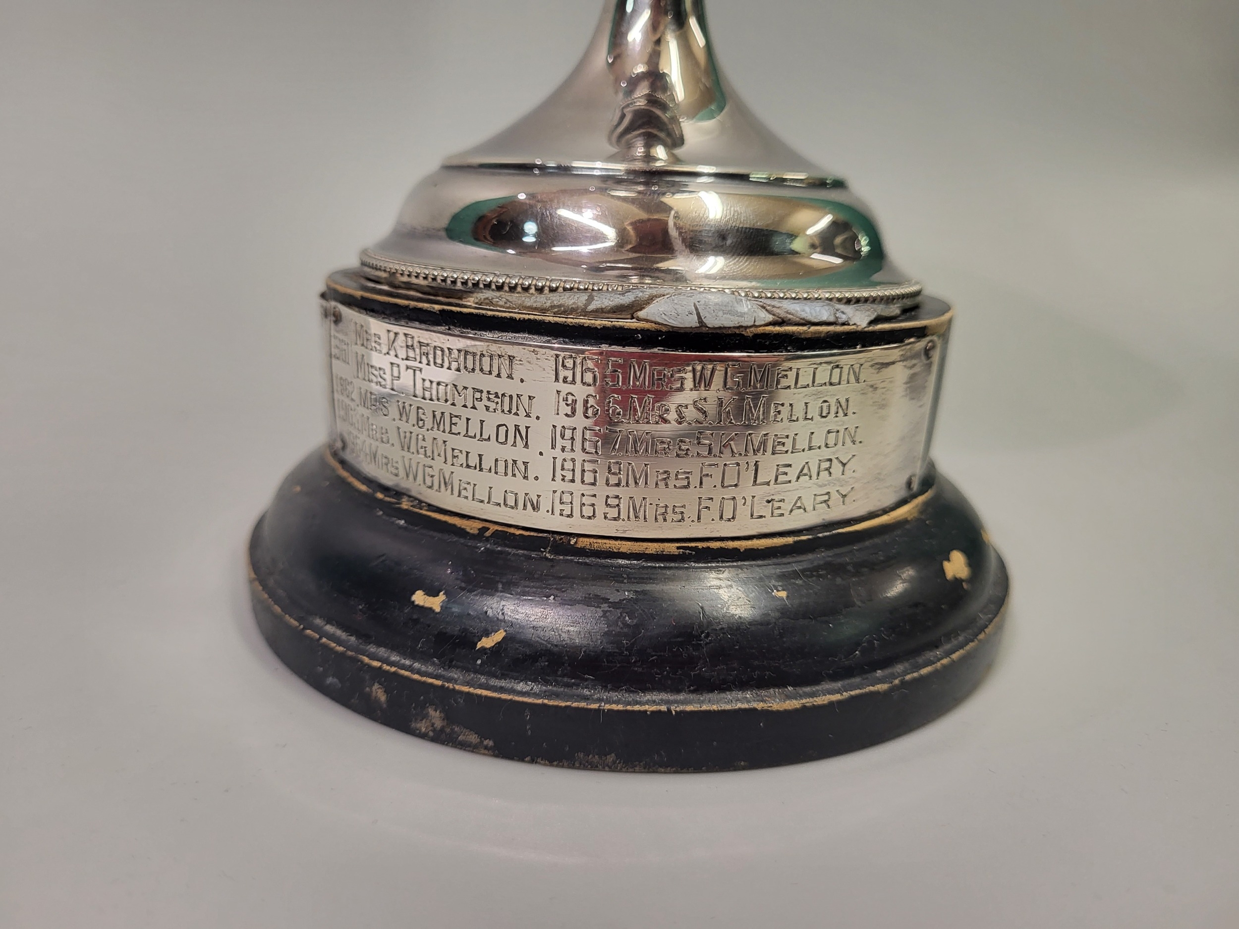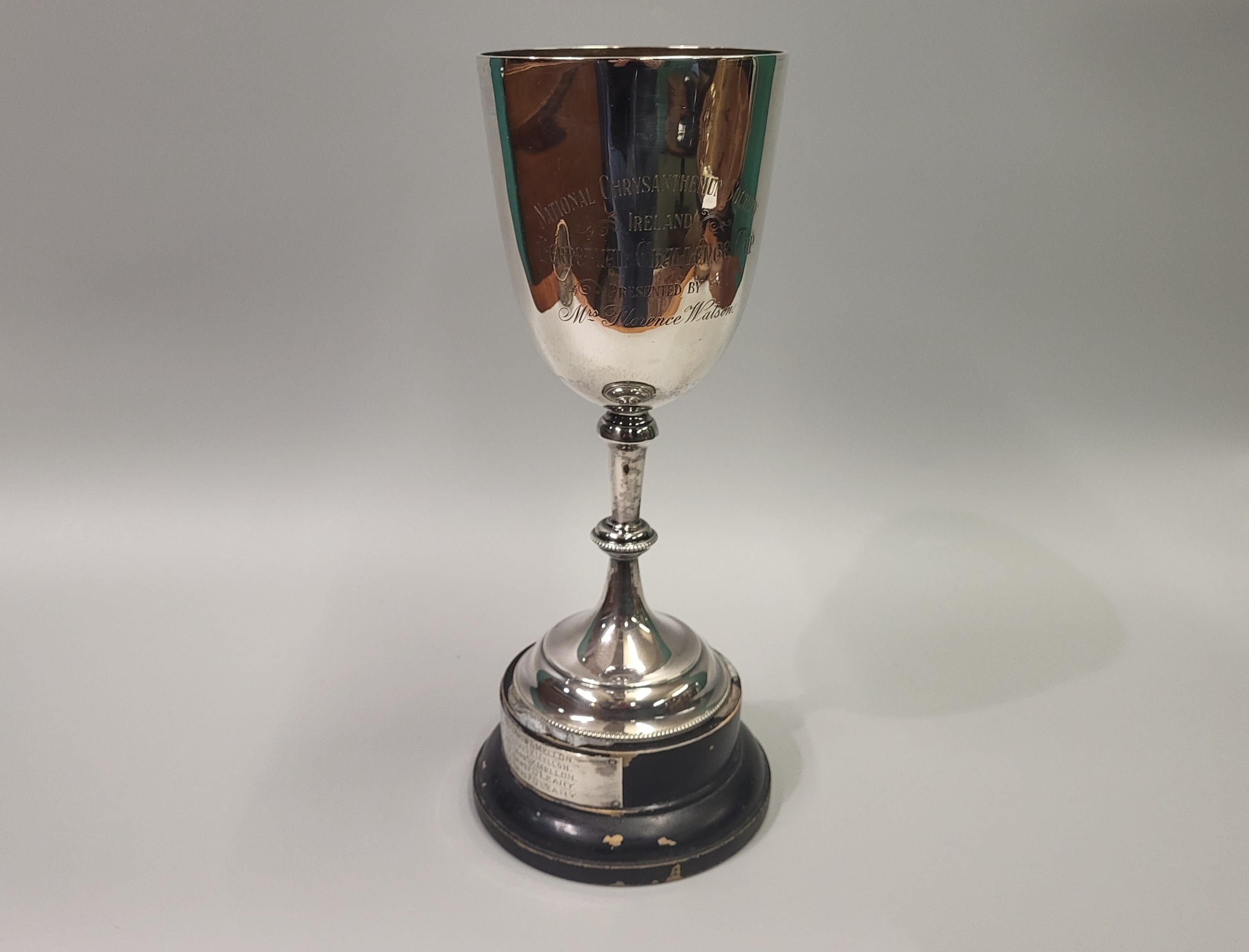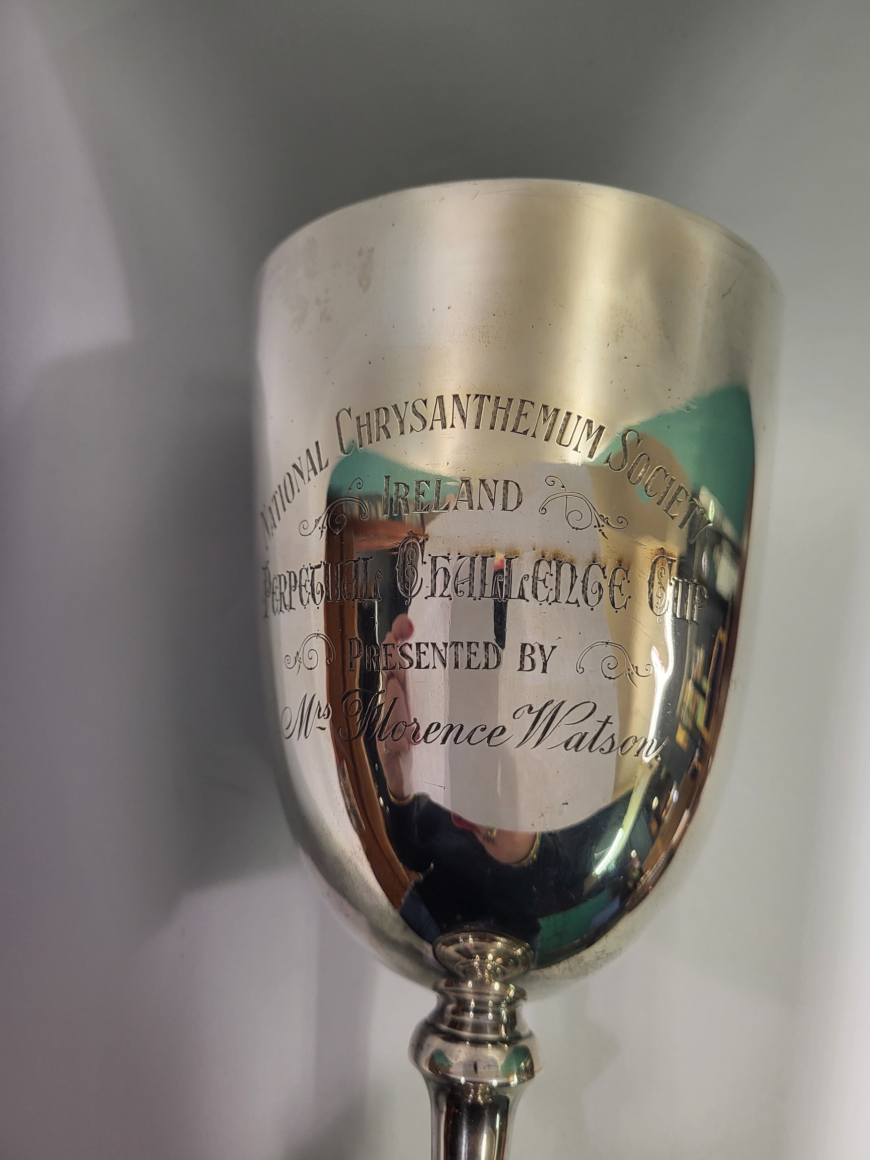 A LARGE LATE VICTORIAN ANTIQUE STERLING SILVER (.925) TROPHY, ca 12" high including base, engraved "National Chrysanthemum Society, Ireland" hallmark London 1896, perpetual challenge cup with winners plates, presented by Florence Watson from 1953-1969 on base, overall gross weight 746 g.