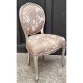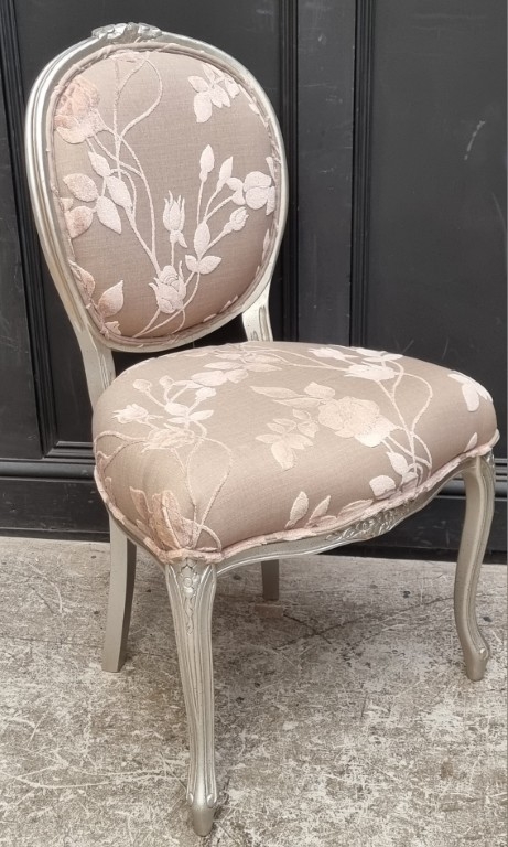A modern silvered wood and damask upholstered side chair.
