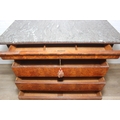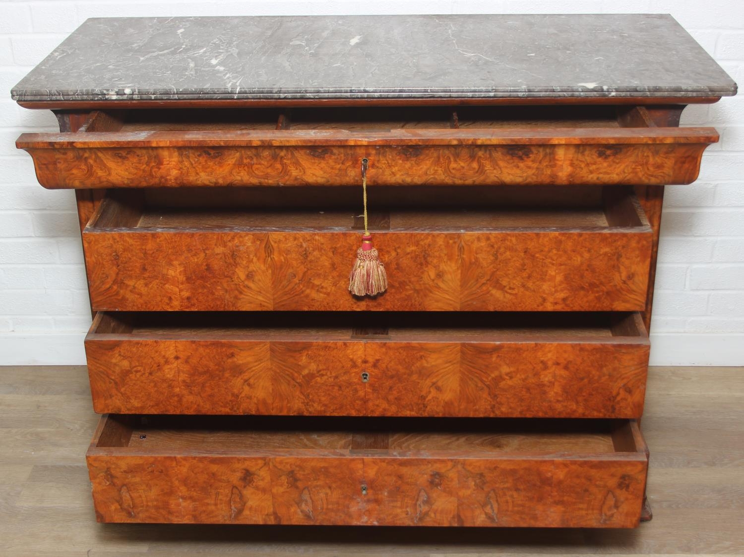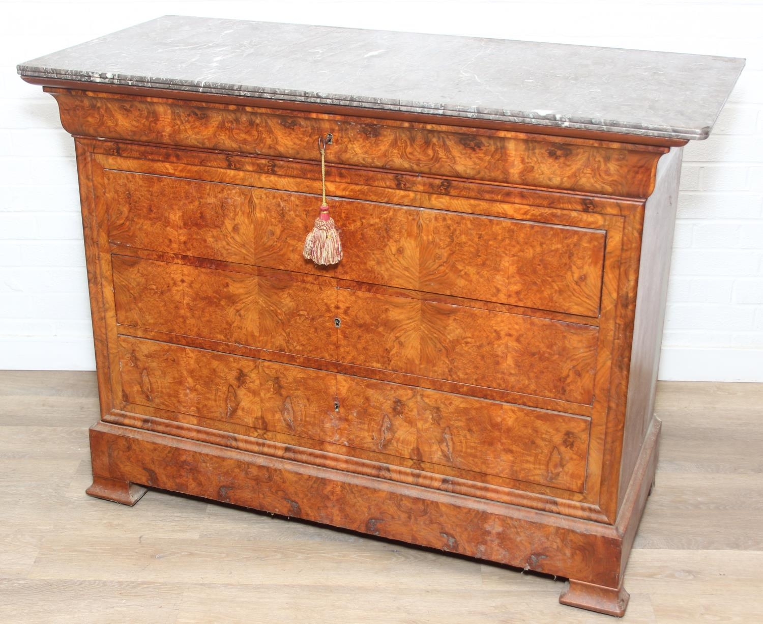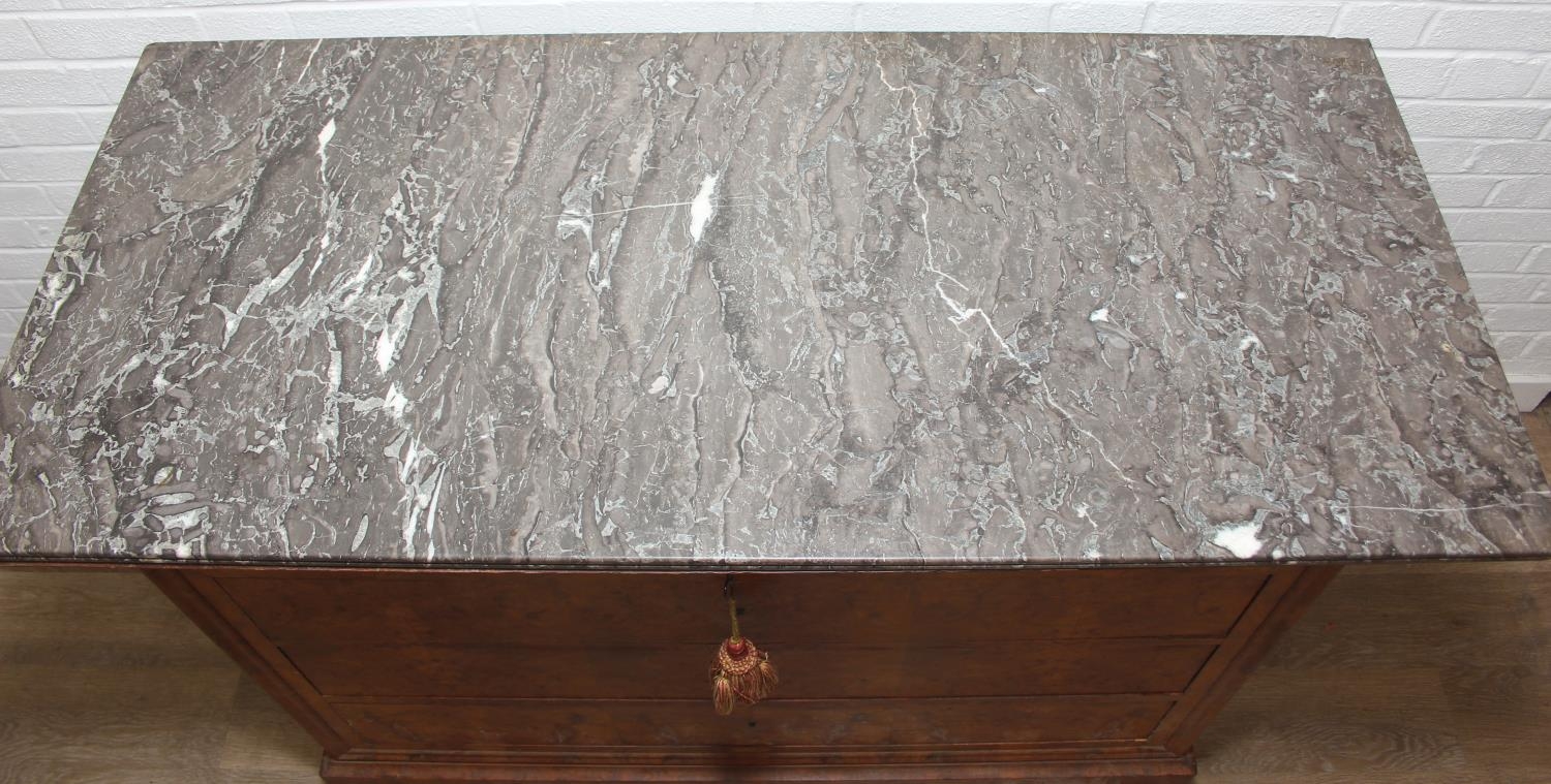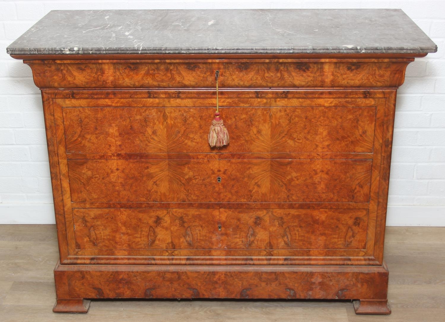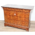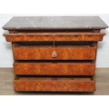 A 19th century French burr walnut four drawer chest of drawers or commode with marble top, 128cm x 58cm x 98cm