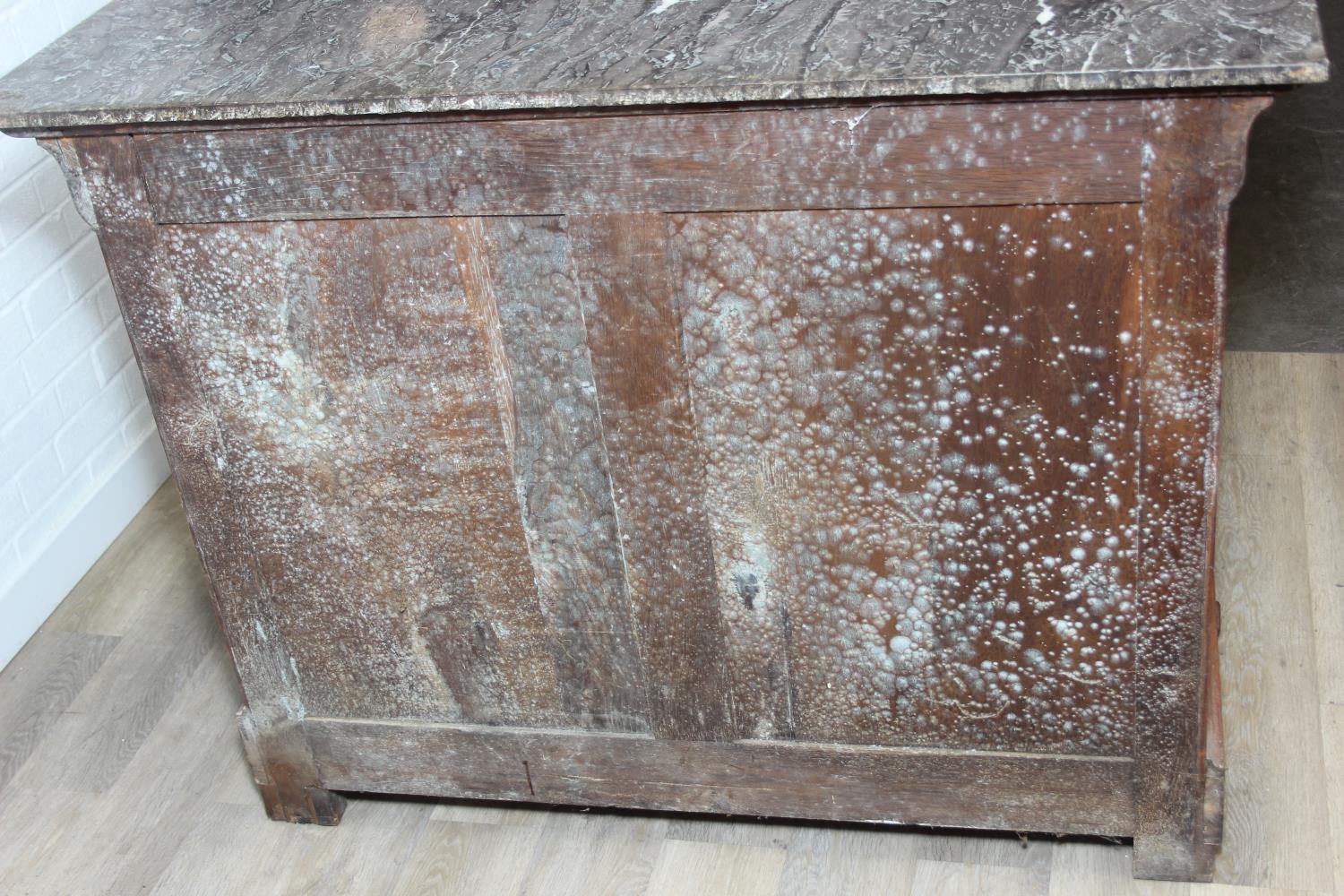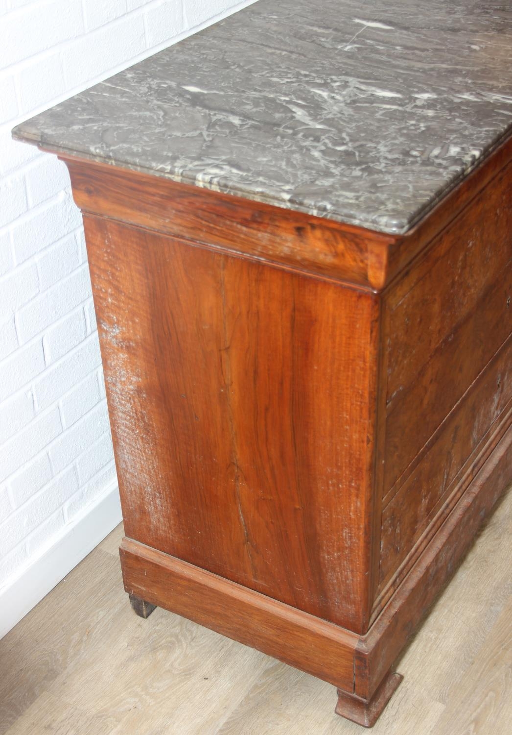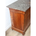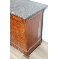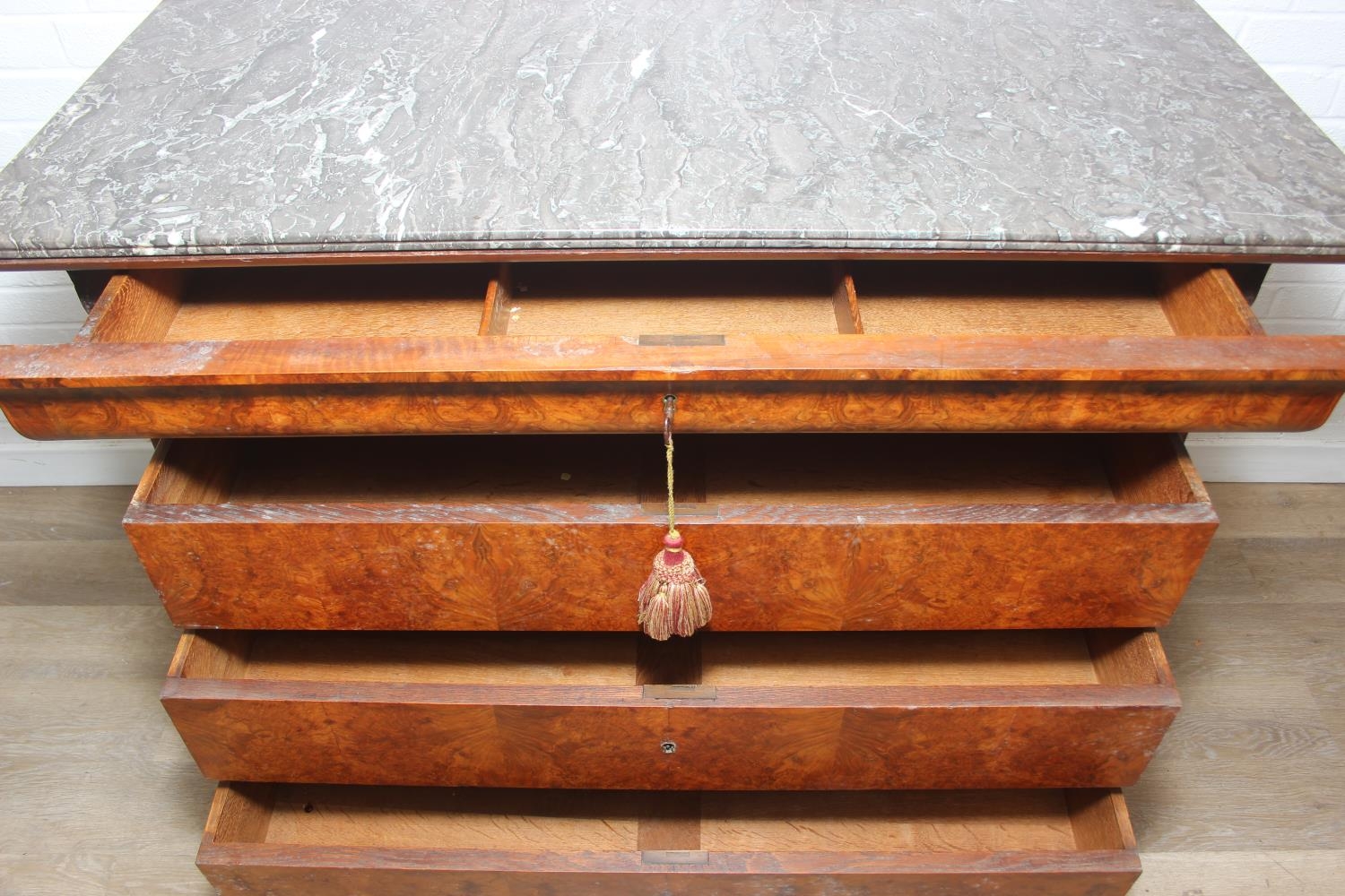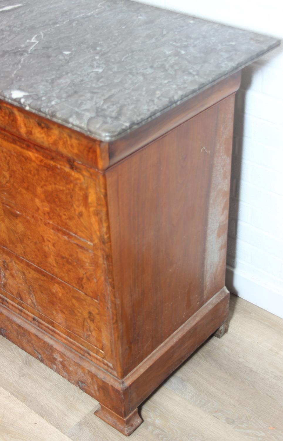 A 19th century French burr walnut four drawer chest of drawers or commode with marble top, 128cm x 58cm x 98cm