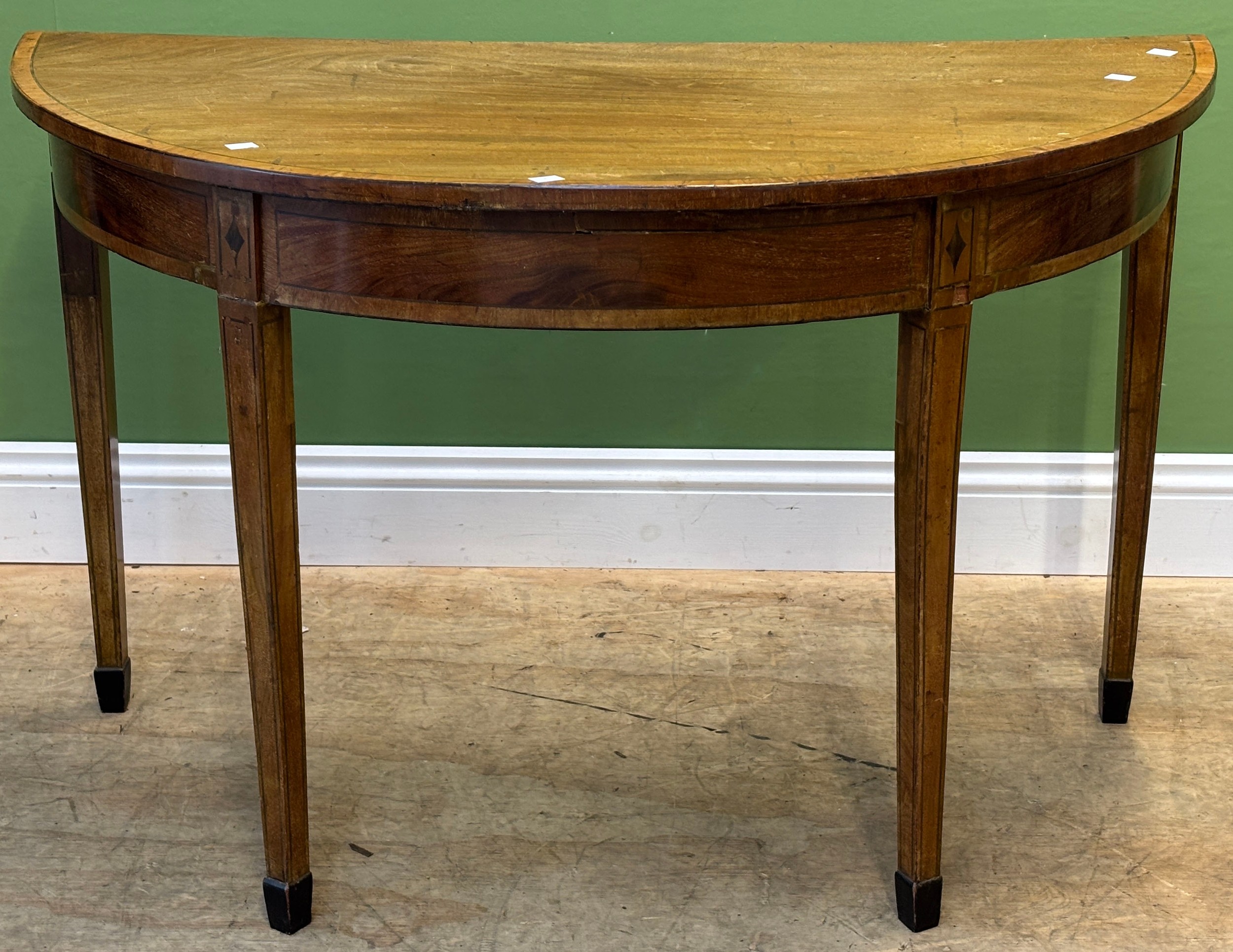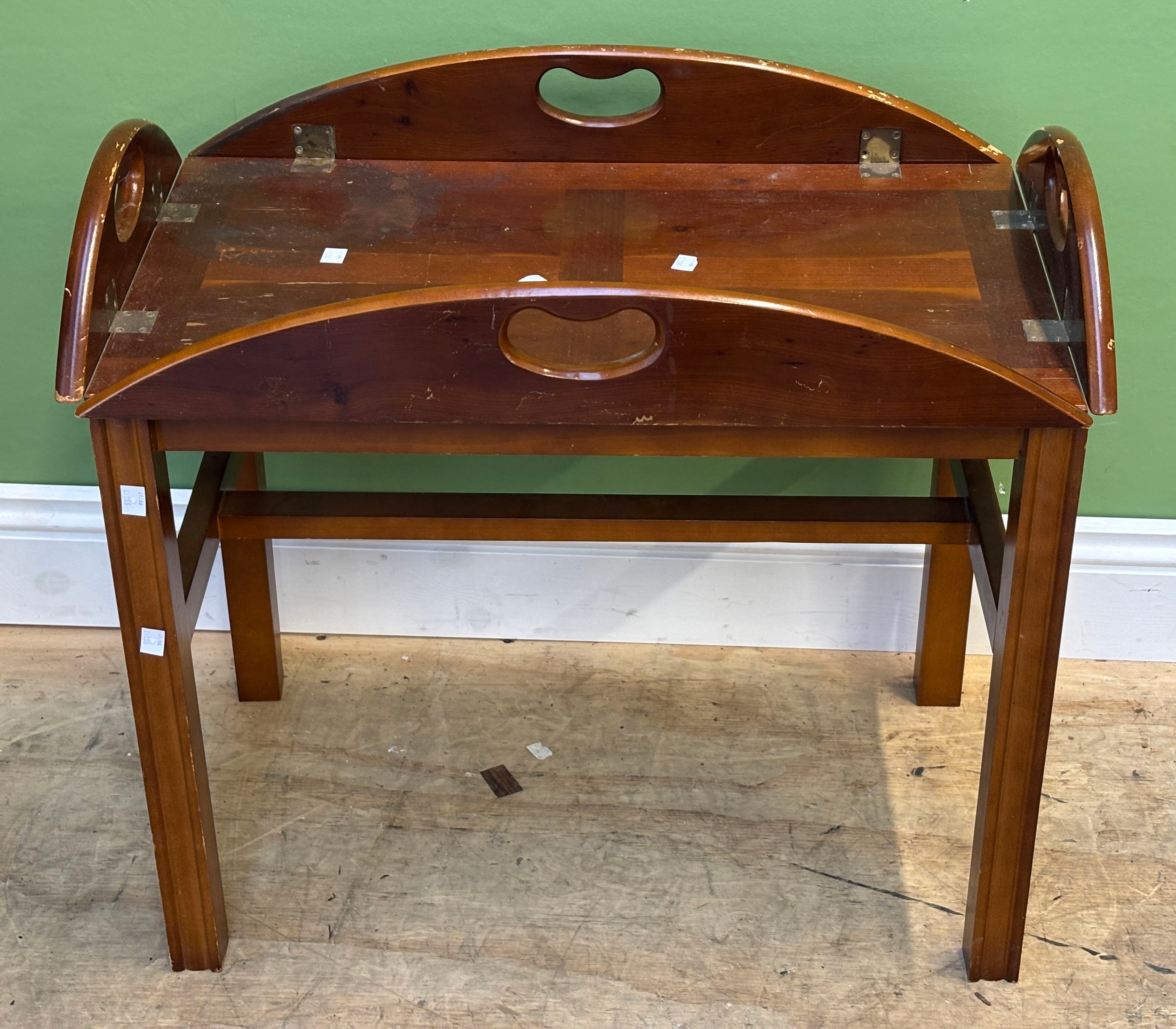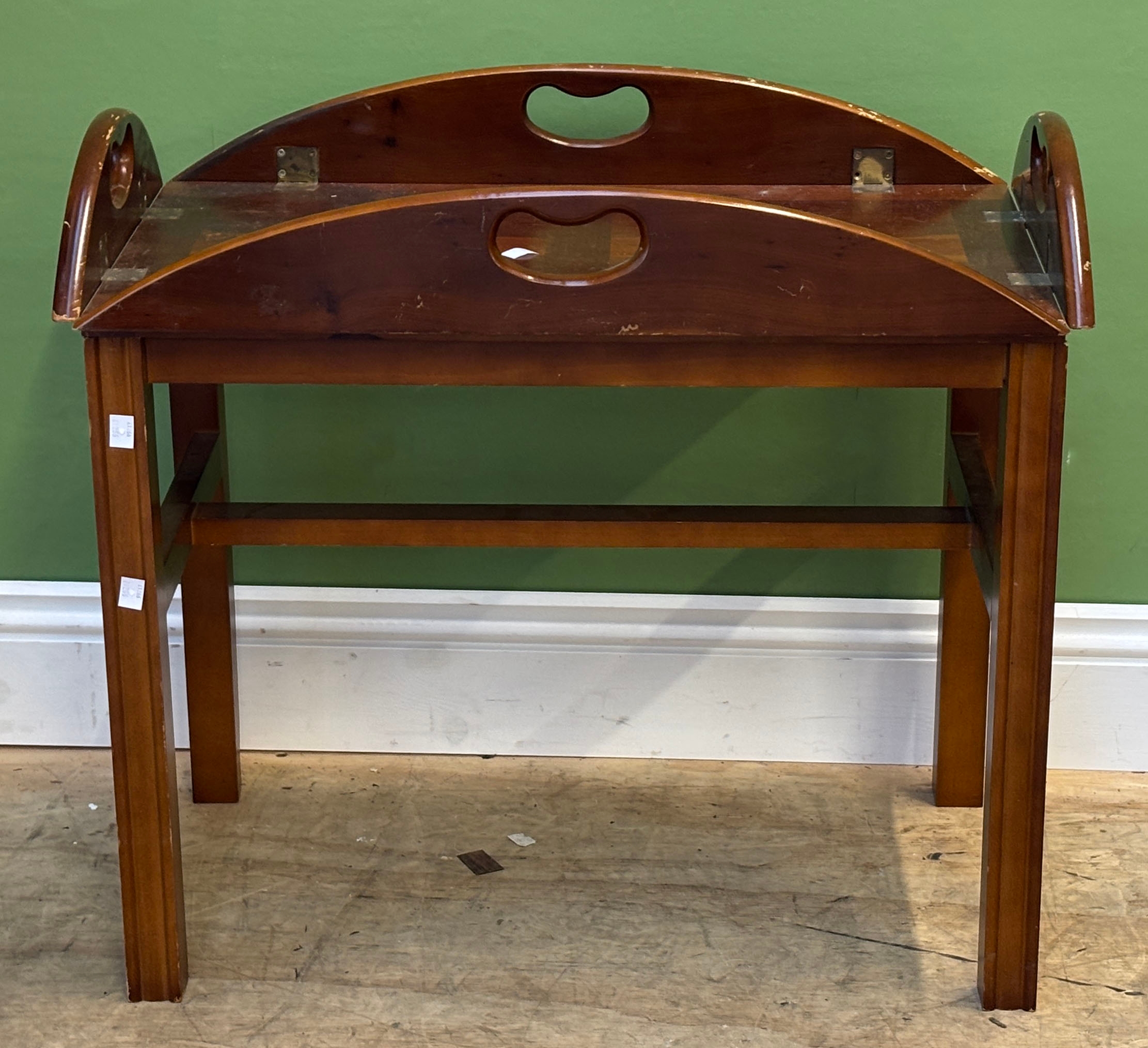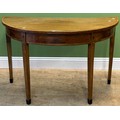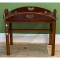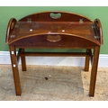 A reproduction butlers tray 71cmW; together with a George III mahogany and crossbanded demilune table, 112cmW
