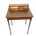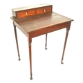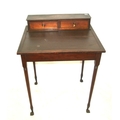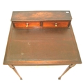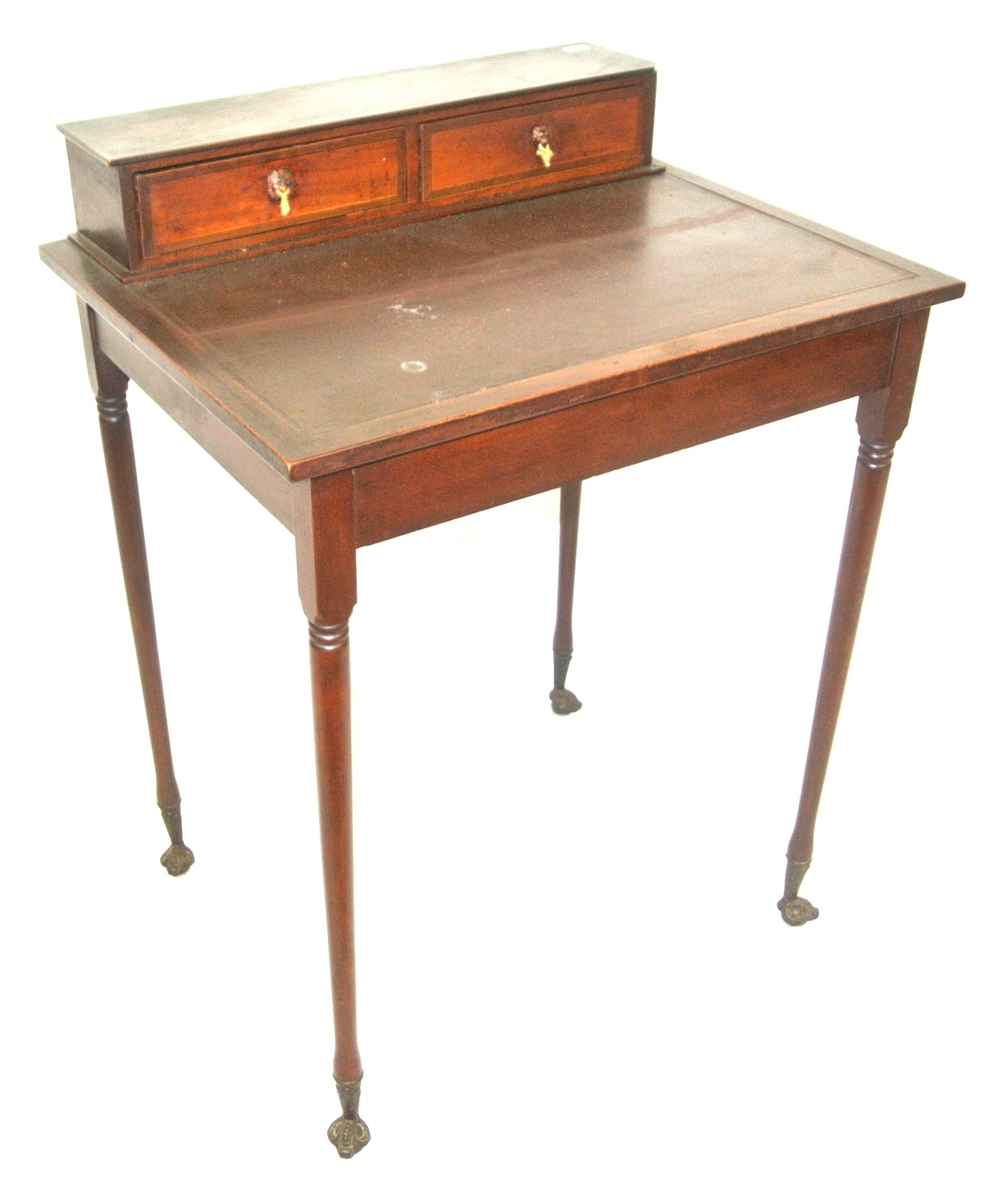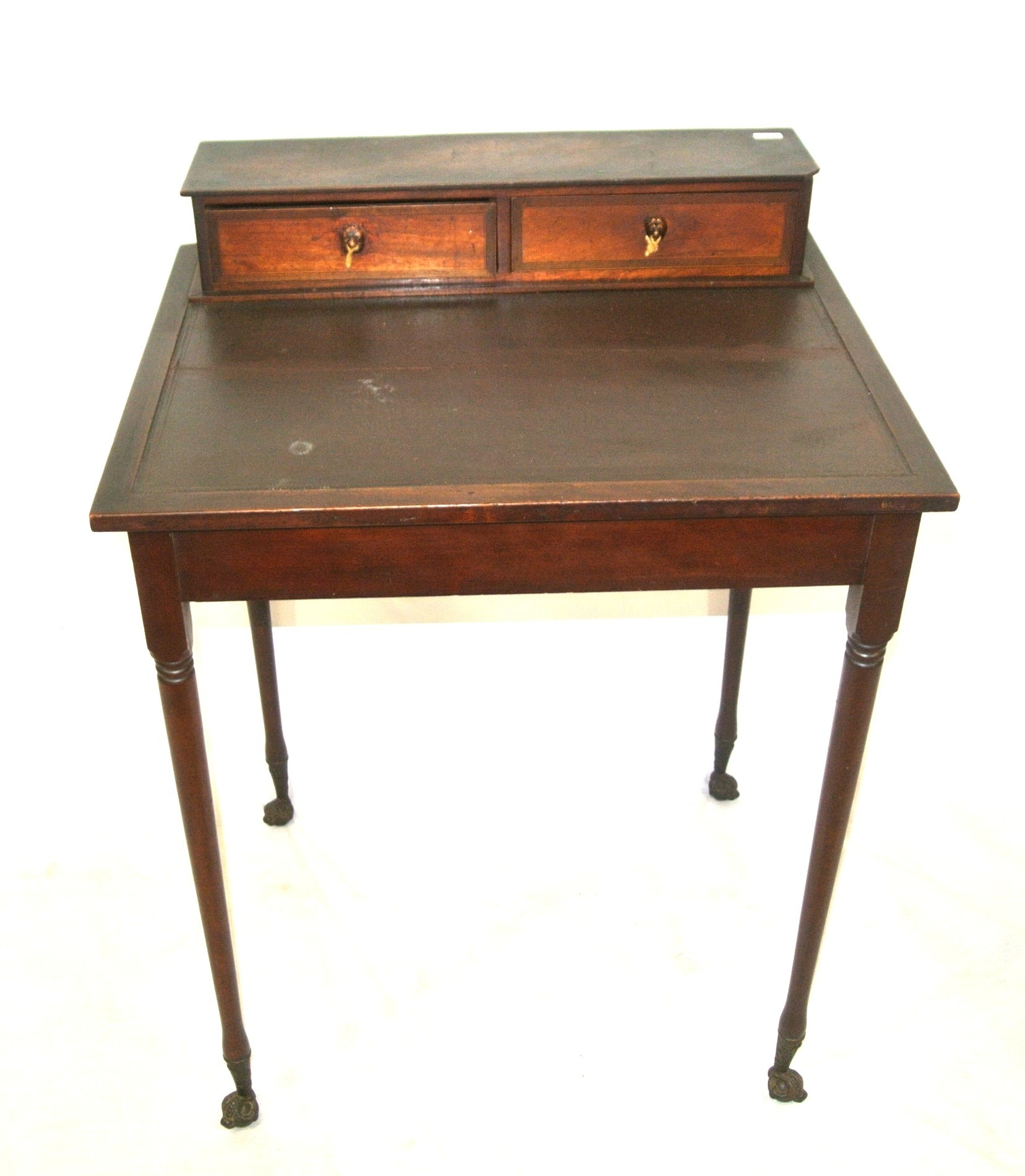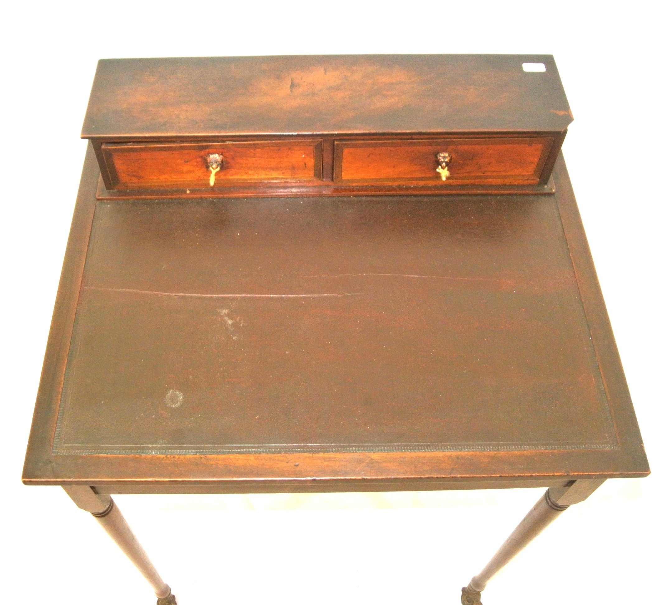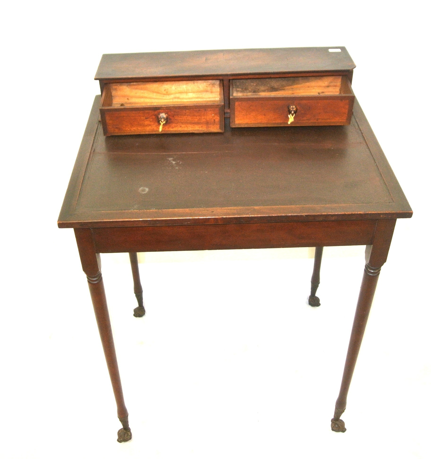 William IV mahogany bonheur de jour desk with two frieze drawers, having lionmask handles, on turned tapering legs with ornate brass feet