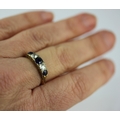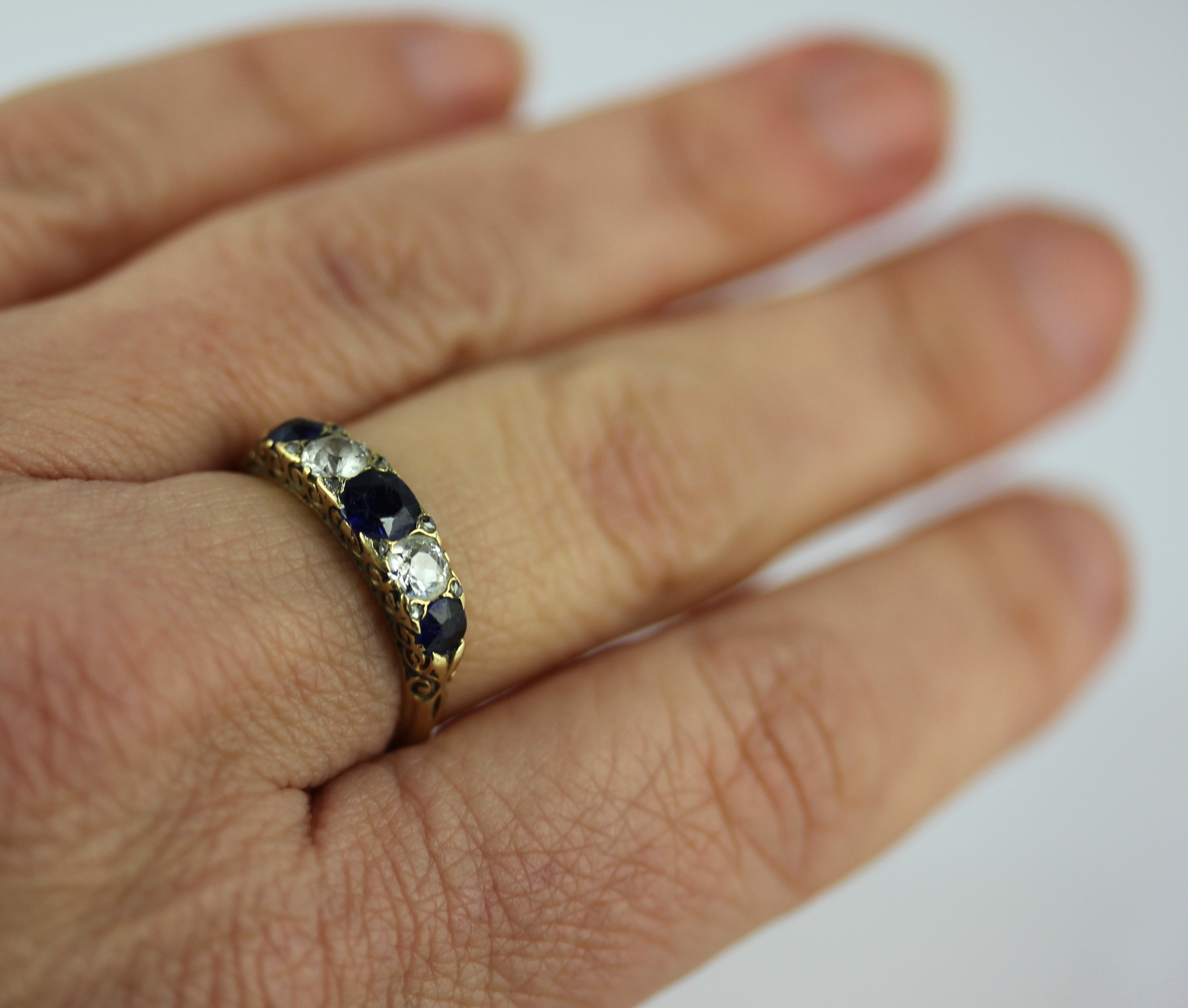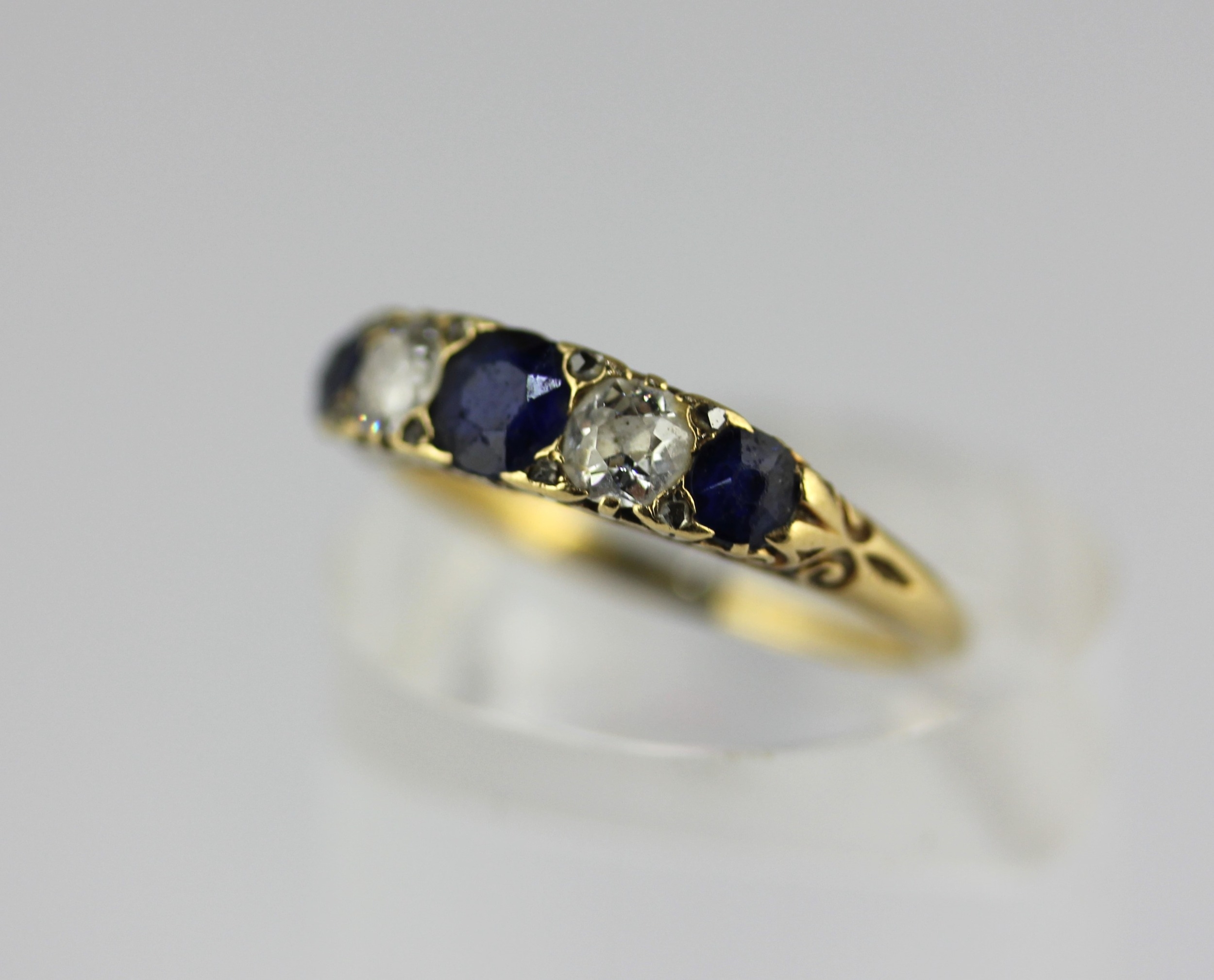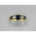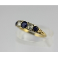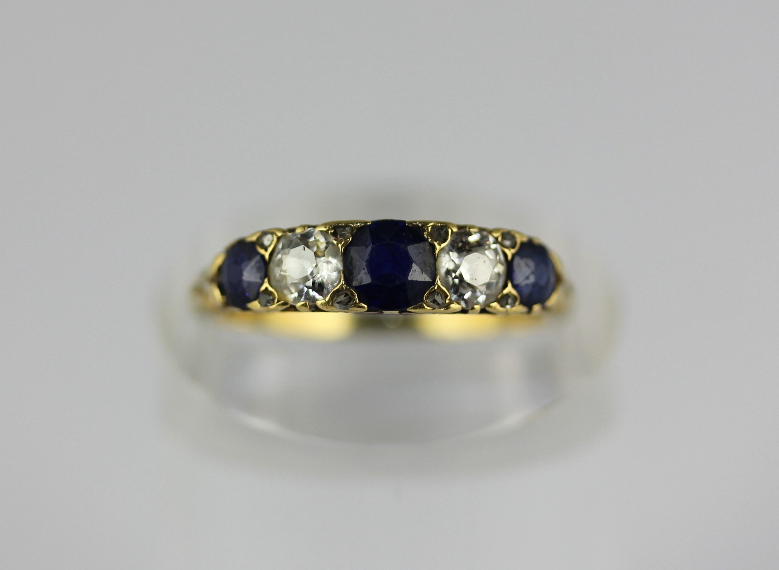 A gold, sapphire and diamond five stone ring mounted with three cushion shaped sapphires alternated with two cushion shaped diamonds and with four pairs of rose diamond points mounted at intervals, unmarked ring sizes N and a half, gross weight 2.8g