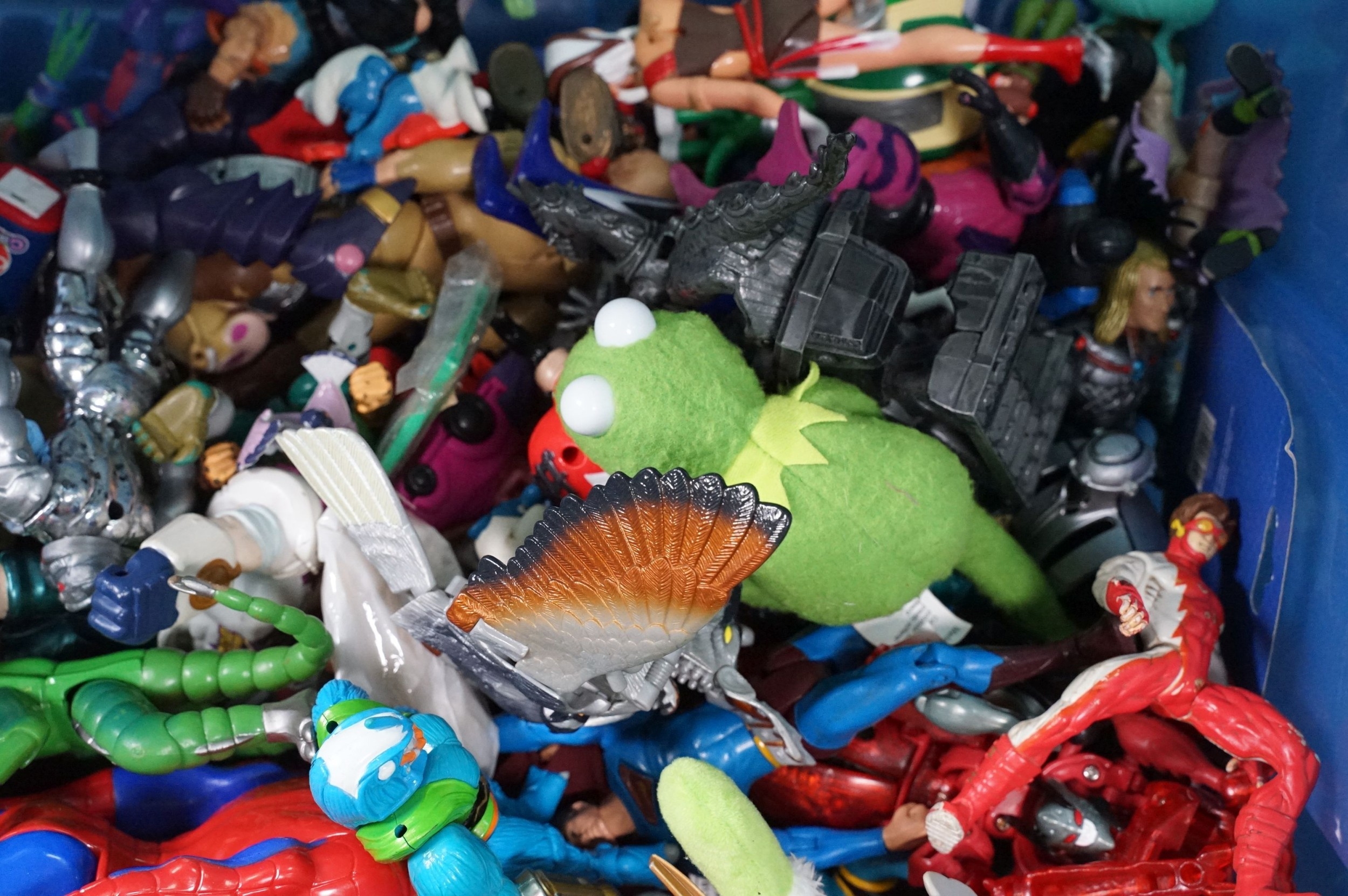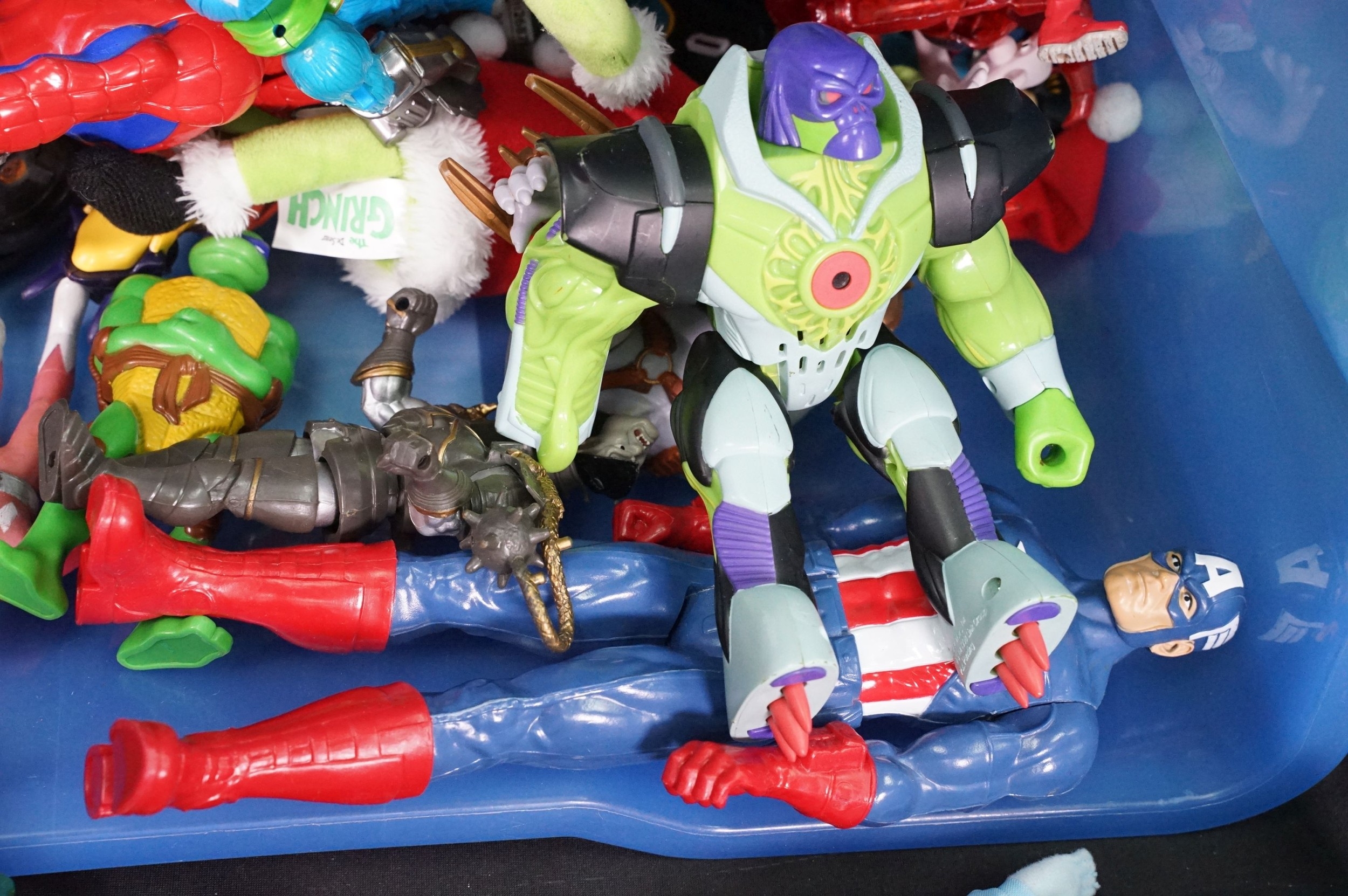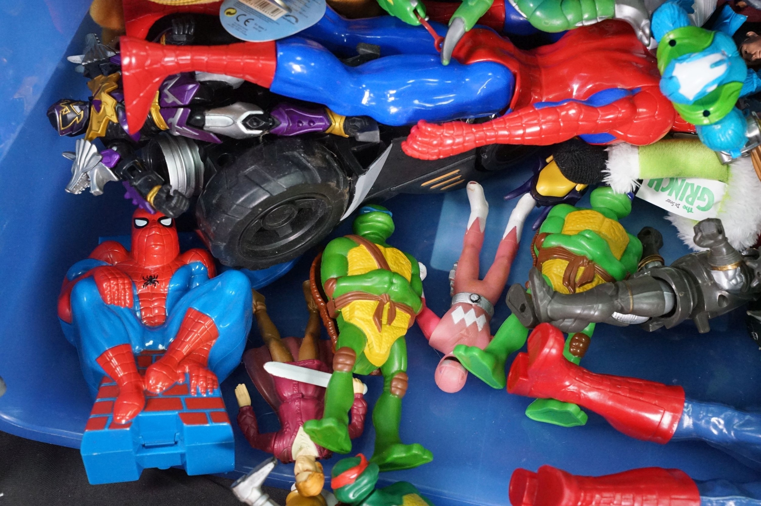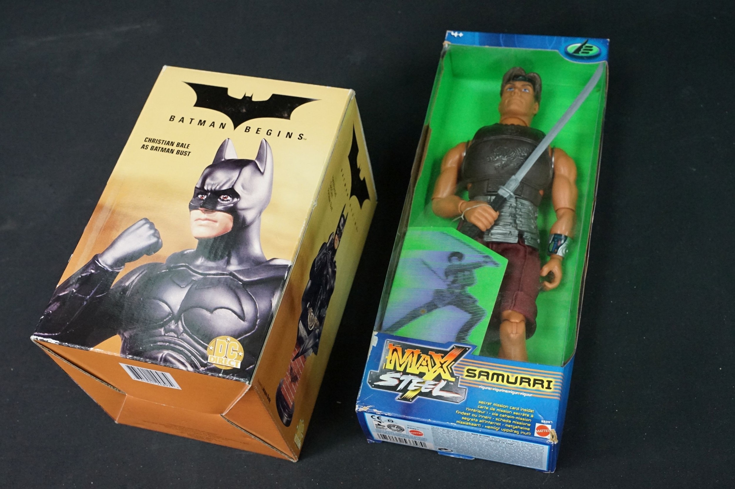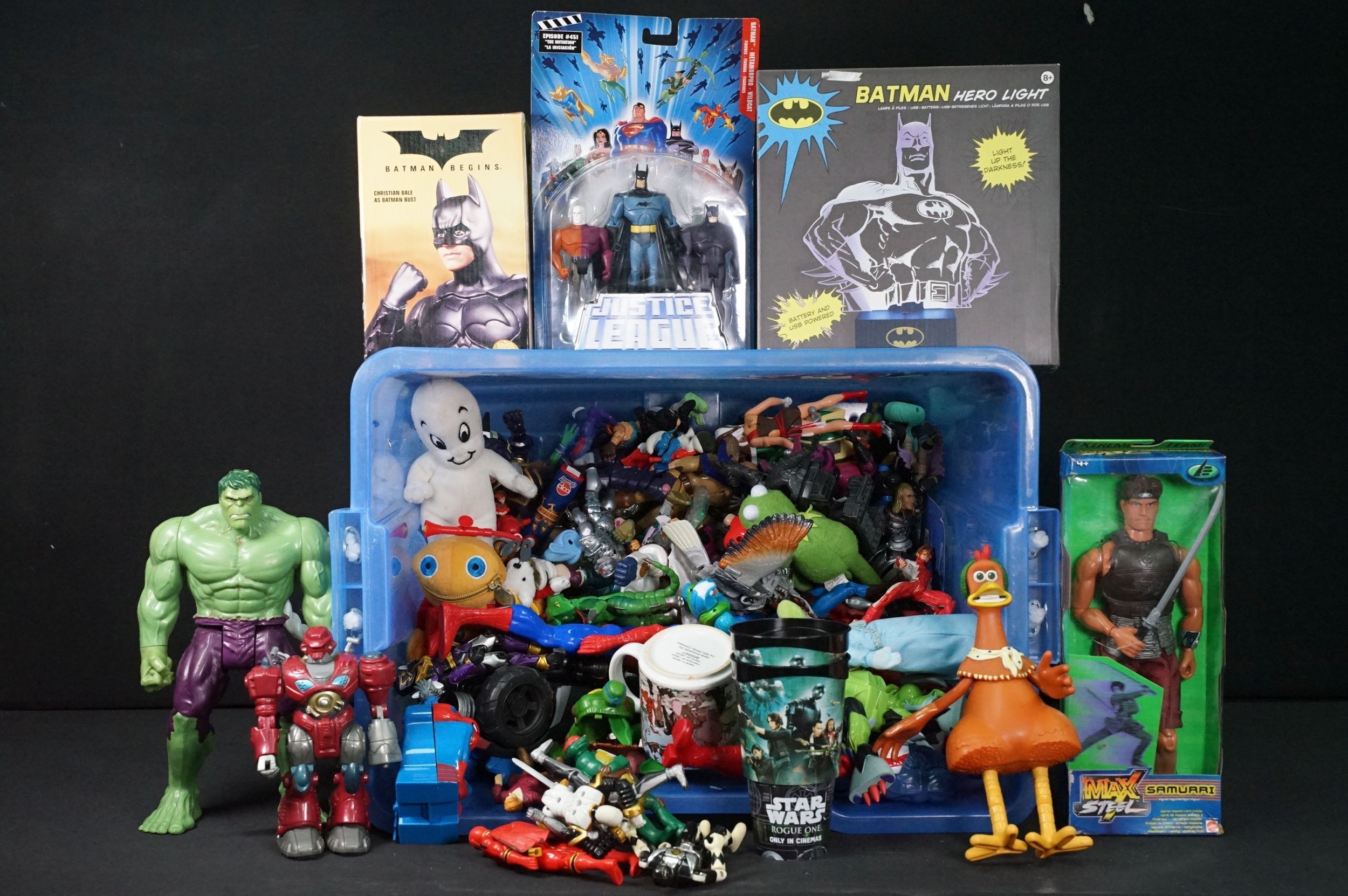 Collection of circa 1990s onwards TV / Sci Fi / Superhero related action figures to include boxed DC Direct Batman Begins Christian Bake Bust, boxed Mattel Max Steel Samurri figure, carded Mattel DC Justice League Unlimited 3 figure set, Disney figures, Teenage Mutant Ninja Turtles, Marvel etc
