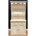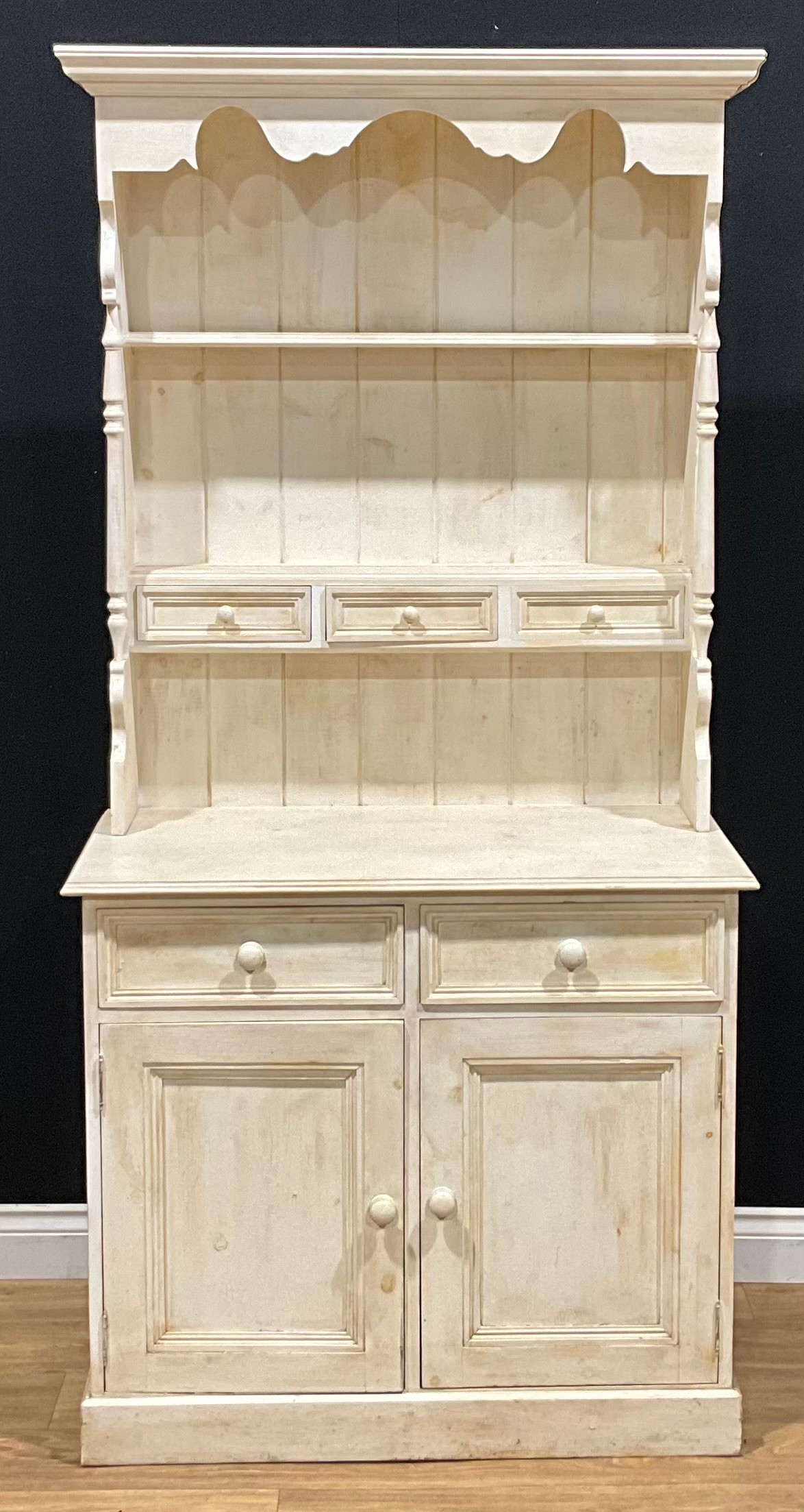 A 19th century style painted pine dresser, of narrow proportions, moulded cornice above a pair of plate rack shelves and three small drawers, the projecting base with a pair of frieze drawers above two panel doors, 188cm high, 94.5cm wide, 47.5cm deep