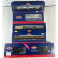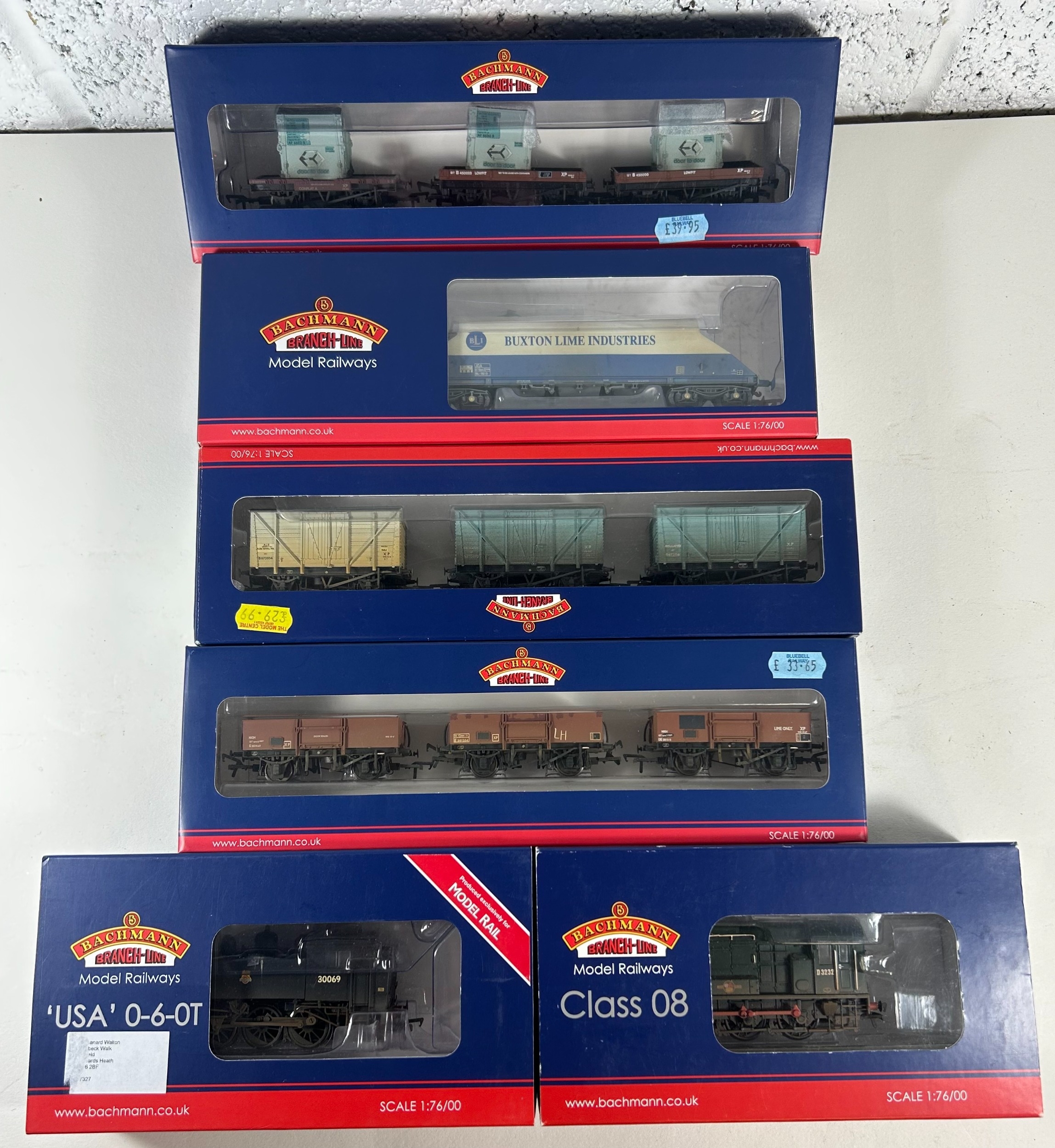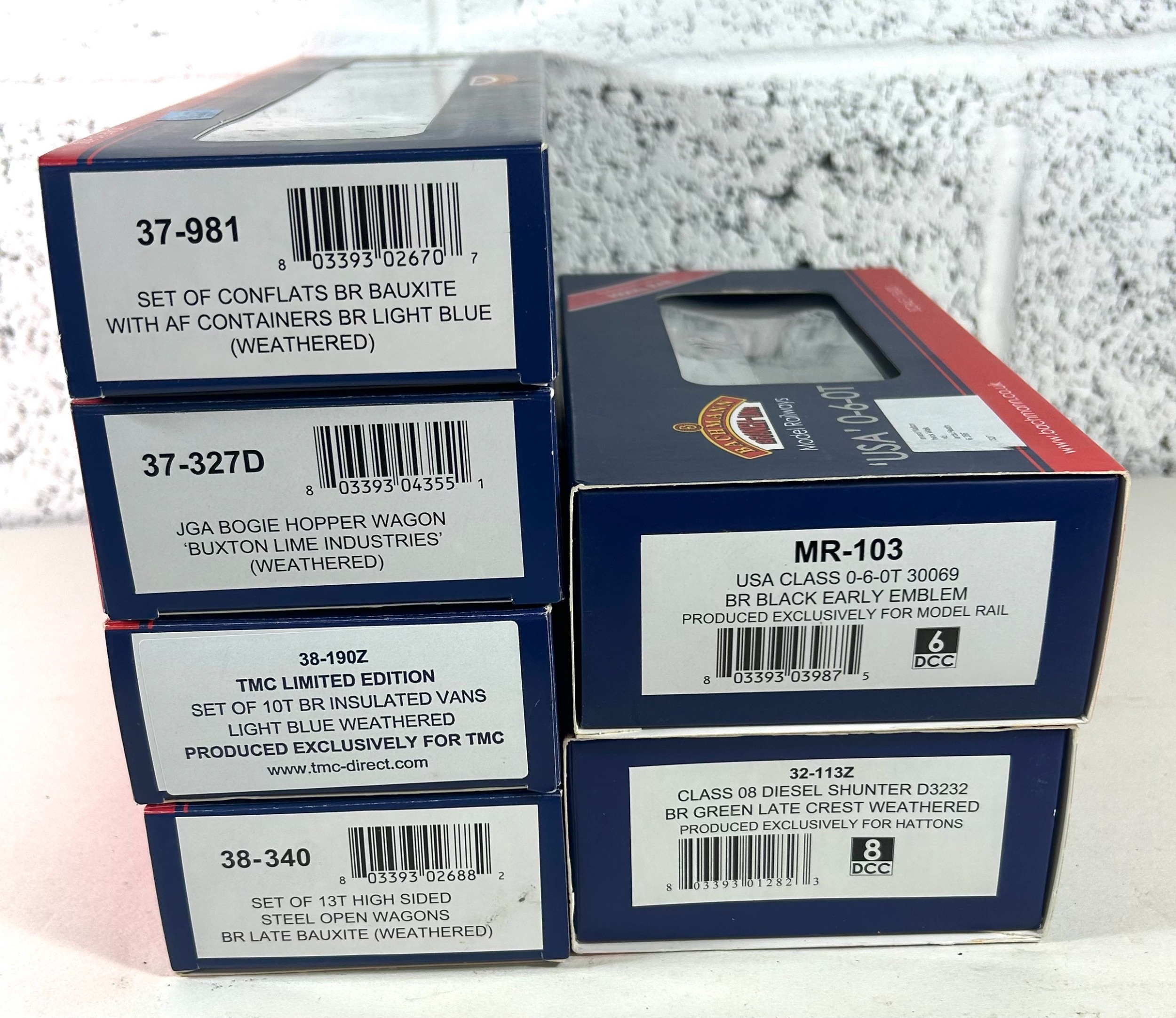 Bachmann Branch-Line OO Railway. 2 Locomotives - a USA Class 0-6-0 Tank 30069 (MR-103) in BR black with early crest, produced for Model Rail. Plus Class 08 Diesel Shunter D3232 (32-113Z). In BR Green, late crest weathered, produced for Hattons. Plus 3x3 wagon sets - 13T High Sided Steel Open Wagons, 10T BR Insulated Vans and BR Conflats with Containers. Plus a JGA Bogie Hopper Wagon, Buxton Lime. All weathered. All boxed. Contents looks to be as new.