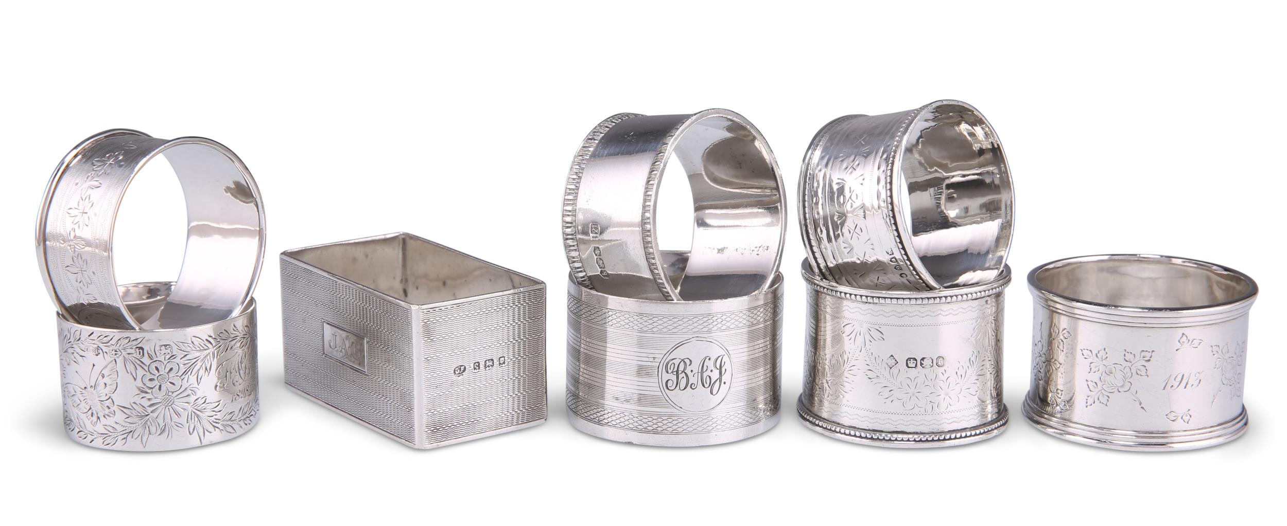 EIGHT ASSORTED SILVER NAPKIN RINGS, VICTORIAN AND LATER, including one by Ackroyd Rhodes, Manoah Rhodes & Sons Ltd, Sheffield 1911, circular, engraved with sprays of flowerheads and leaves, further engraved with monogram and '1913';Êanother by David Landsborough Fullerton, London 1931,Êrectangular, with all-over engine-turned engraving, the rectangular reserve to the front engraved with initials 'J.A.G.';Êetc. (8)ÊRectangular example 3.1cm high, 5.8cm wide, 3.2cm deep, 7.8 troy ounces gross