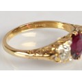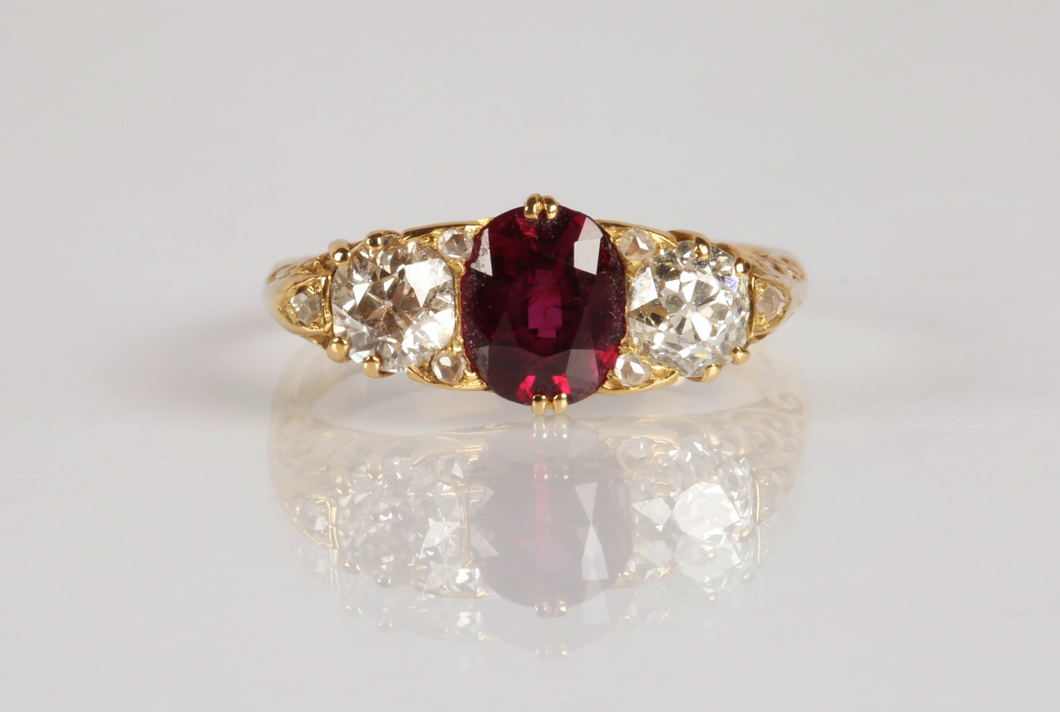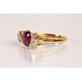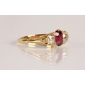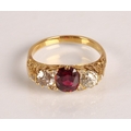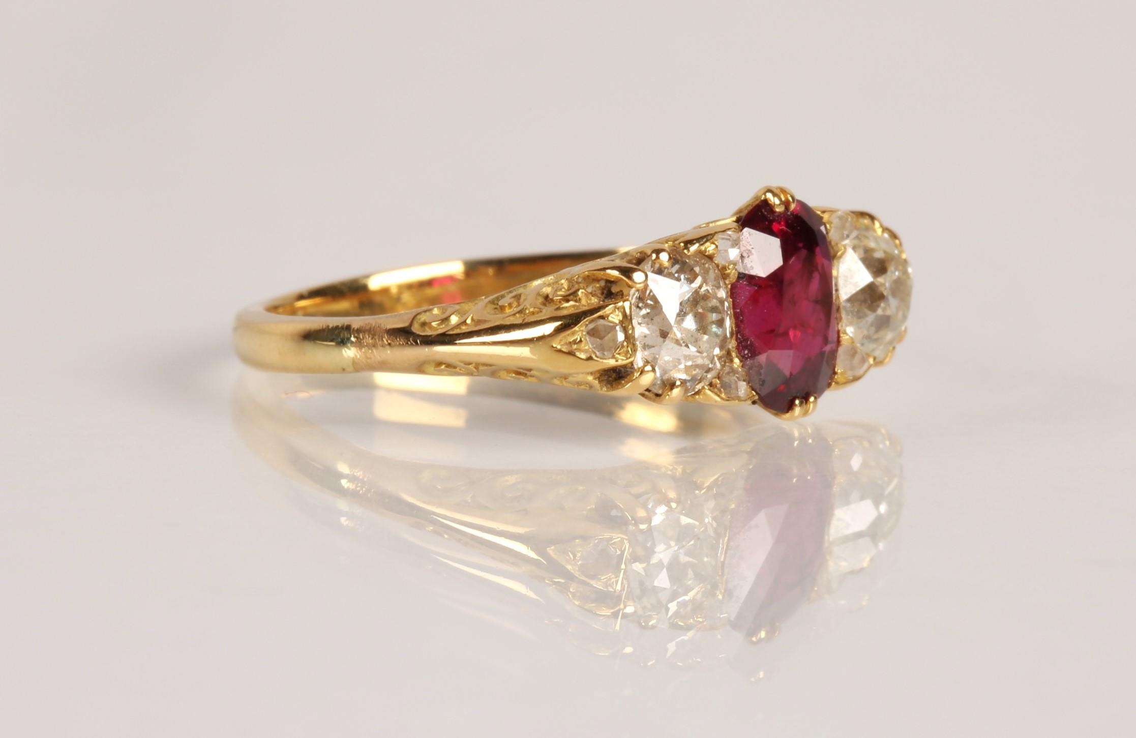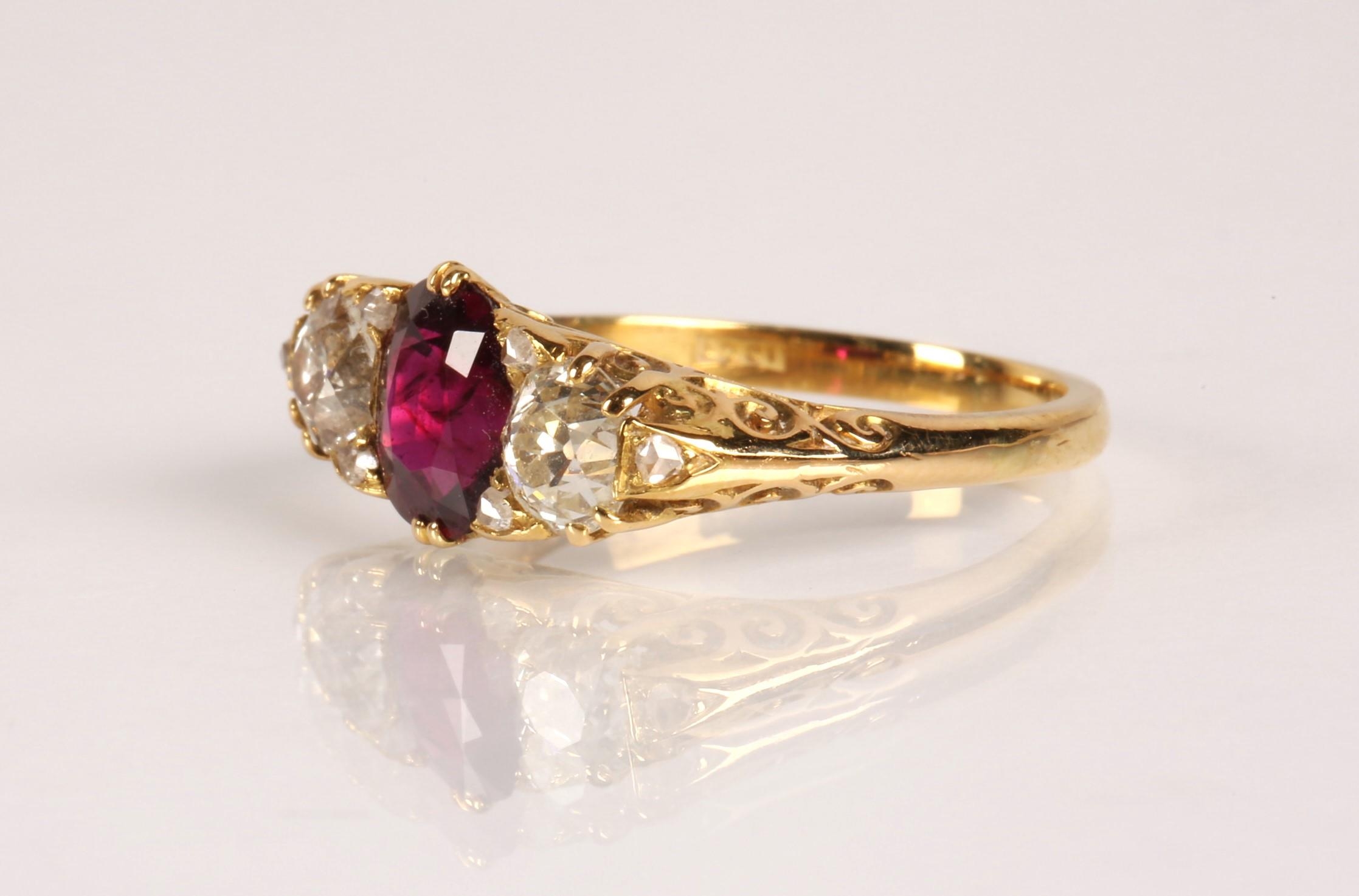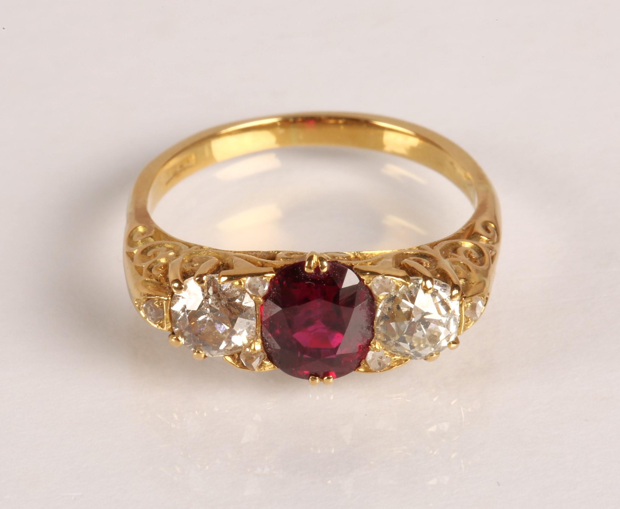 Ruby & Diamond 18ct yellow gold three stone ring, central oval ruby flanked by two old cut diamonds 0.33 each set in a scroll mount with six small diamonds, on 18ct yellow gold shank, ring size P