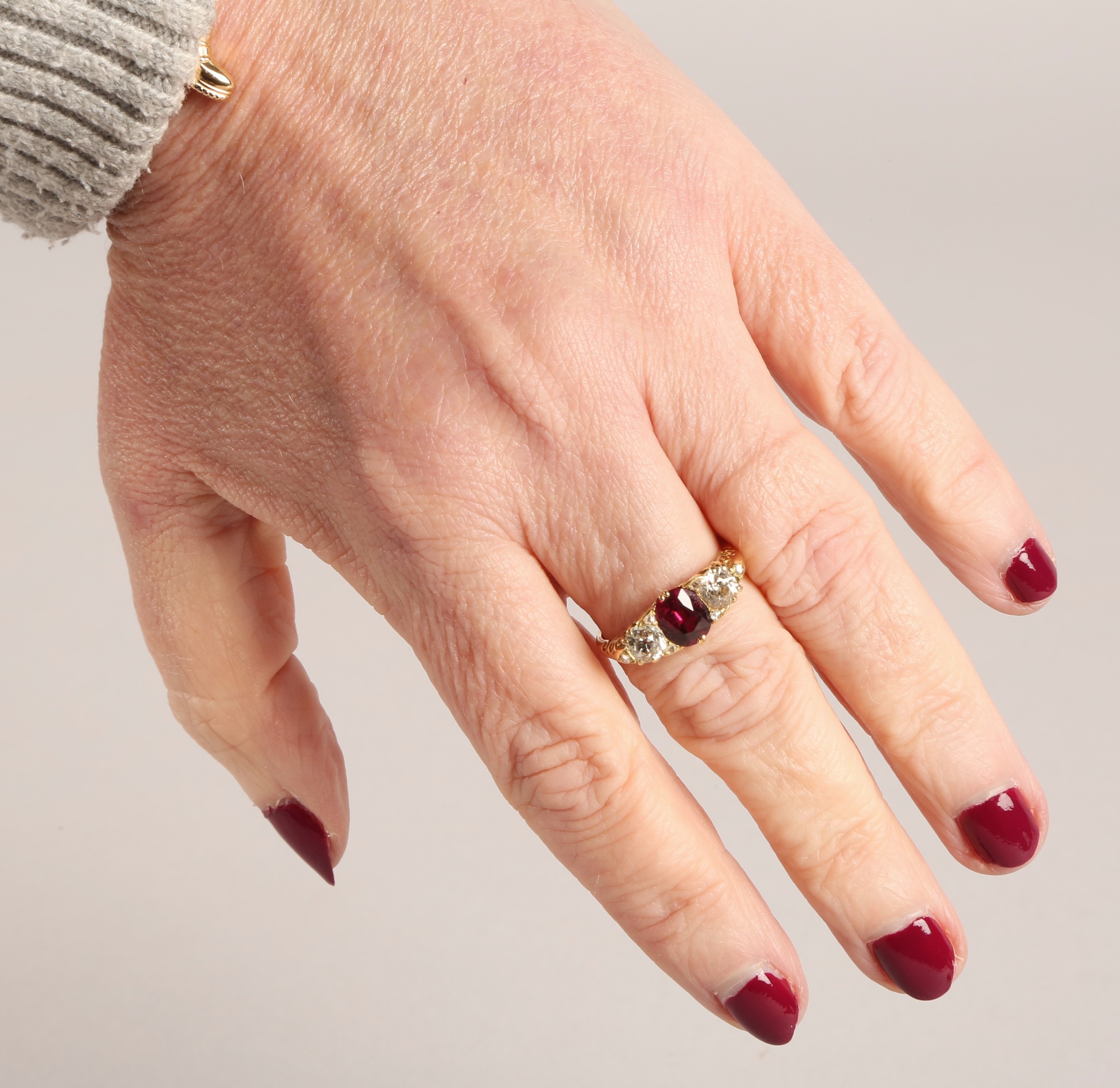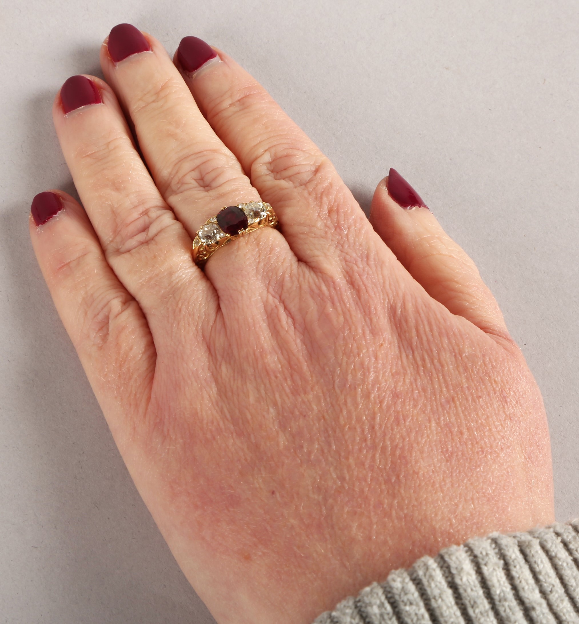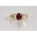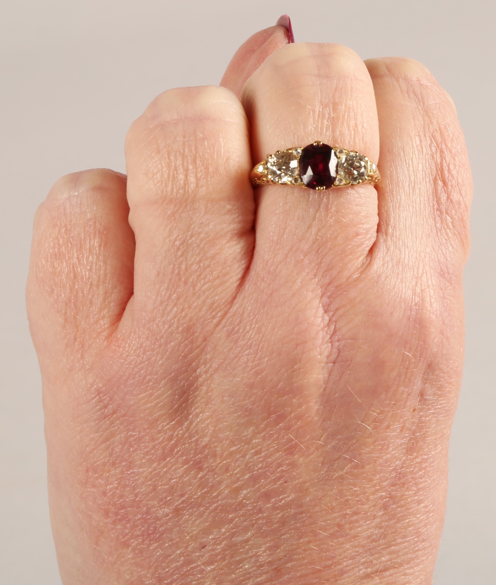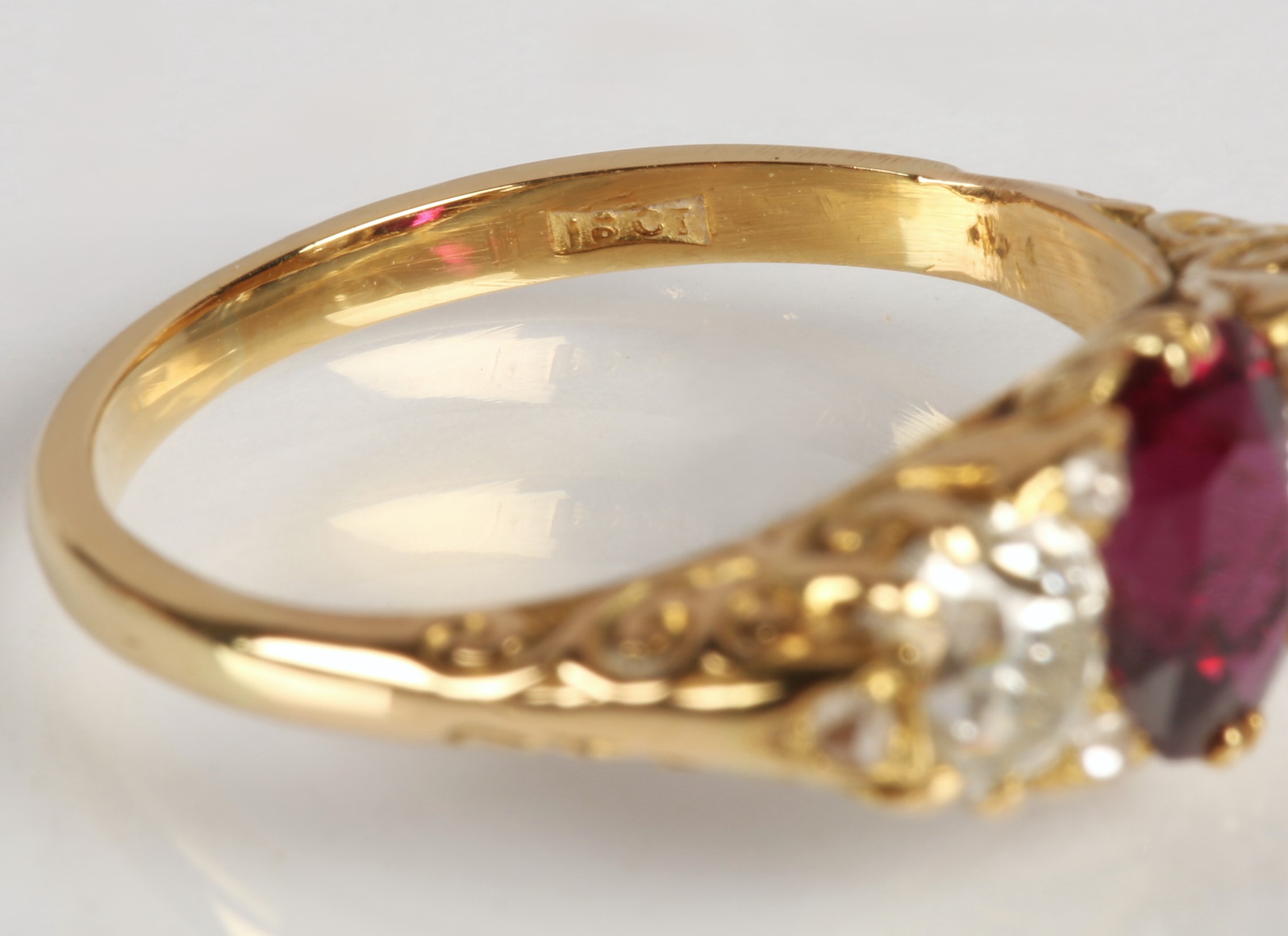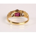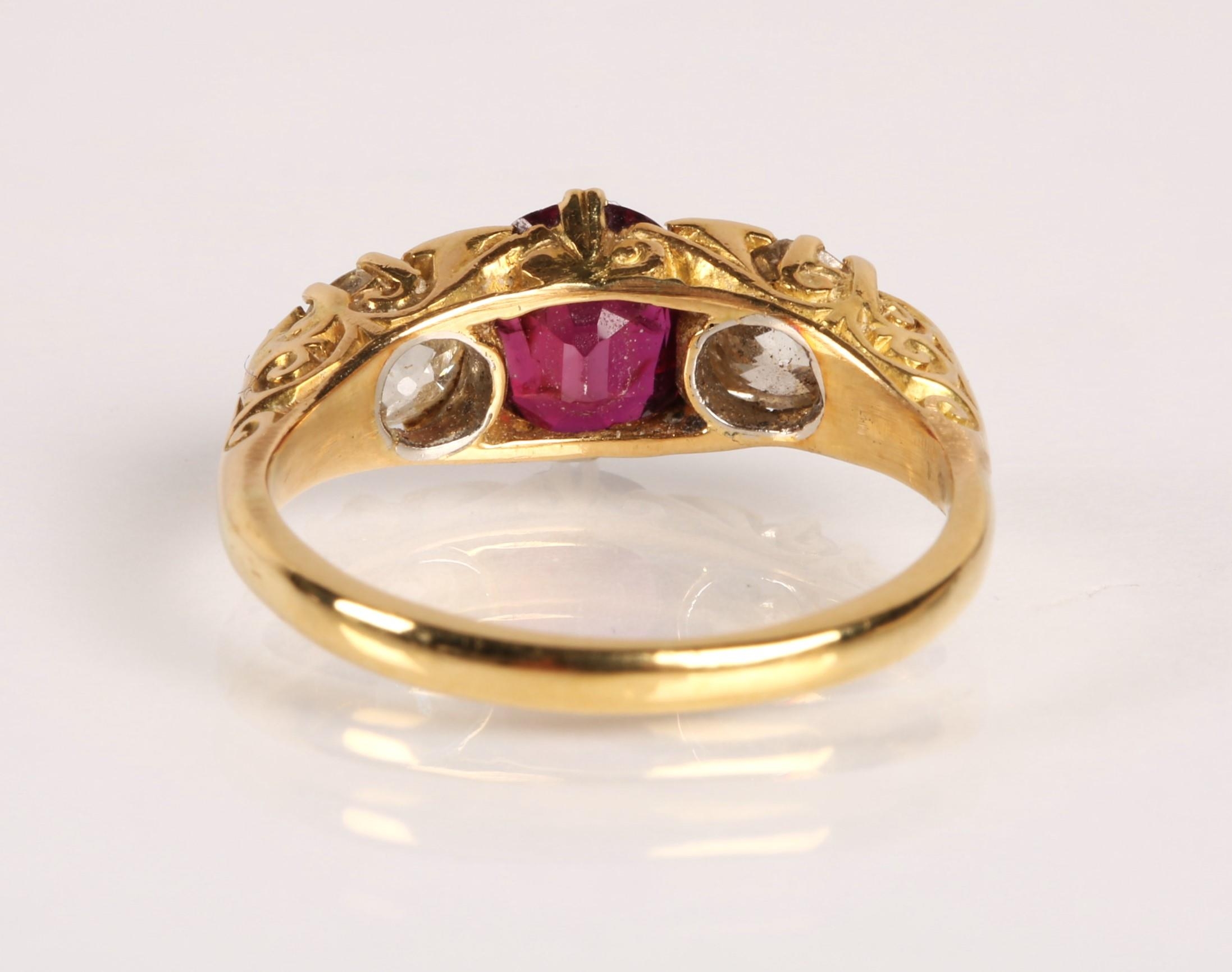 Ruby & Diamond 18ct yellow gold three stone ring, central oval ruby flanked by two old cut diamonds 0.33 each set in a scroll mount with six small diamonds, on 18ct yellow gold shank, ring size P