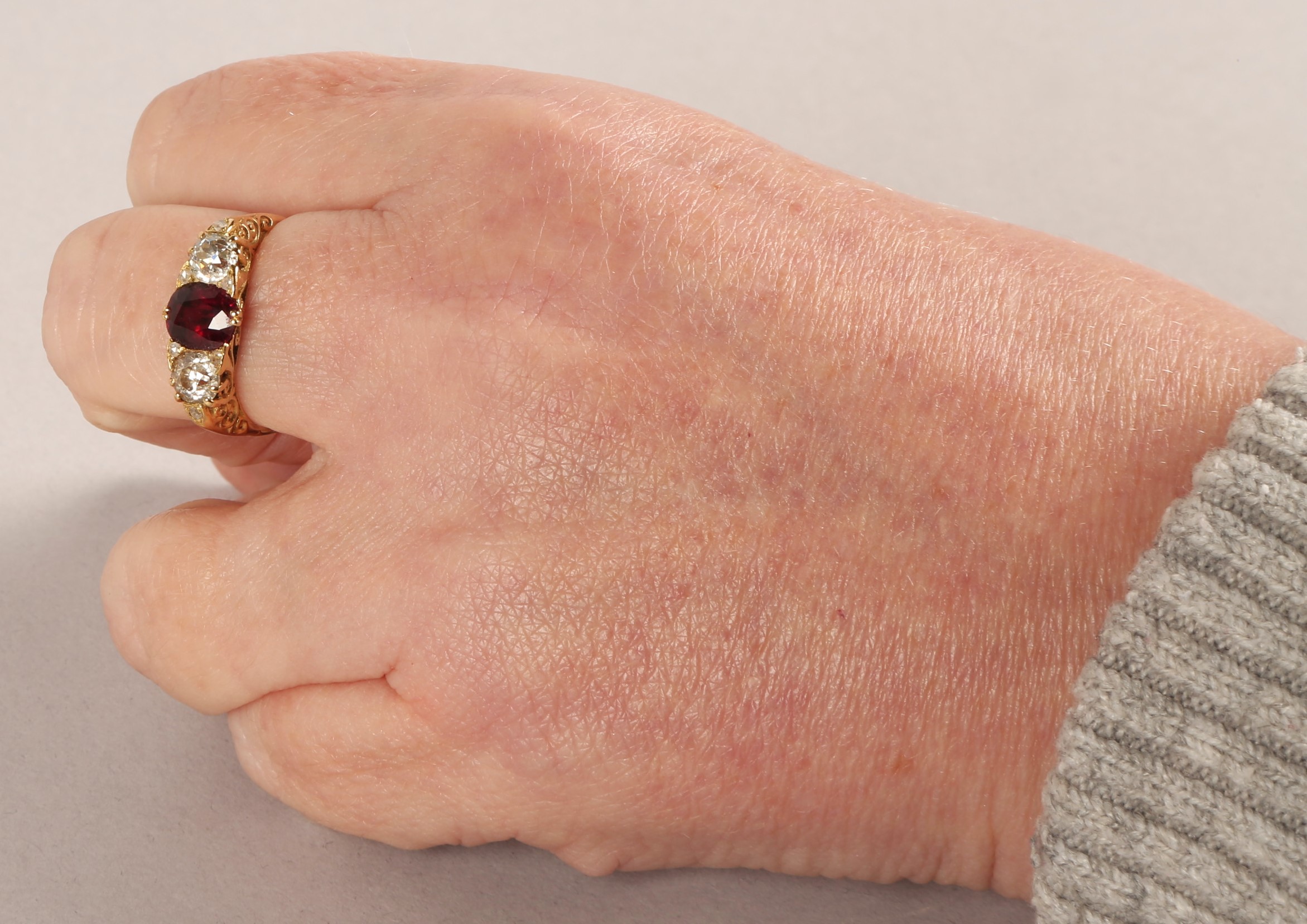 The ring has been resized at one point and is an indentation on the side of the shank where this has happened, the ruby measures 7mm x 5mm, gross weight 4.8 grams, overall good condition