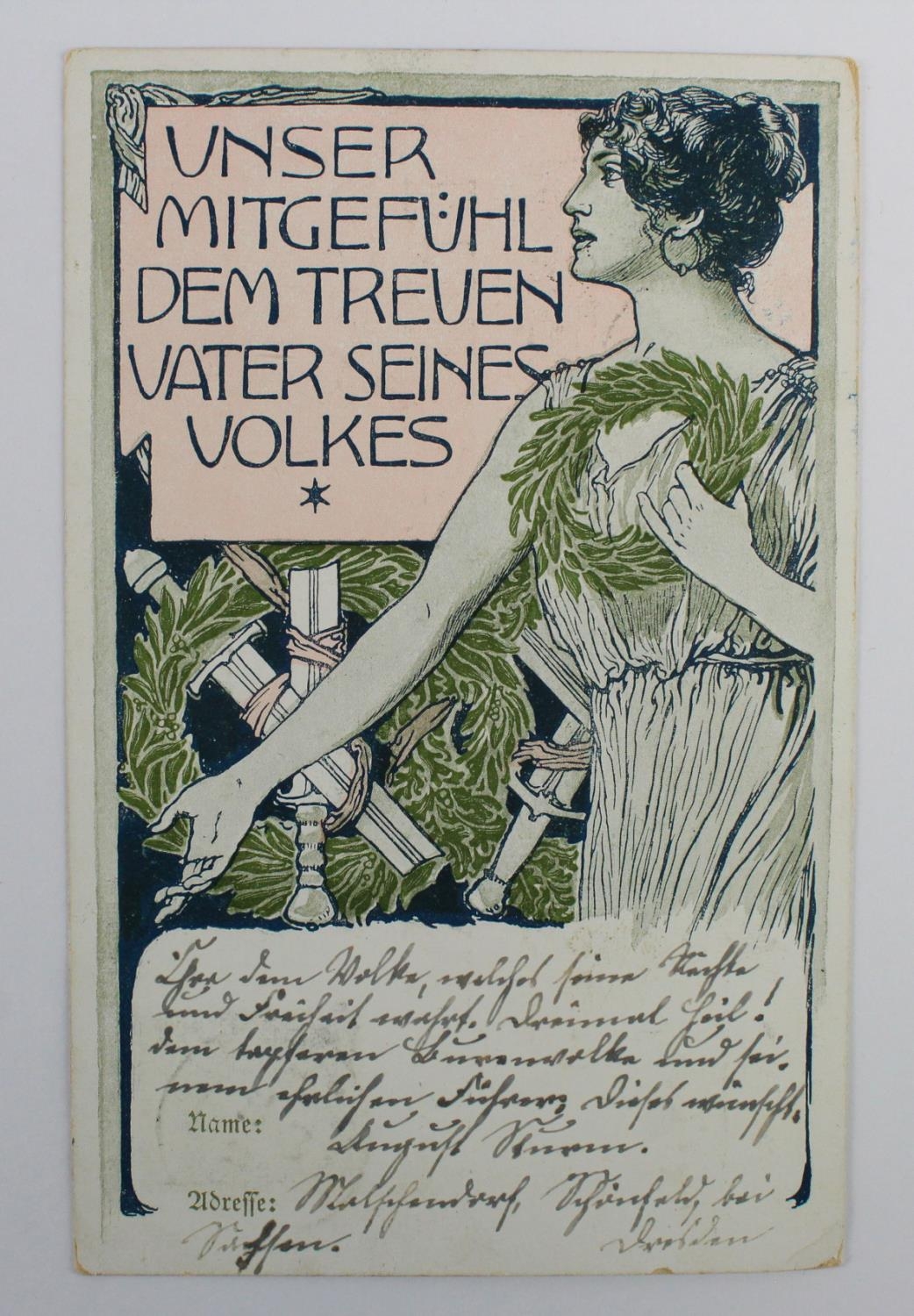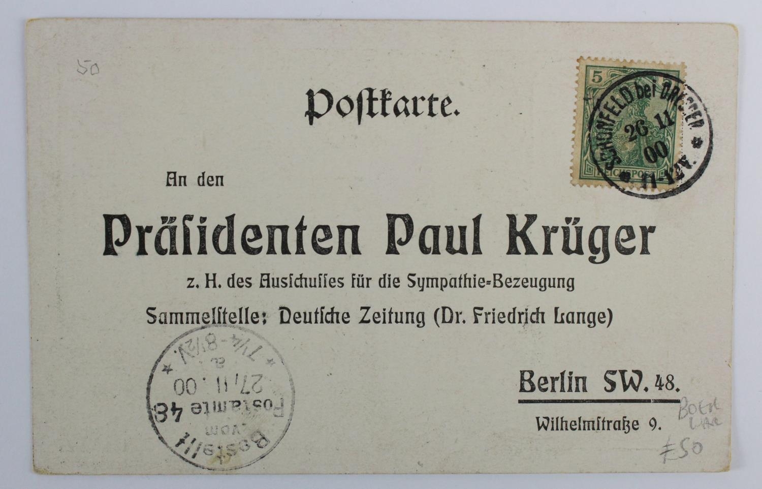 Glamour postcard mailed in November 1900 within Germany expressing support to President Paul Kruger (nb. Kruger left for Europe as the Boer War turned against the Boers in 1900 and spent the rest of his life in exile, refusing to return home following the British victory). Scarce original item of political and social history.