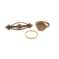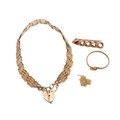 Small collection of 9ct gold jewellery: gate bracelet, ring, brooch and necklace, gross weight 7.9 grams.