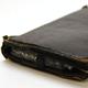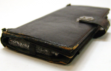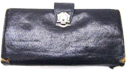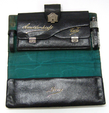 Edwardian leather clutch bag, opening to reveal sub-divided sections for handkerchief, veils, gloves and fitted with a glass scent bottle, 30cm in length