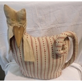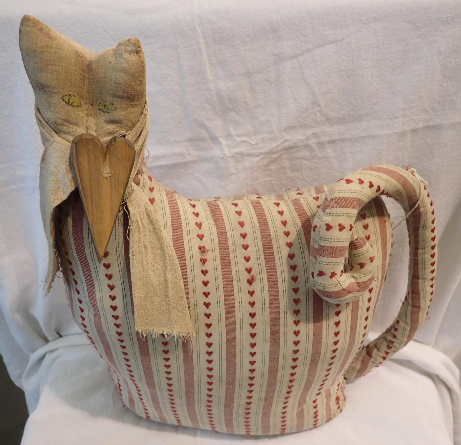 1960s fabric stylised cat doorstop with curled tail in heart patterned fabric, H: 43 cm. P&P Group 1 (£14+VAT for the first lot and £1+VAT for subsequent lots)