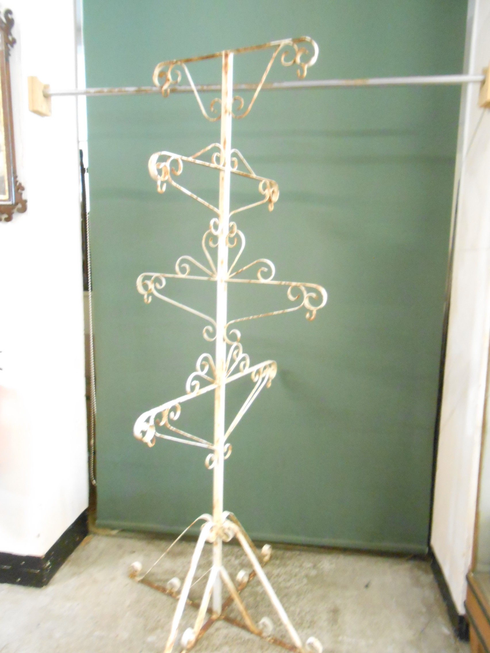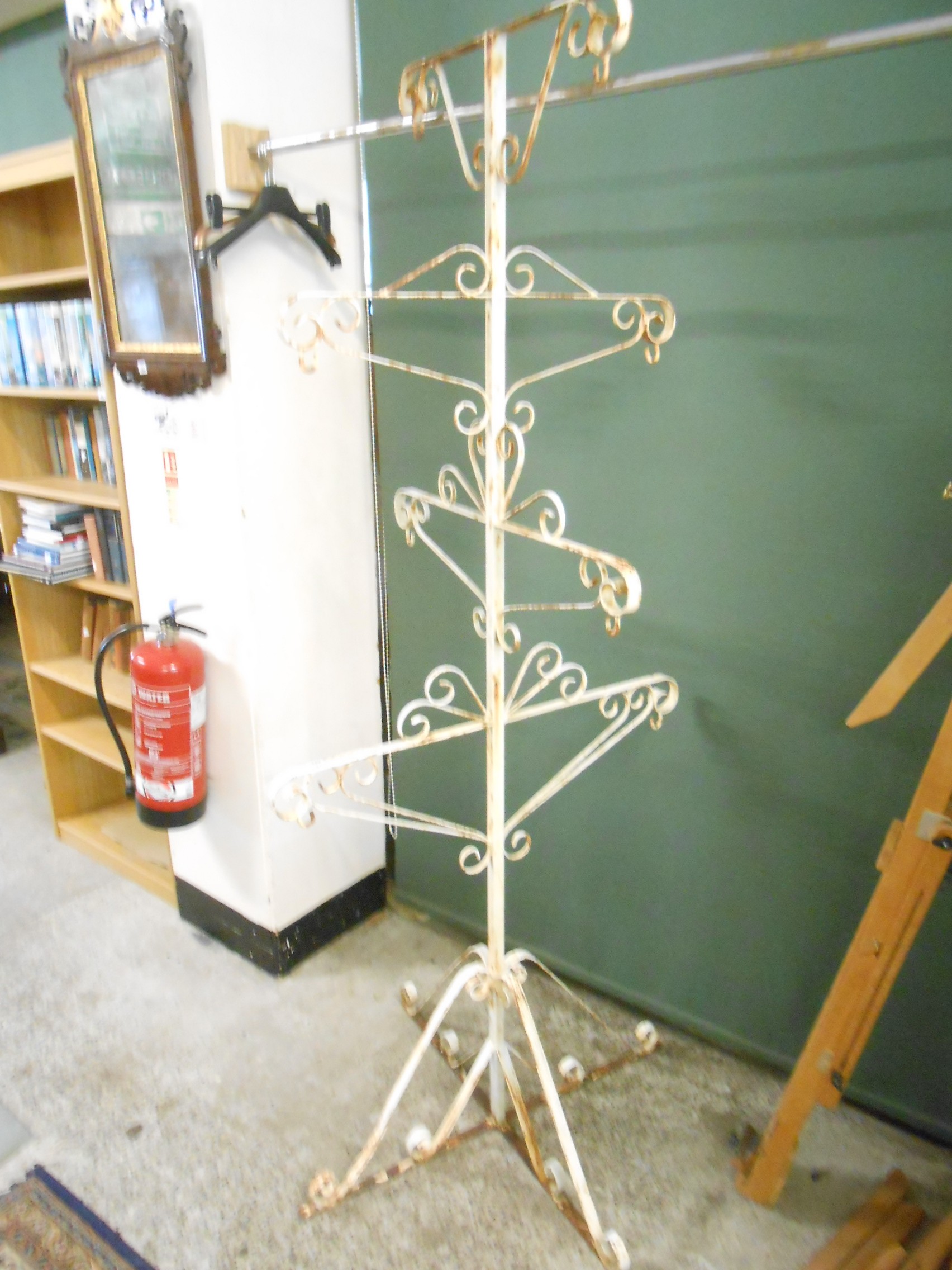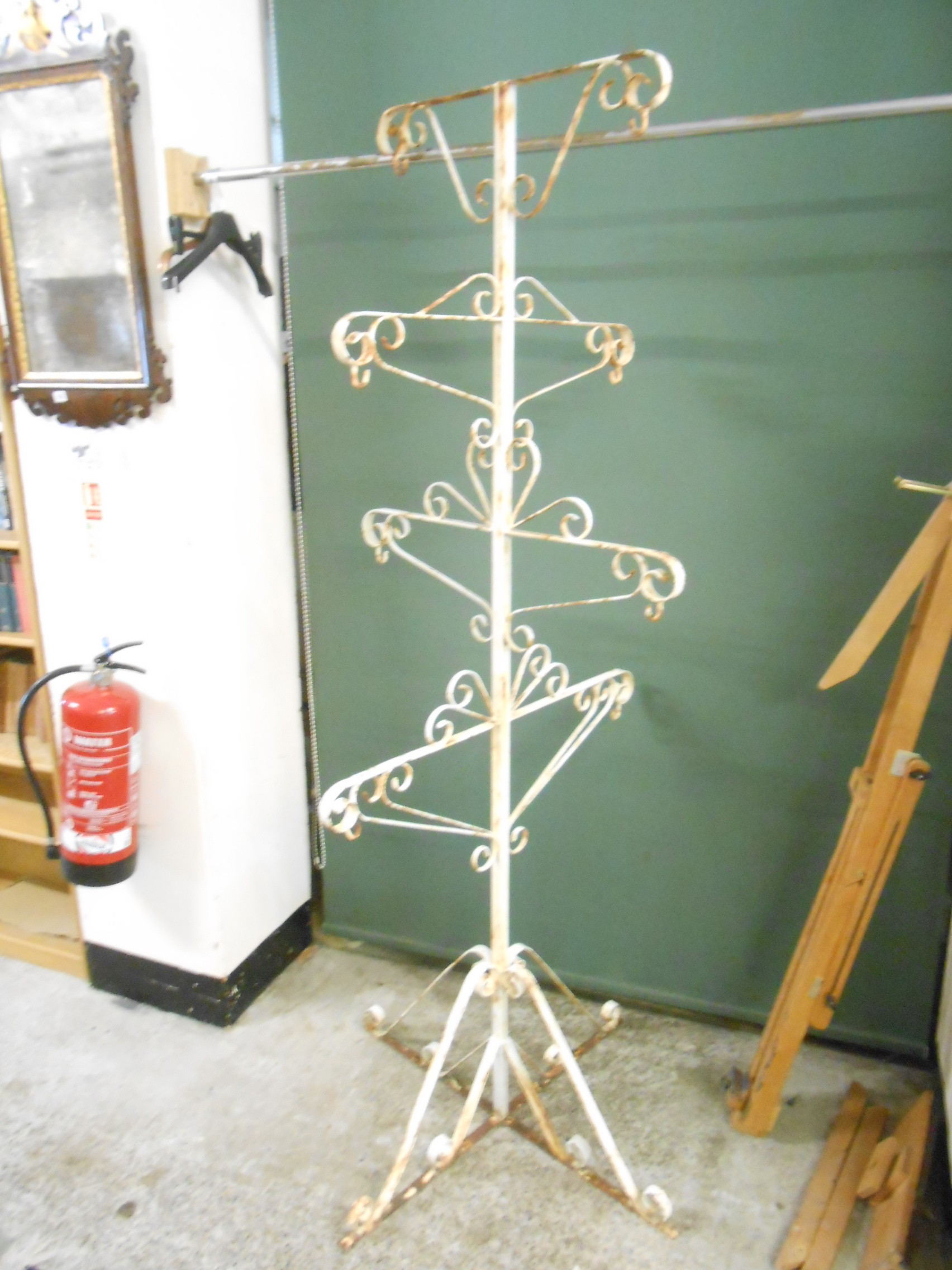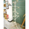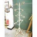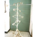 A cream painted wrought iron five tier garden planter with scrolling arms and legs