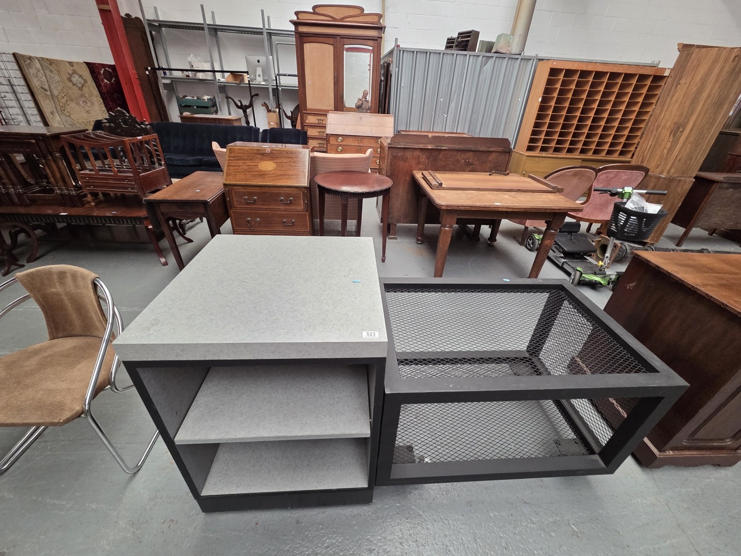 A Luxor utility cart with Harley Davidson emblem on side with a metal two tier cart on castors