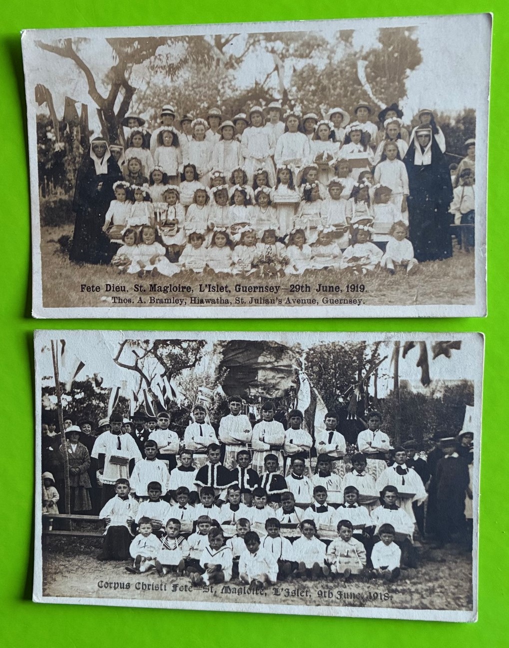 Two real photographic postcards by Thomas Bramley Guernsey, Fete Dieu St Magloire Guernsey 20th June 1919 & Corpus Christi St Magloire L'islet 9th June 1918 (2).