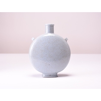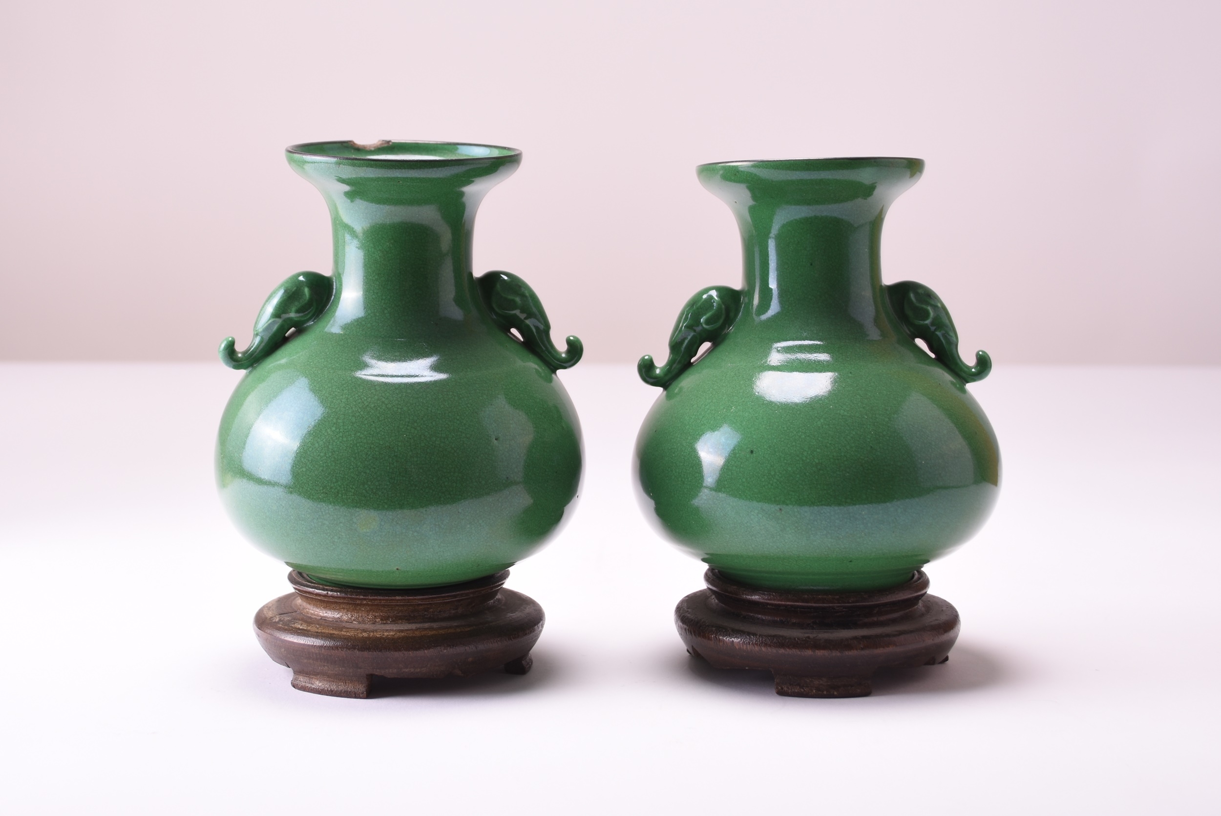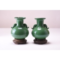 A pair of Chinese green-glazed Langyao vases, Qing Dynasty Possibly 18th century Of onion form with flared rims and twin elephant-head handles, decorated with an all-over apple green glaze suffused with a fine crackle. 15.5cm high (2) Property of a deceased estate in Shropshire.