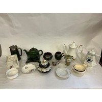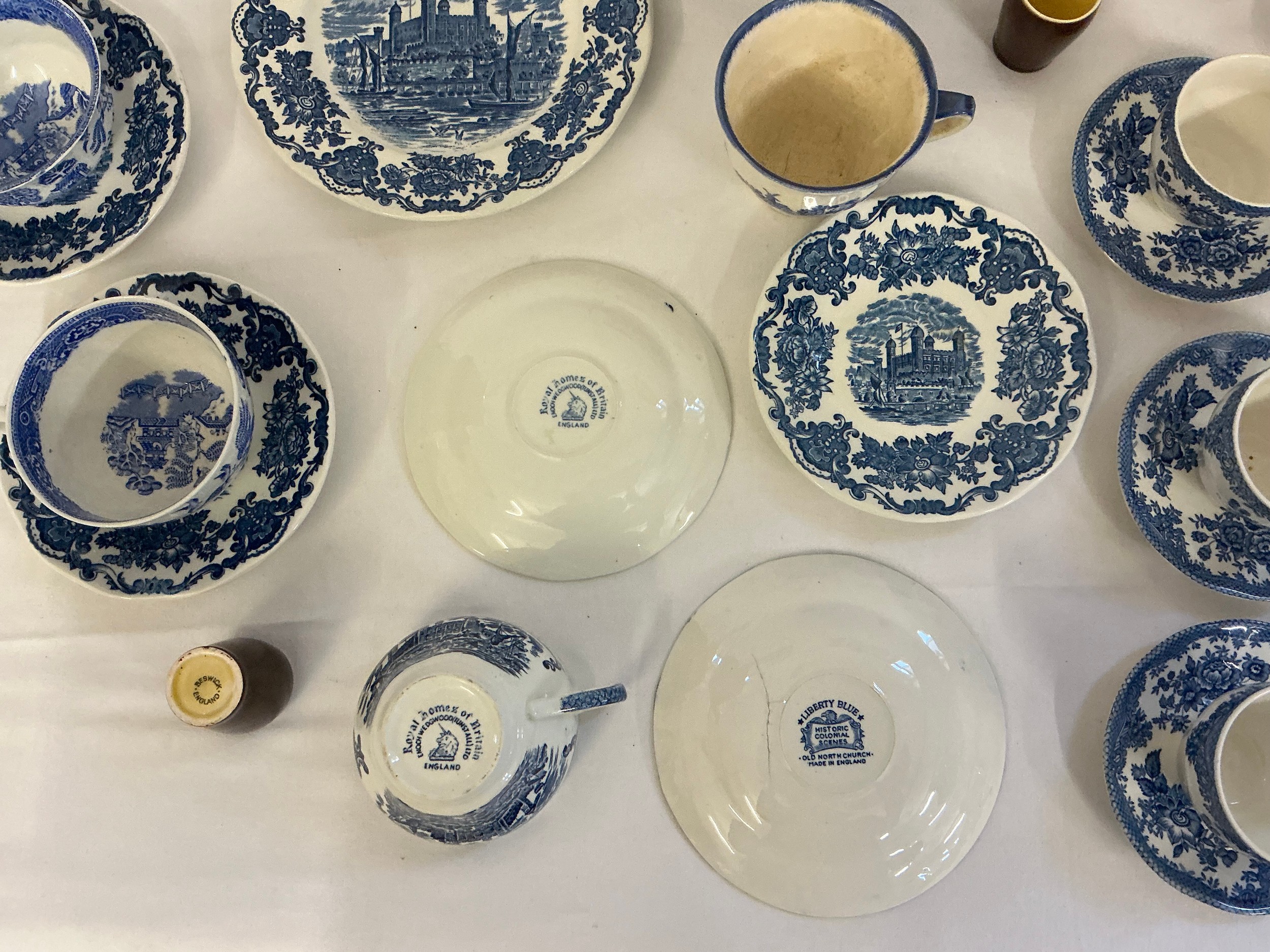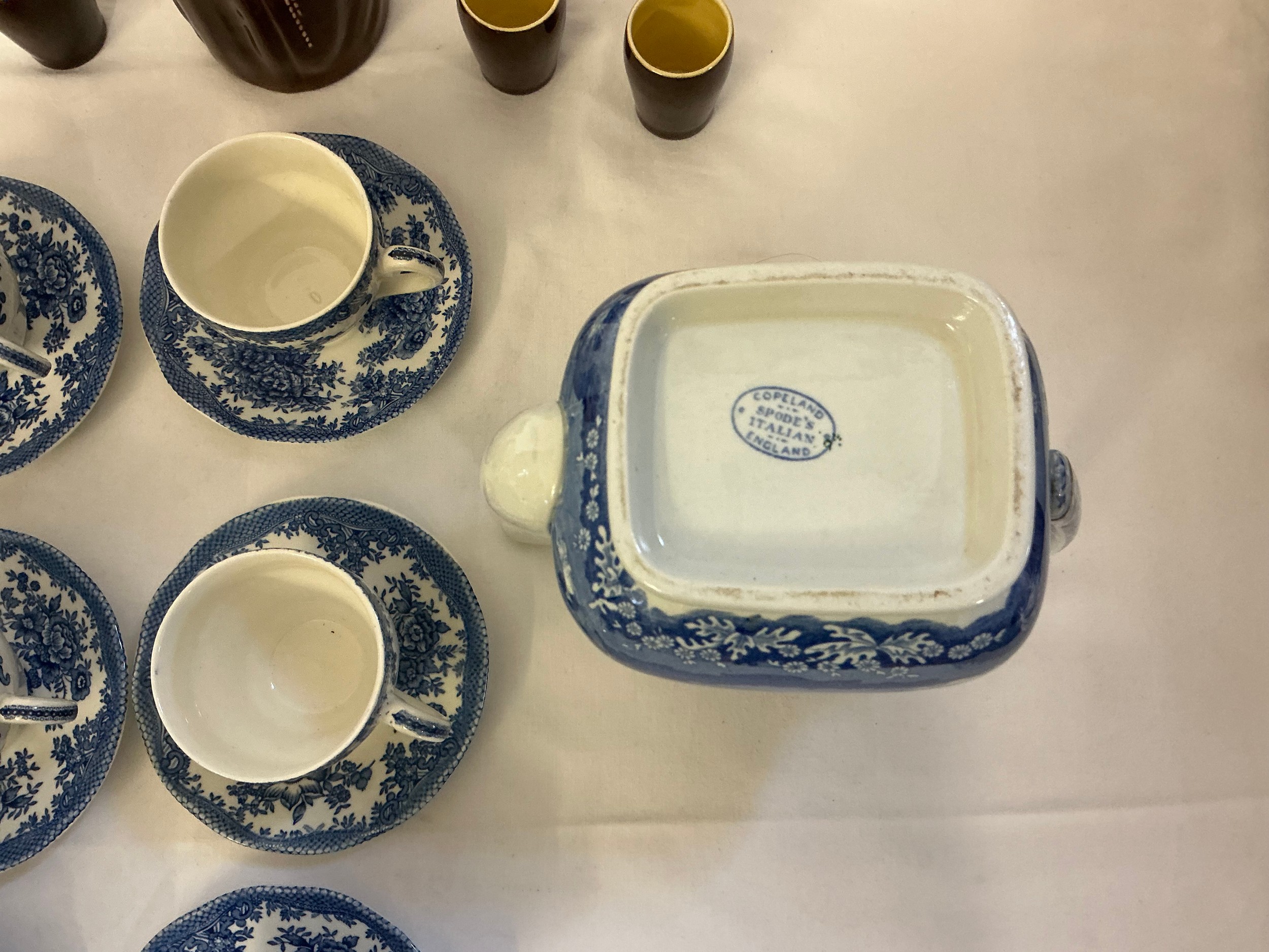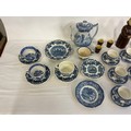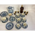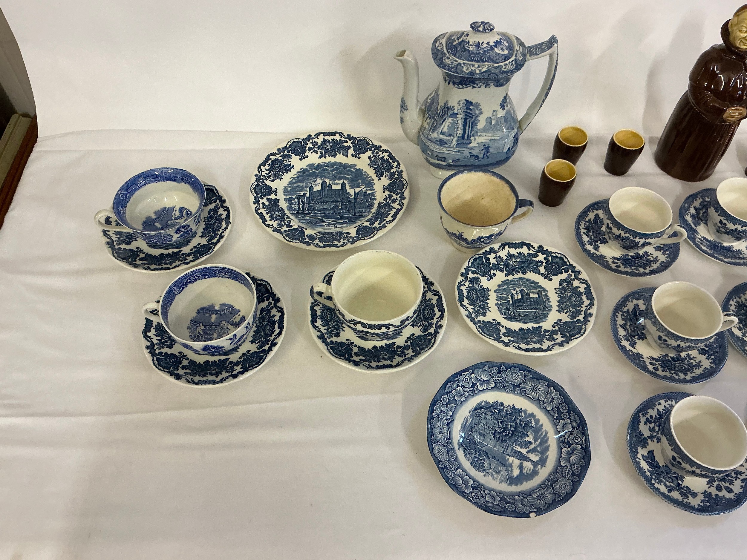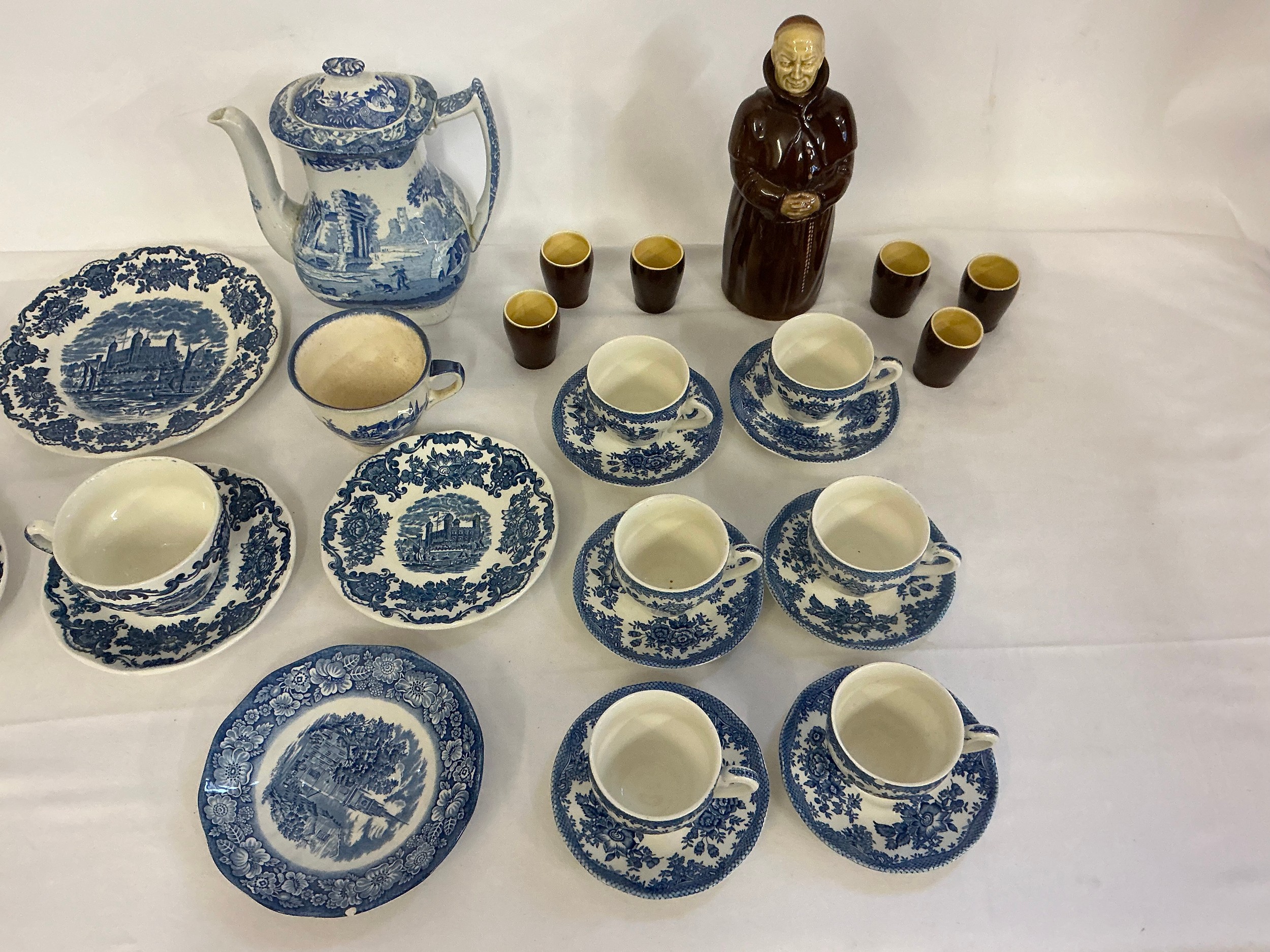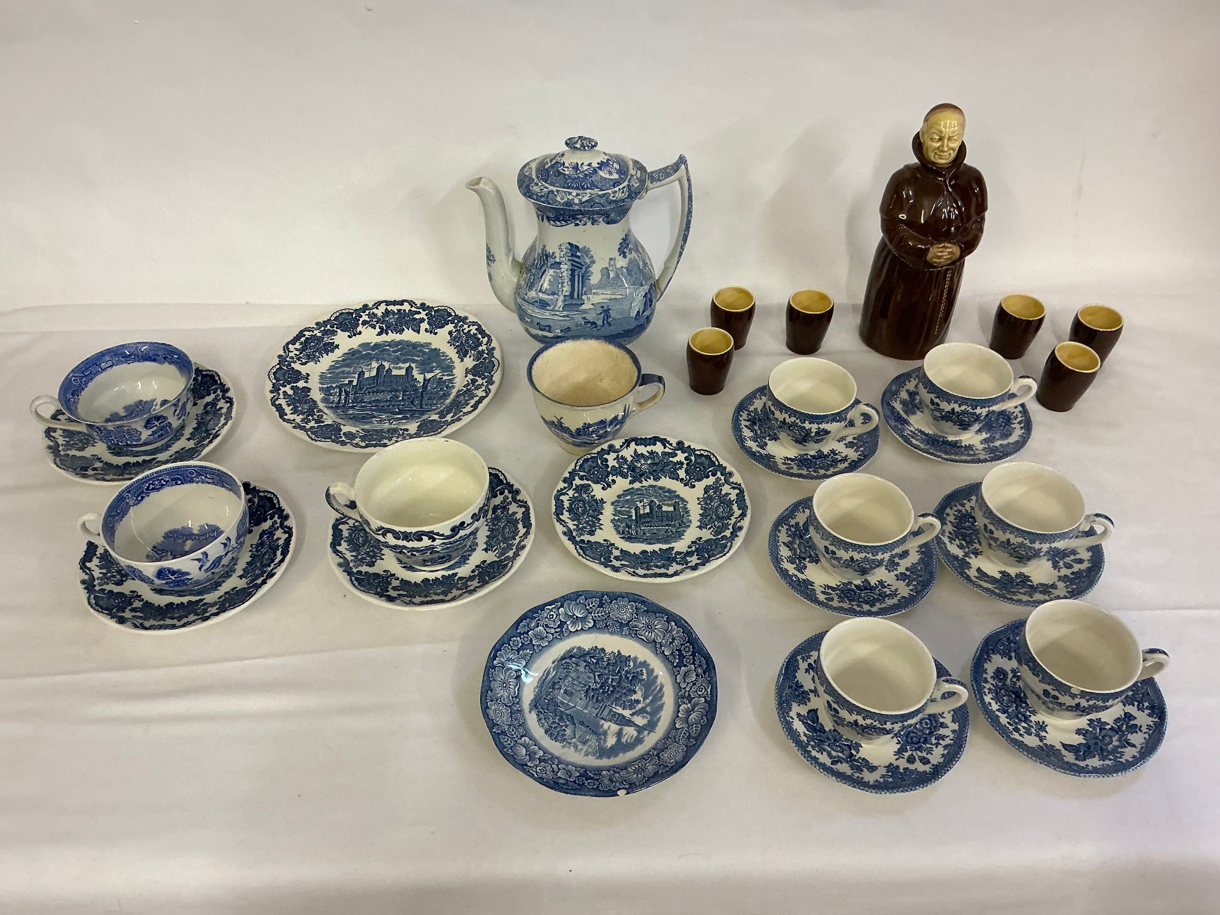 A Blue & White Copeland Spode's Italian Coffee Pot, Enoch Wedgwood Saucers, Blue & White Coffee Cups & Saucers & a Beswick Heatmaster Monk & Six matching Tot Cups.