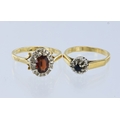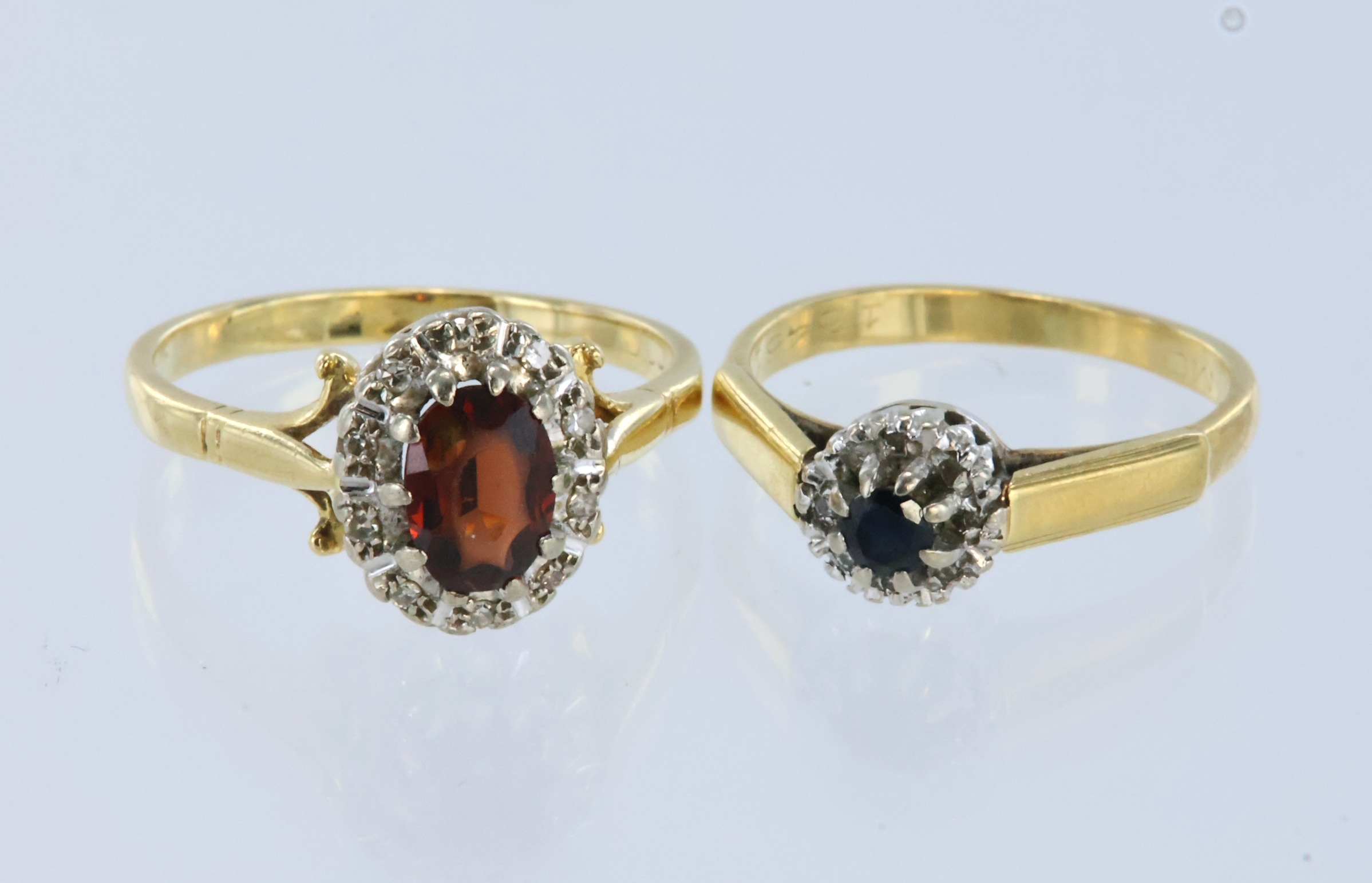 Two 18ct yellow gold cluster rings, one garnet (worn) and diamond, finger size P, one sapphire and diamond, finger size M, gross weight 7.7g