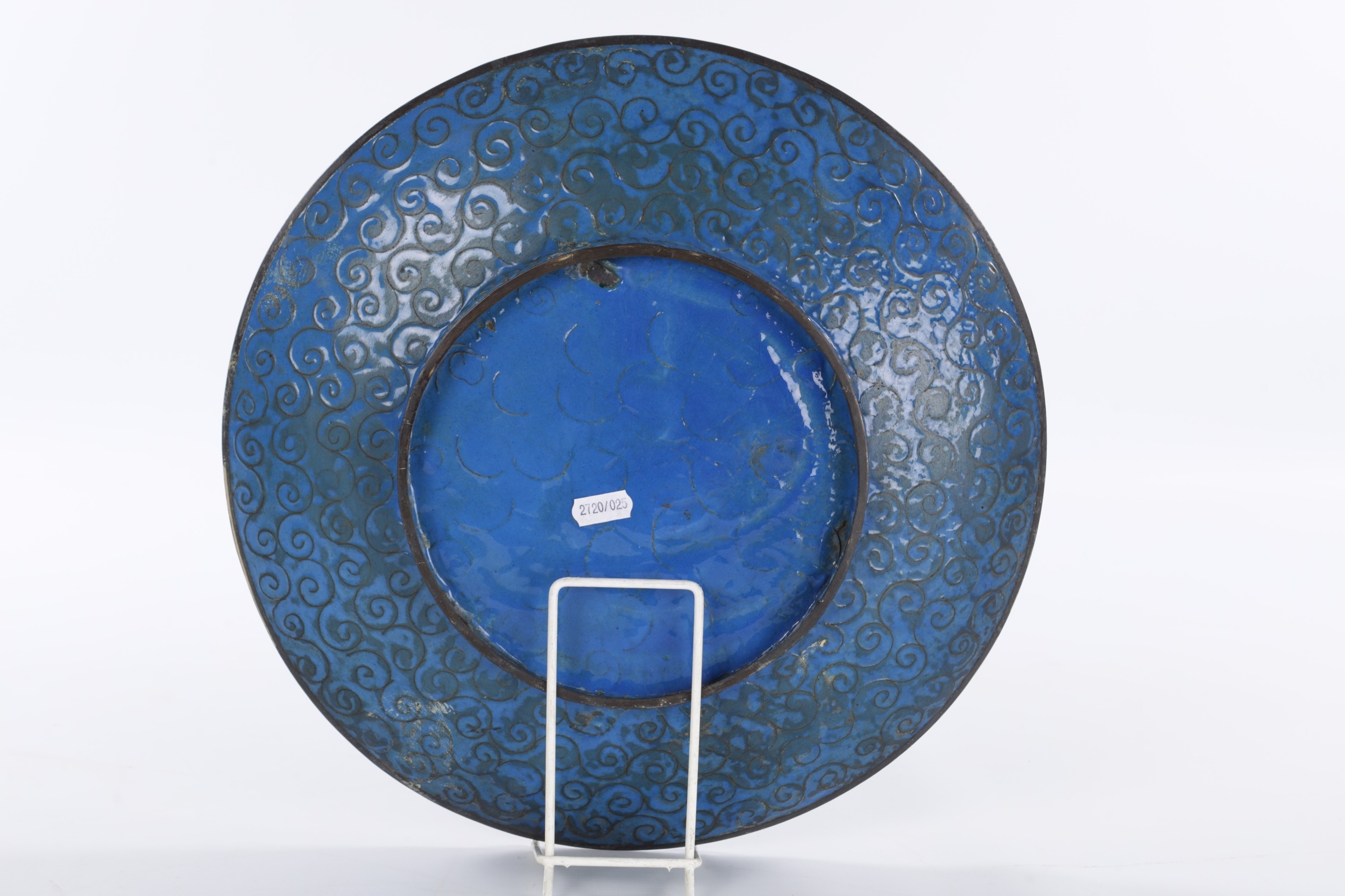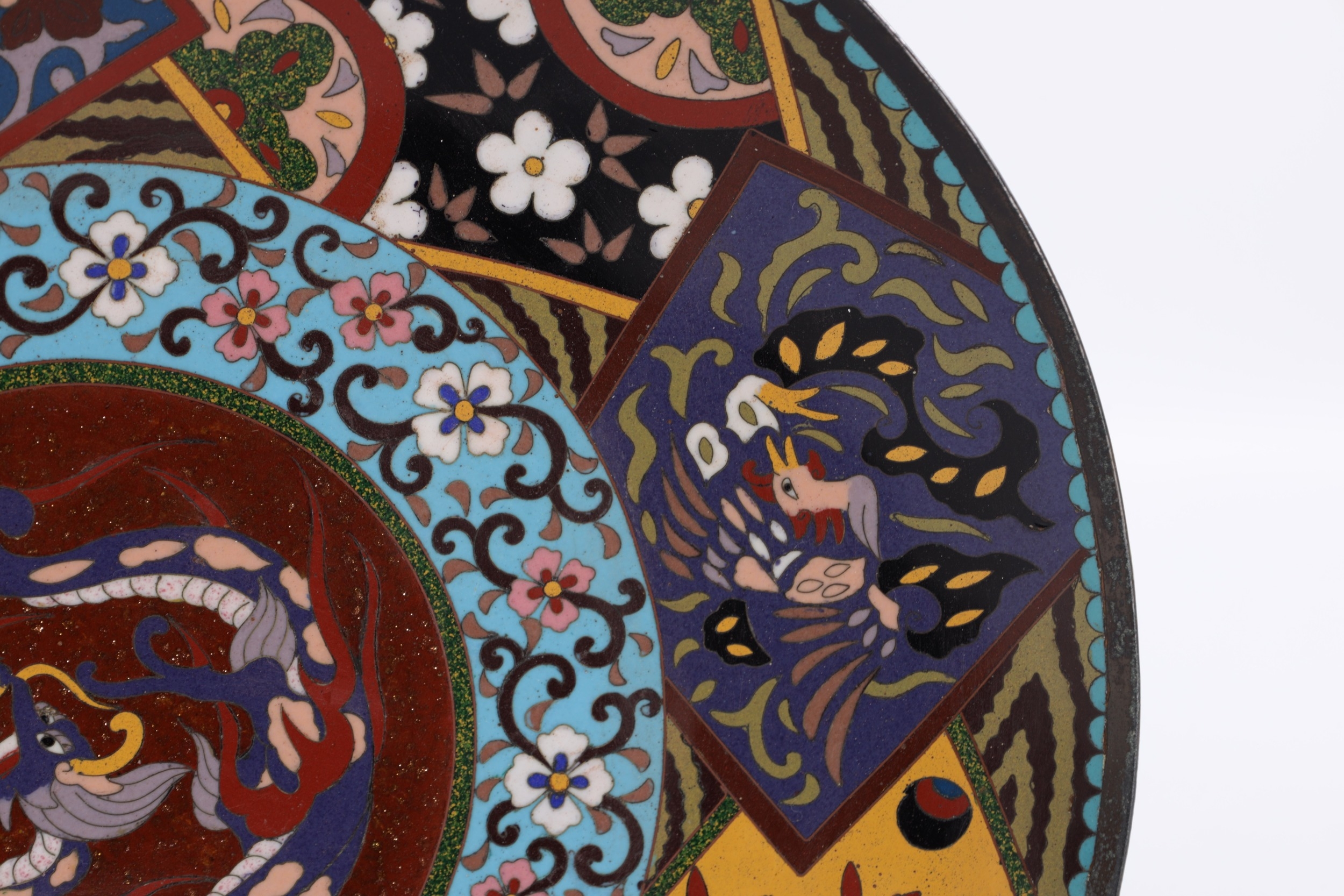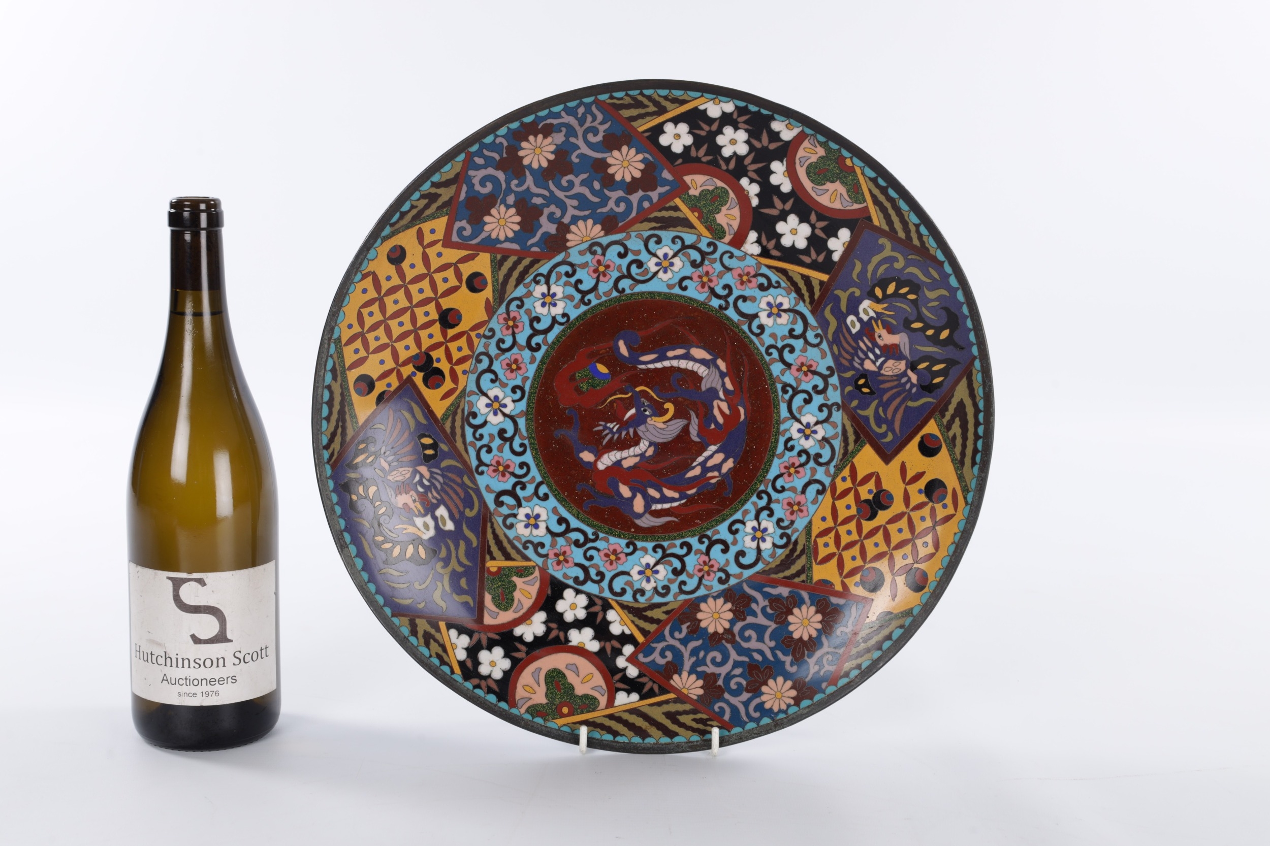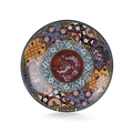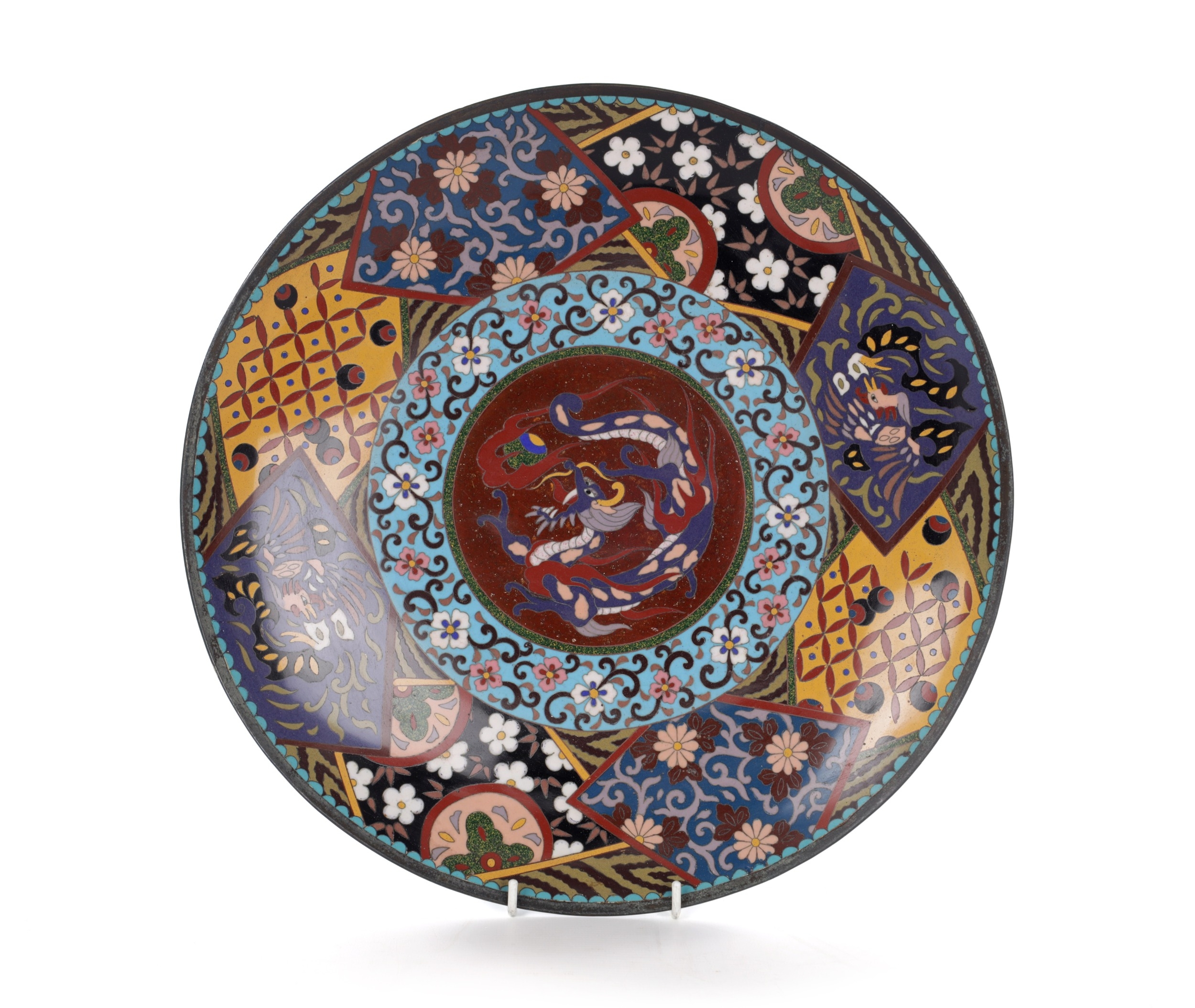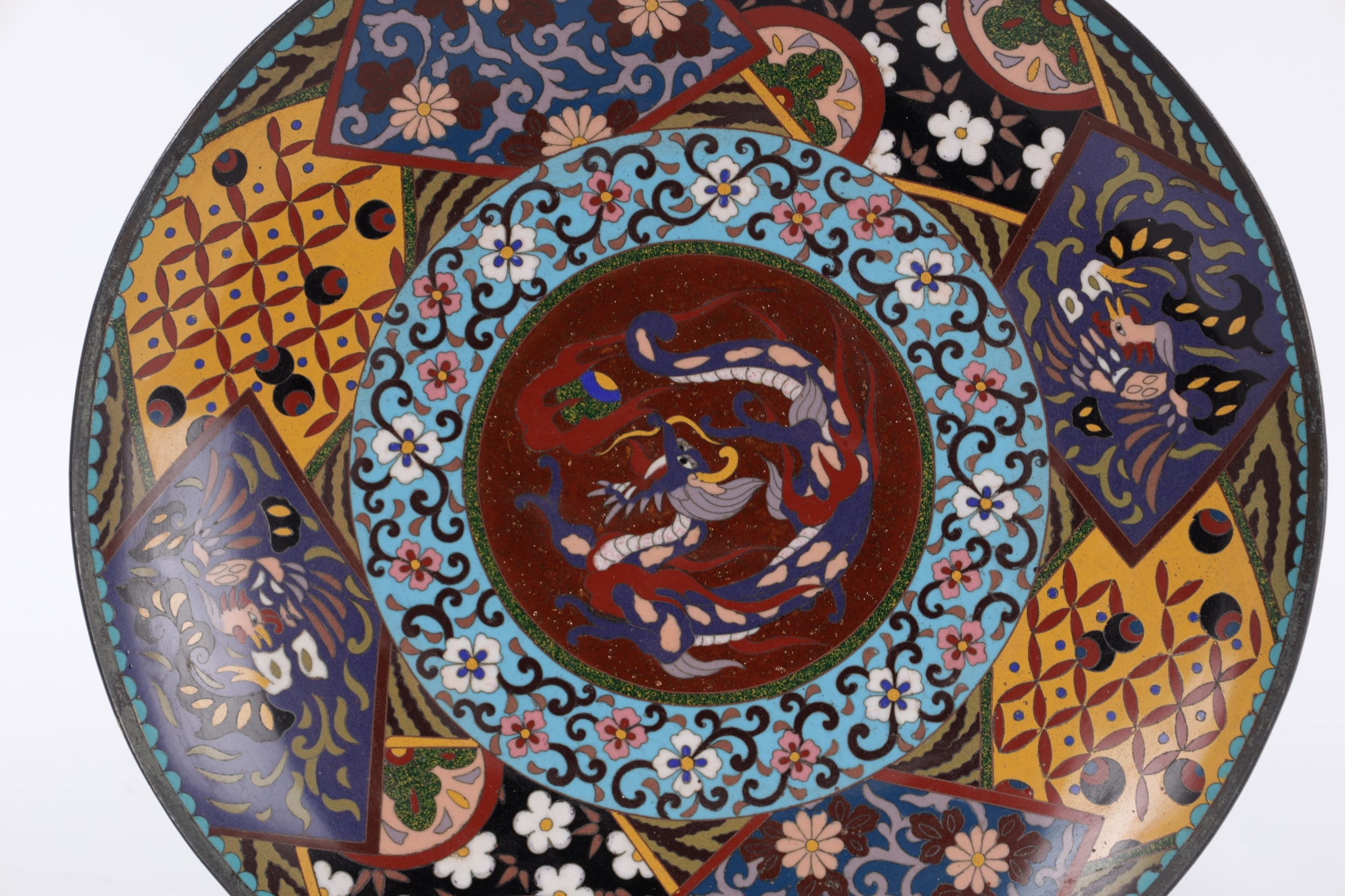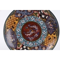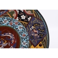 A 19TH CENTURY CHINESE CLOISONNE CHARGER brightly coloured with a dragon centre and floral border (36.5cm diameter)