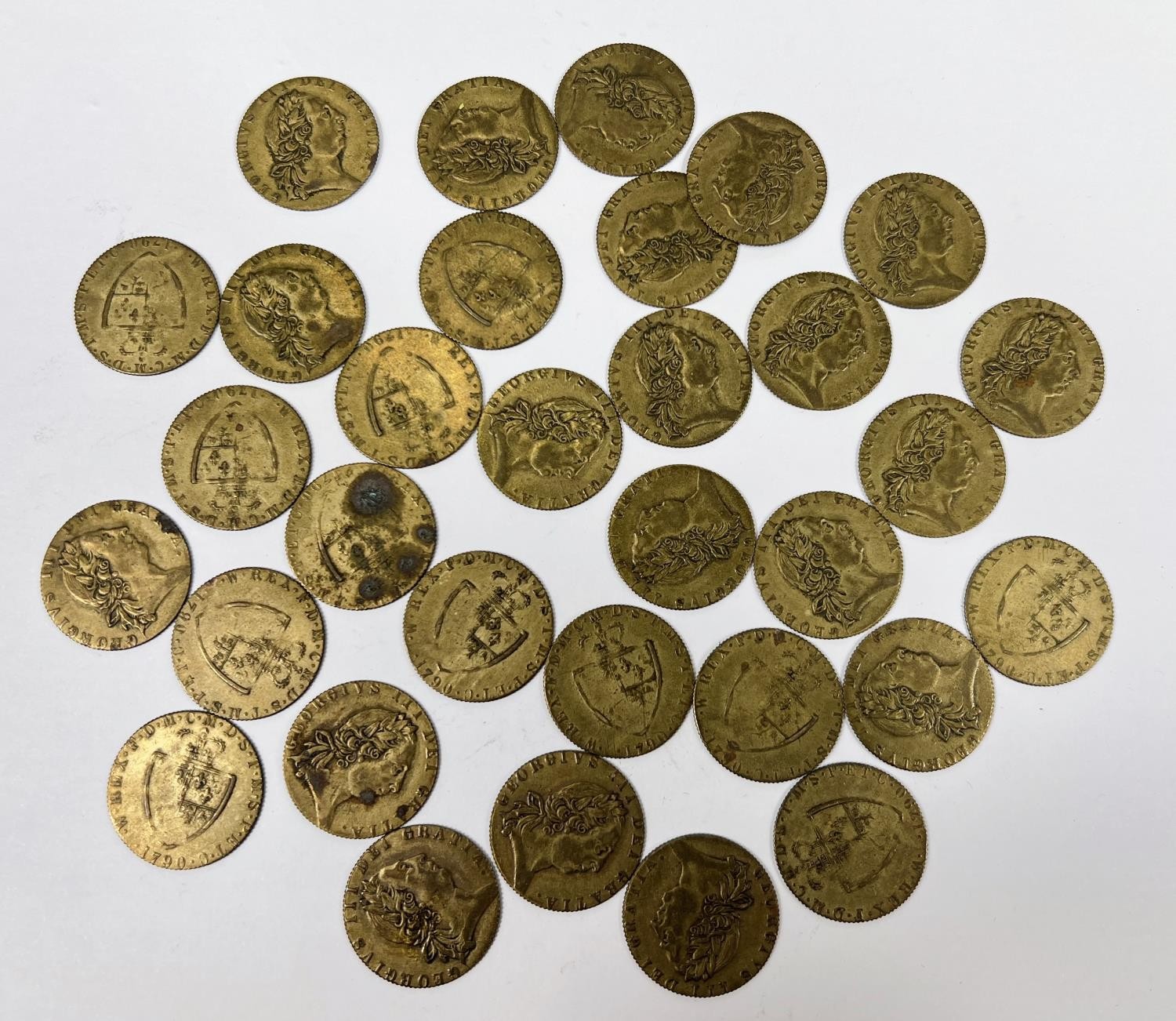 Approximately 30 George III brass guinea tokens