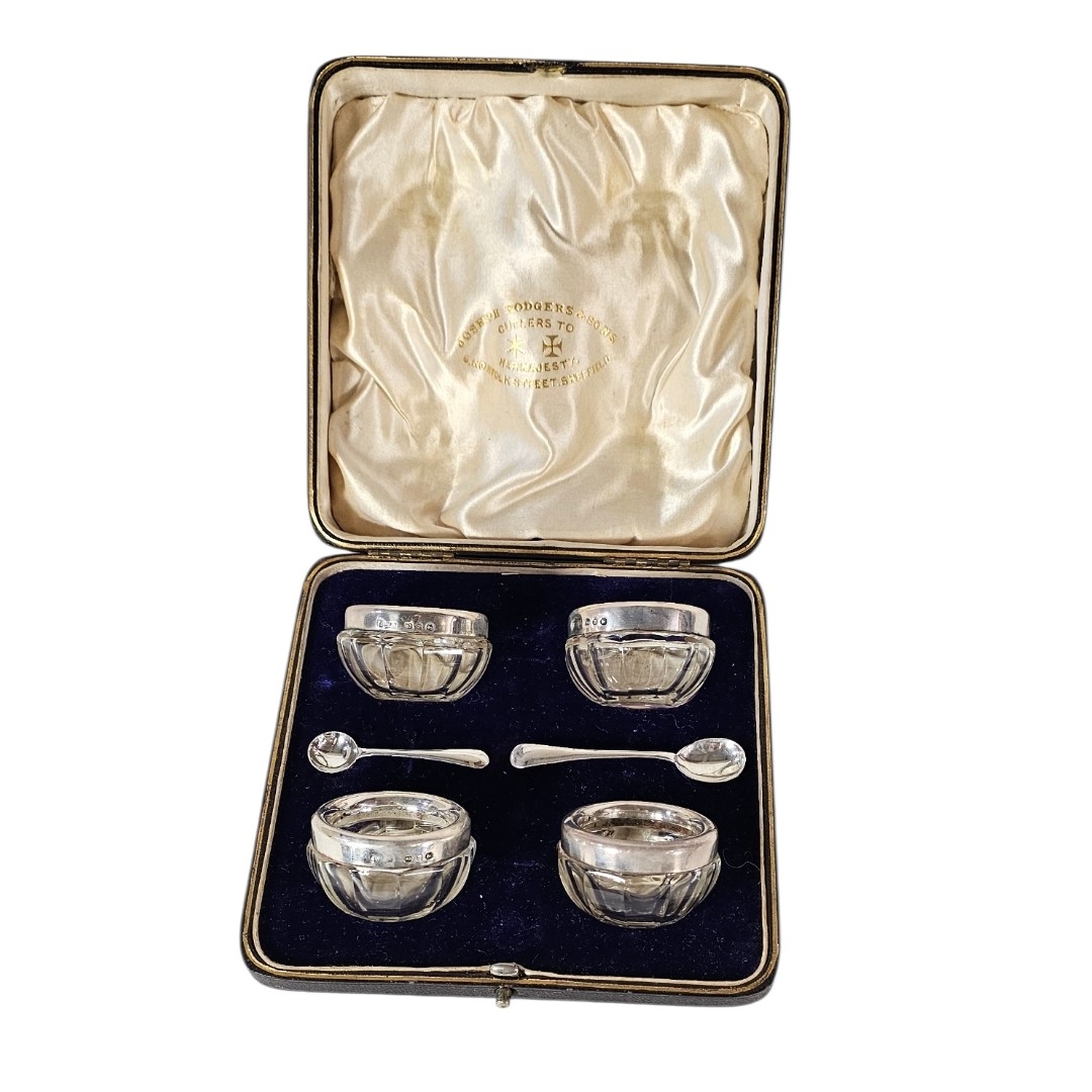 Each set with a silver rim hallmarked Joseph Rodgers, Birmingham, 1898, together with two non matching salt spoons, in a fitted velvet lined box.