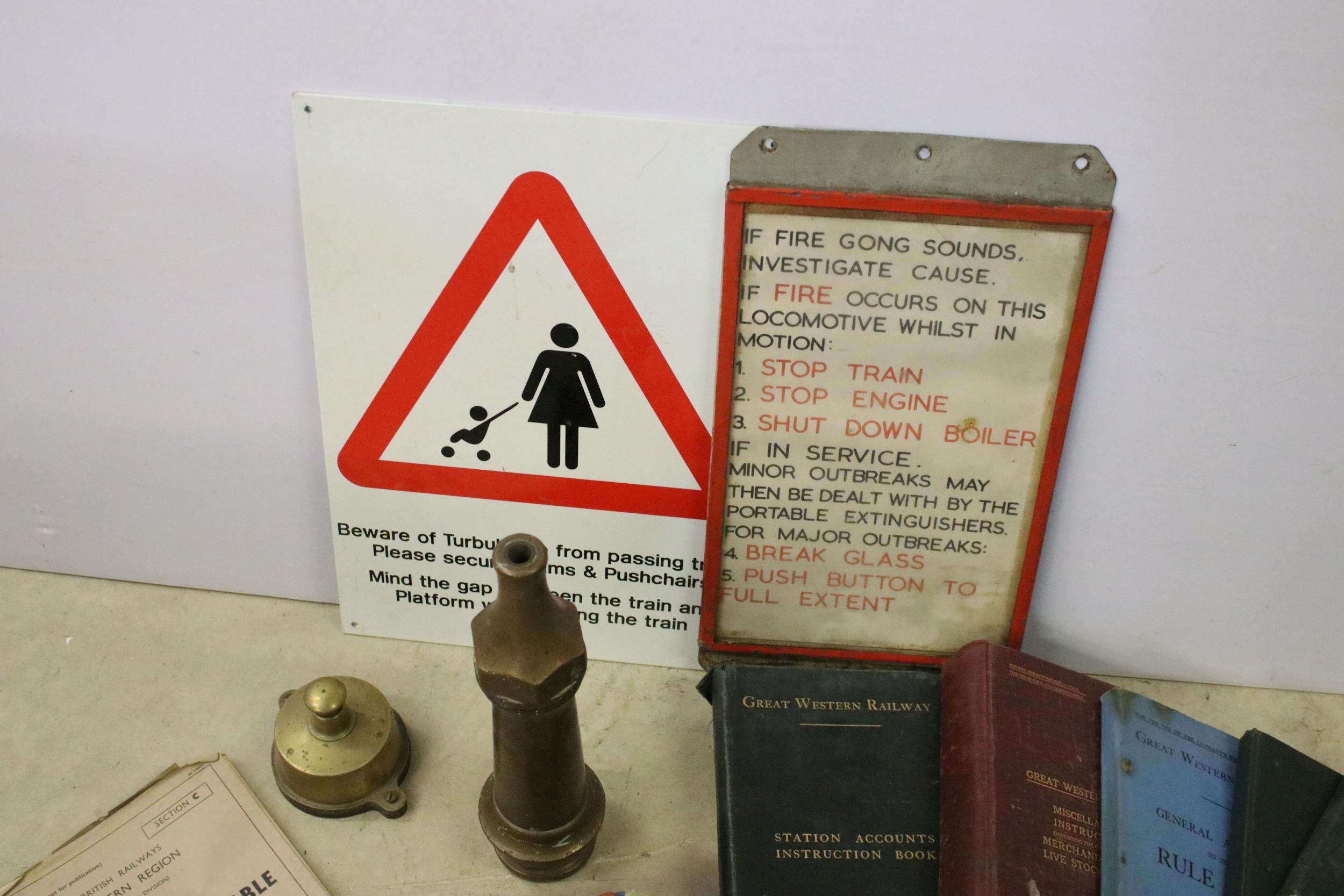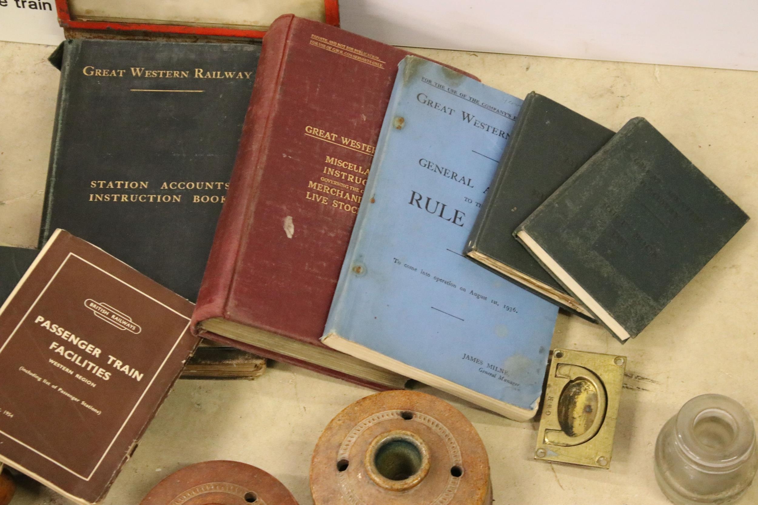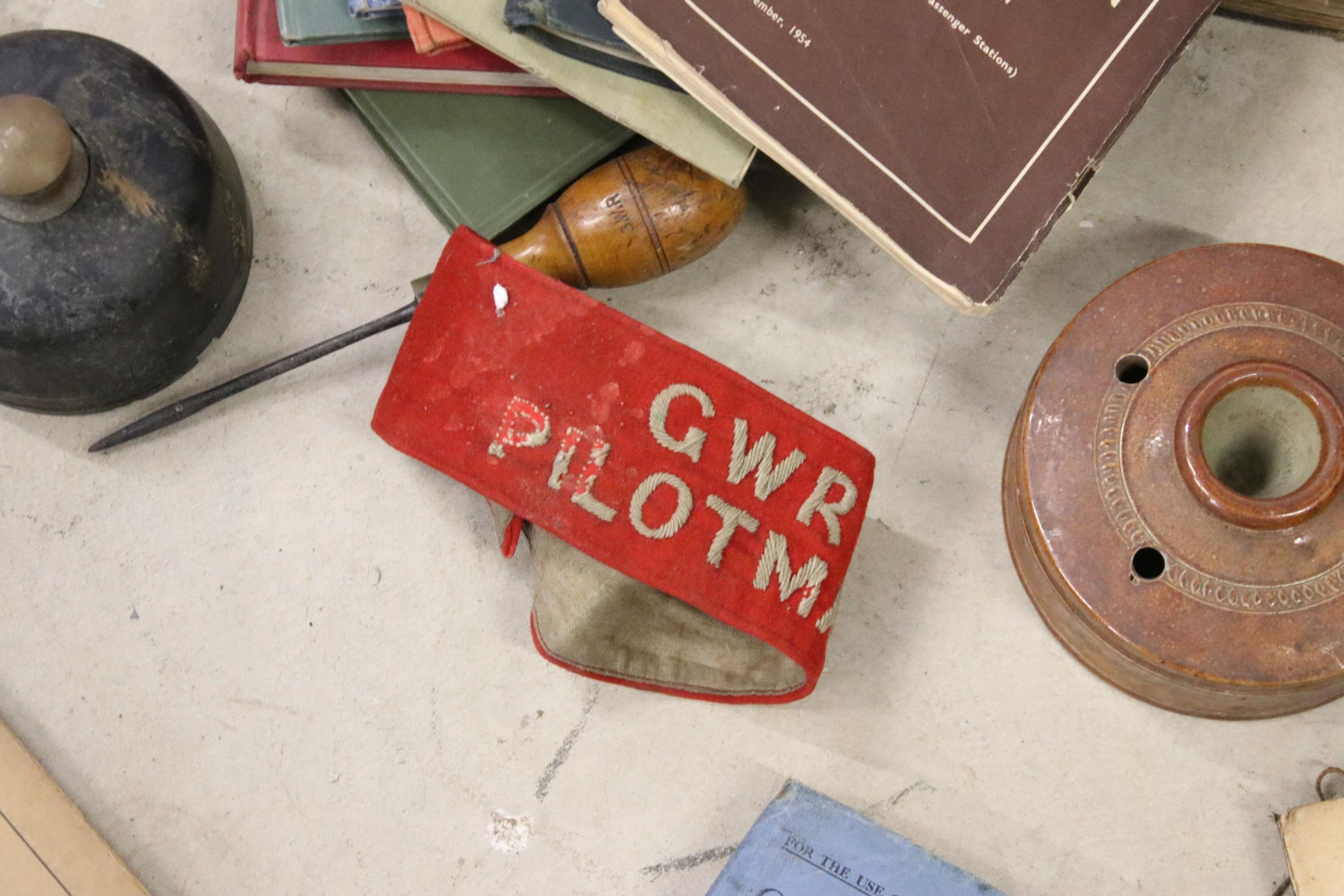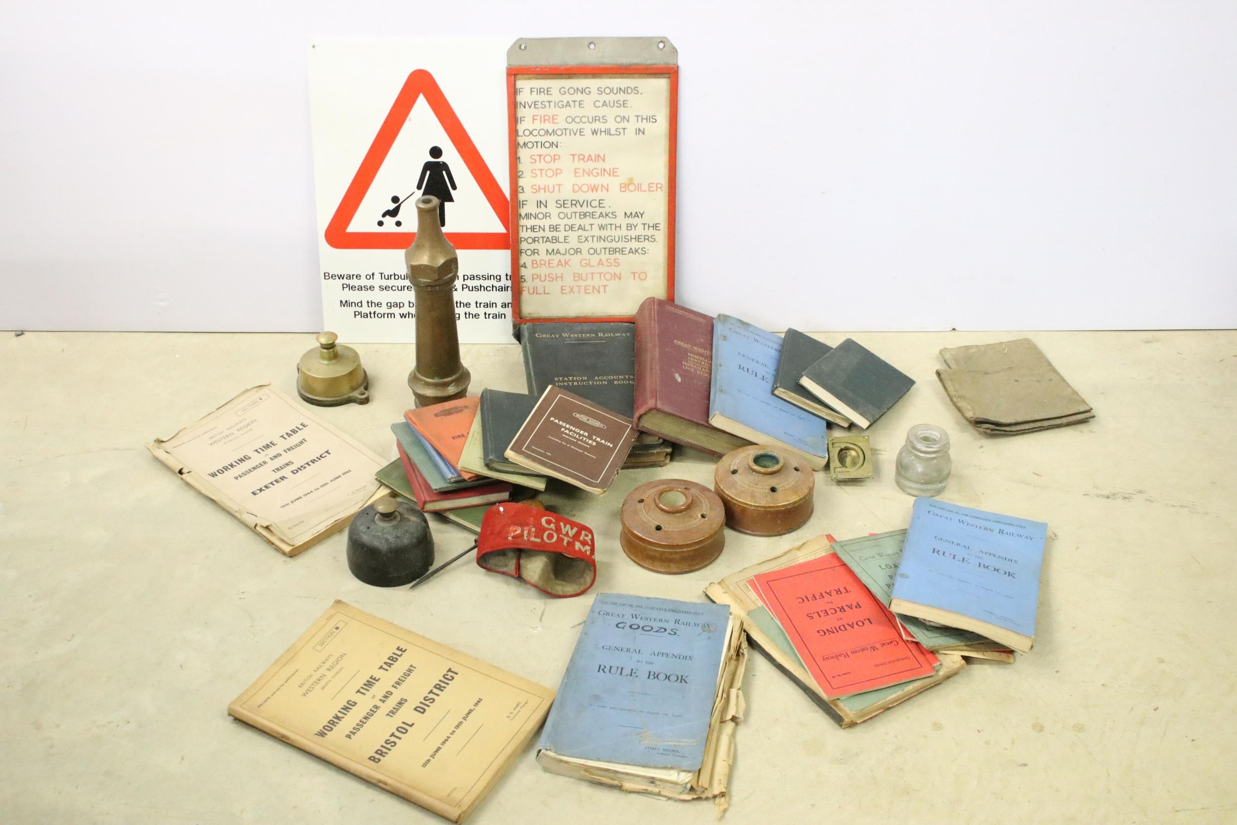 Collection of Great Western Railway related items to include 2 x antique stoneware GWR inkwells, Beware Of Turbulence Prams & Pushchairs warning metal sign, railway fire gong cab notice sign, GWR Pilotman armband, quantity of Great Western Railway For Repairs cards, GWR brass handle, collection of mixed books to include Station Accounts Instruction Book, Miscellaneous Instructions, General Appendix To The Rule Book, Great Western Railway Rule Books including 1933 examples, British Railways Western Region Working Time Table, etc