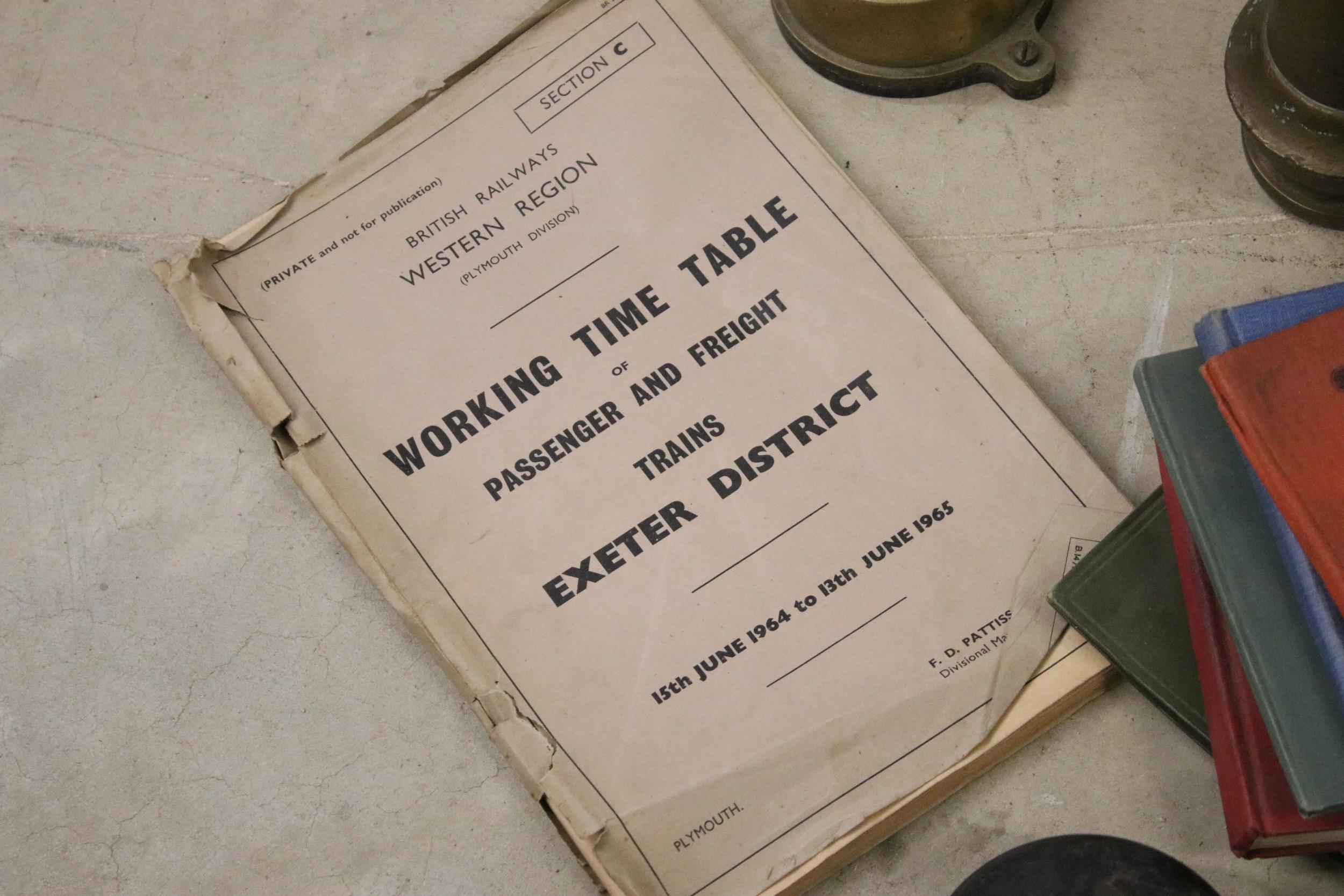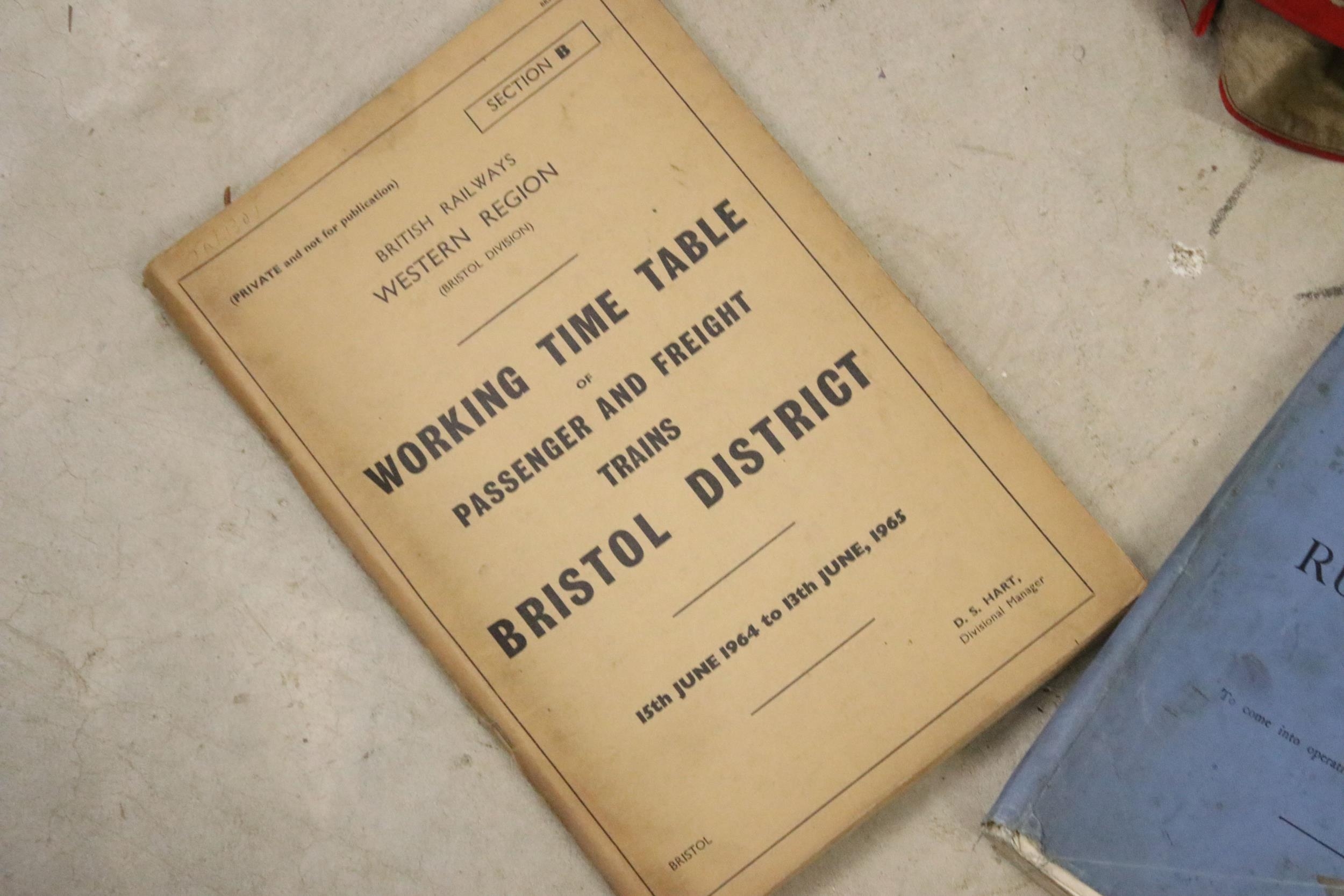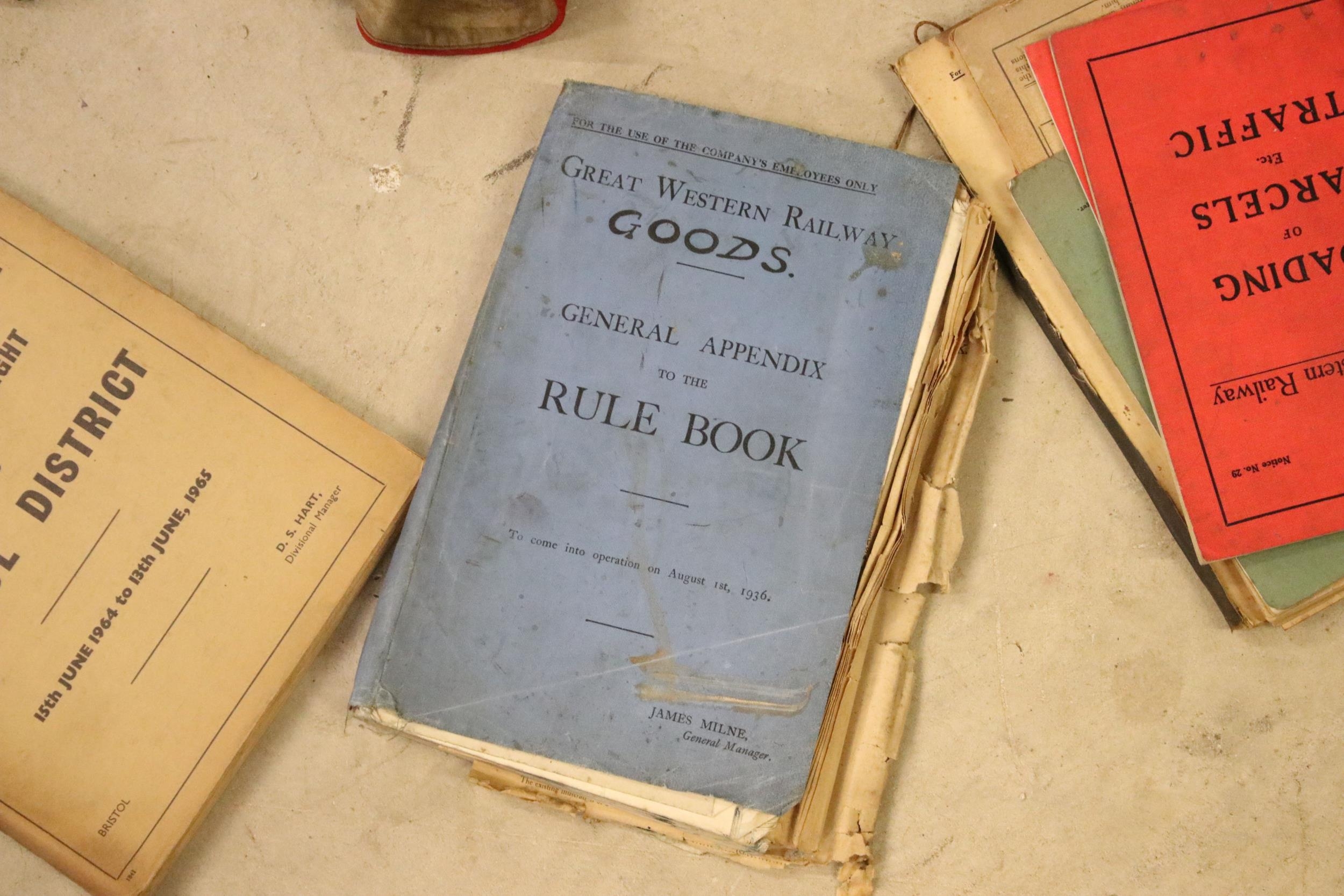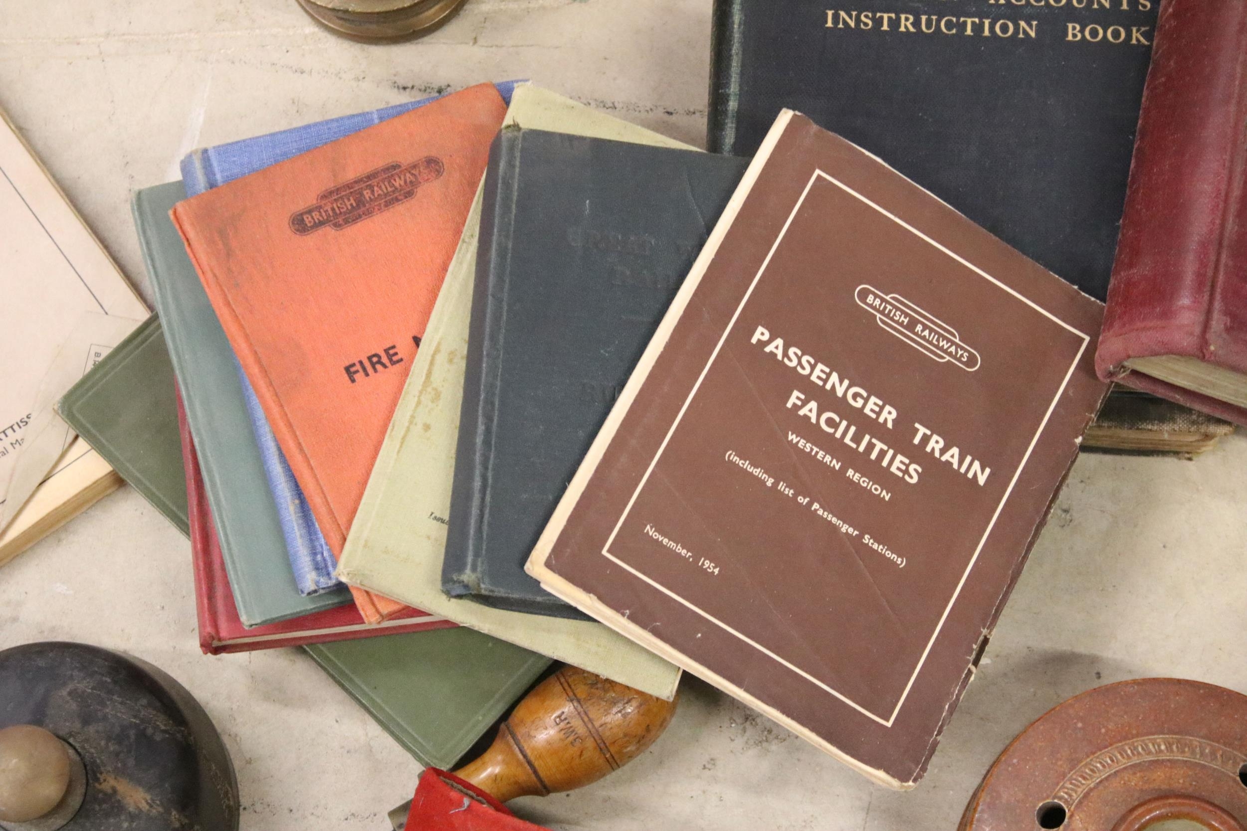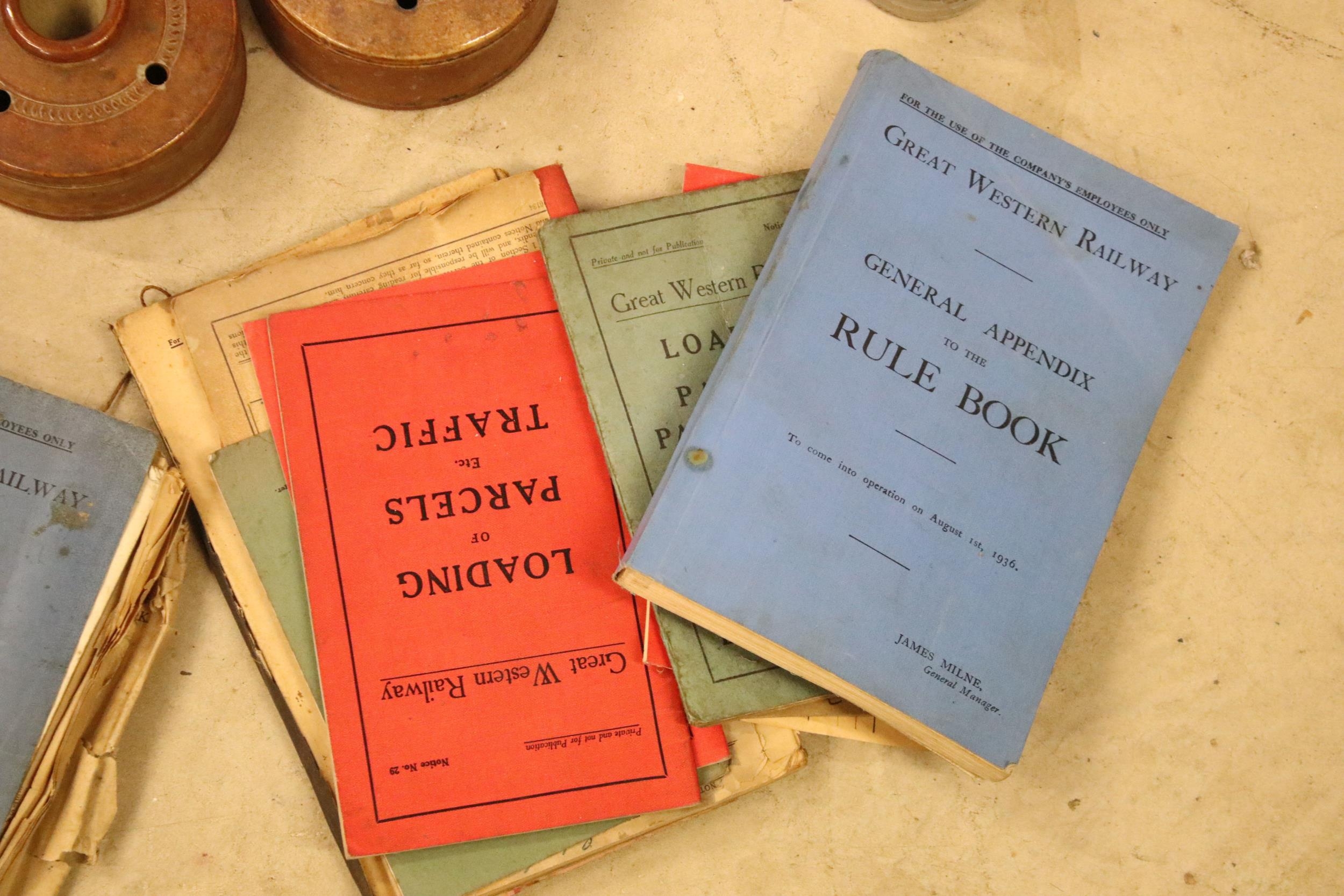 Collection of Great Western Railway related items to include 2 x antique stoneware GWR inkwells, Beware Of Turbulence Prams & Pushchairs warning metal sign, railway fire gong cab notice sign, GWR Pilotman armband, quantity of Great Western Railway For Repairs cards, GWR brass handle, collection of mixed books to include Station Accounts Instruction Book, Miscellaneous Instructions, General Appendix To The Rule Book, Great Western Railway Rule Books including 1933 examples, British Railways Western Region Working Time Table, etc
