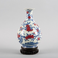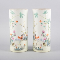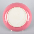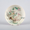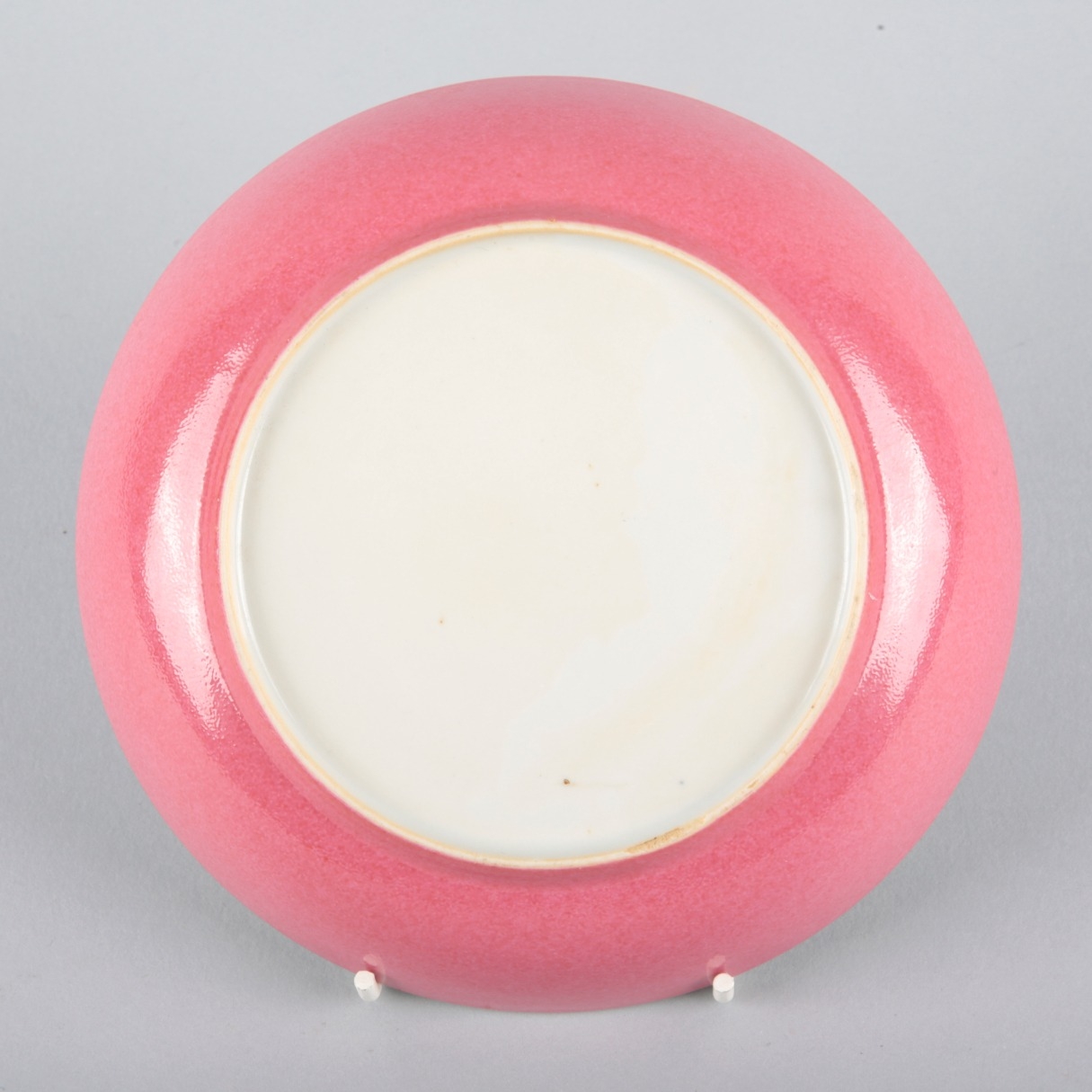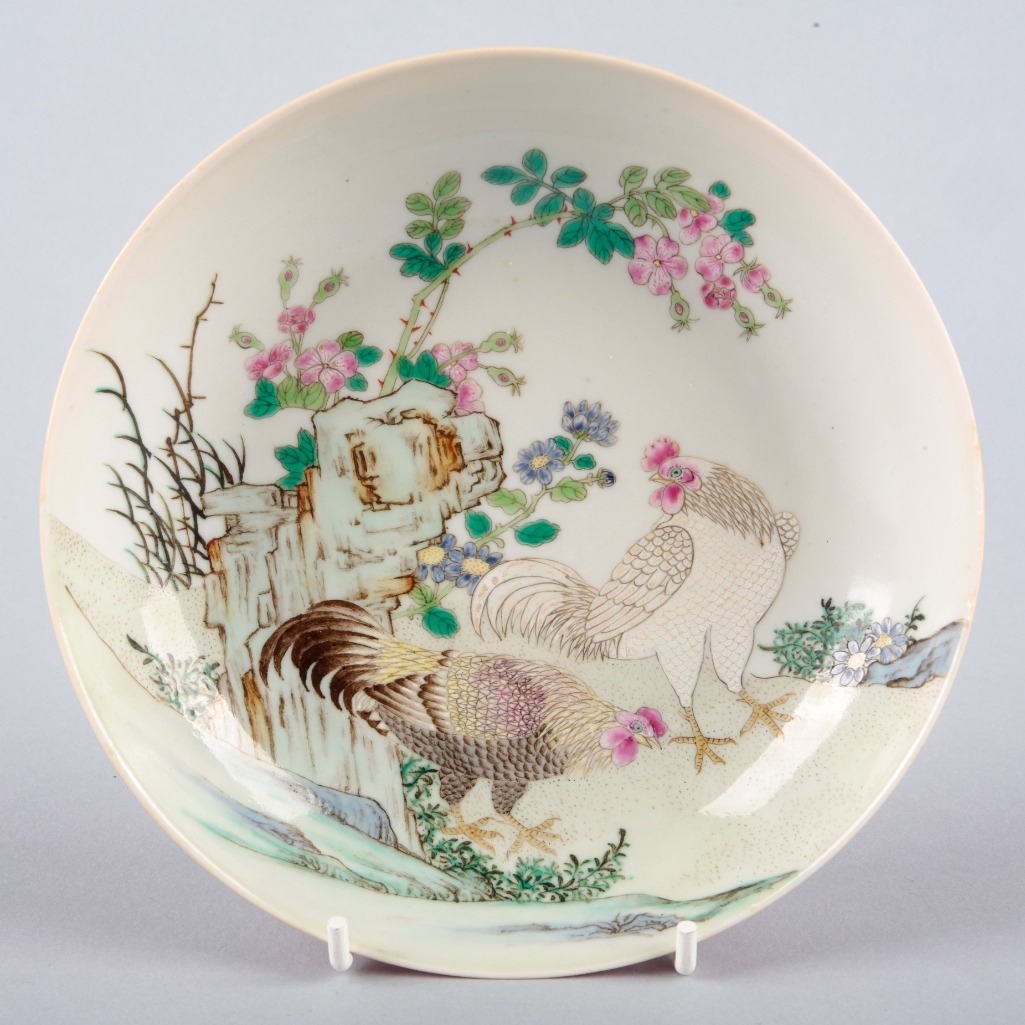 probably 20th century, decorated with two chickens in a rocky landscape with blossoming plants, the exterior in ruby red glaze, 15.5cm diameter