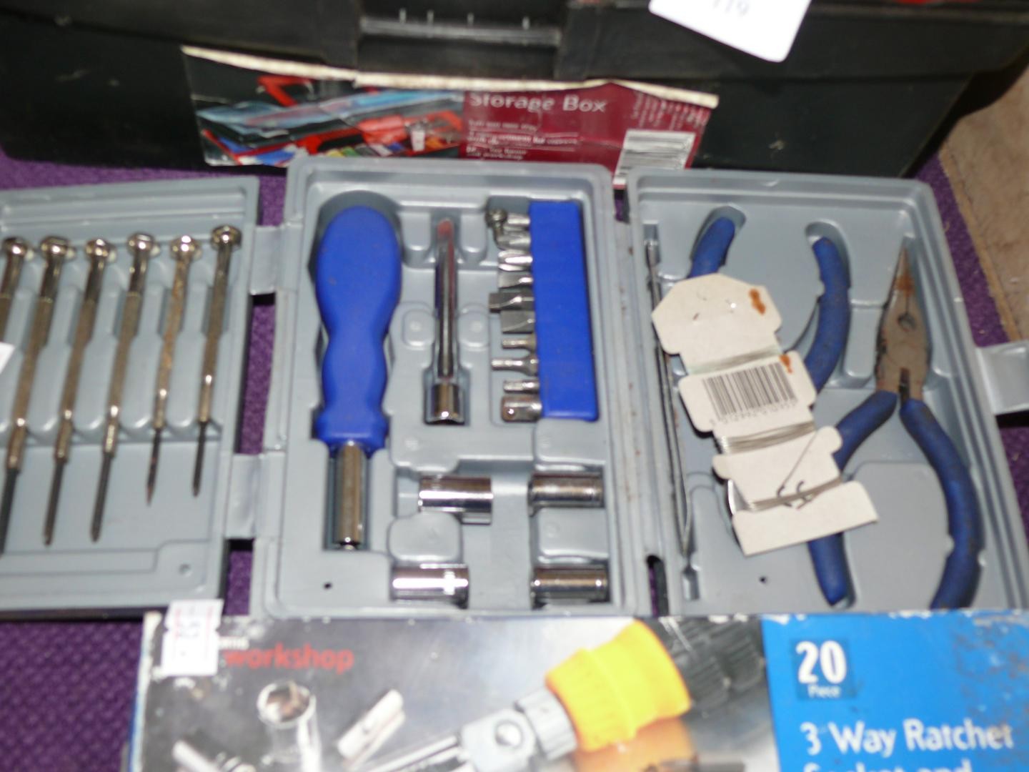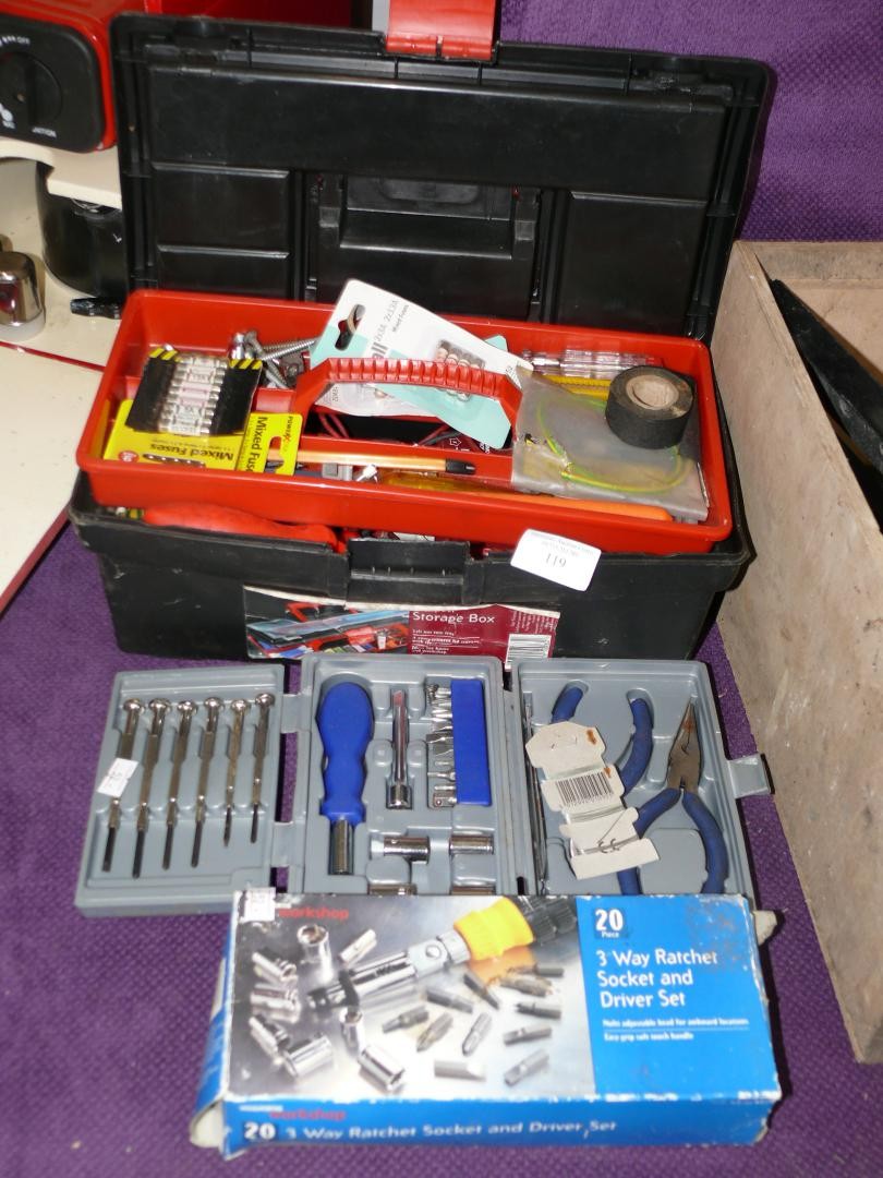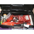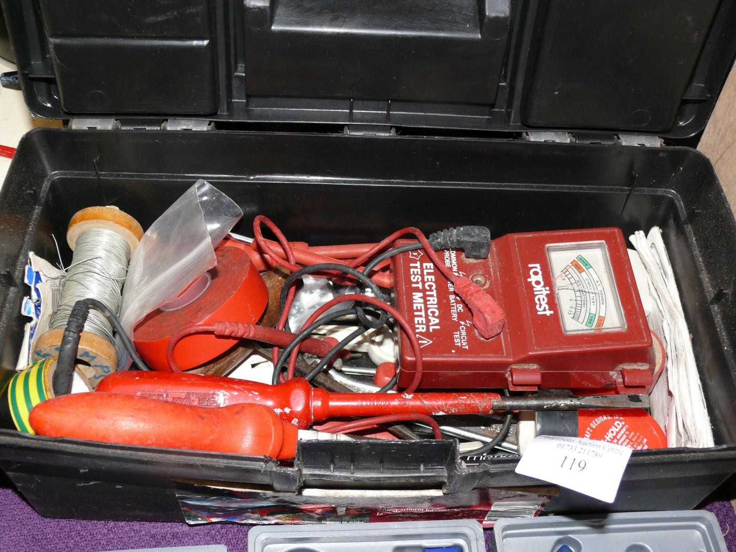 SMALL ELECTRICAL TOOL BOX INCLUDING MULTIMETER, CONVECTOR, SOLDER ETC PLUS PRECISION TOOL KIT & SMALL SOCKET SET