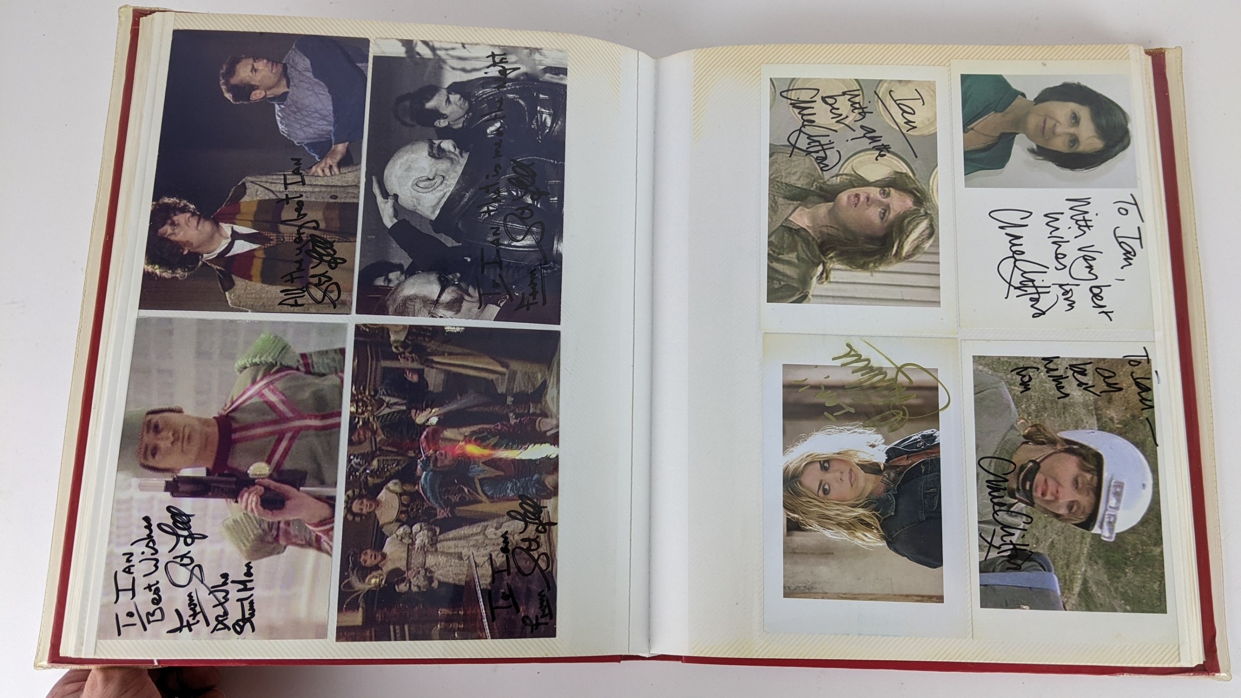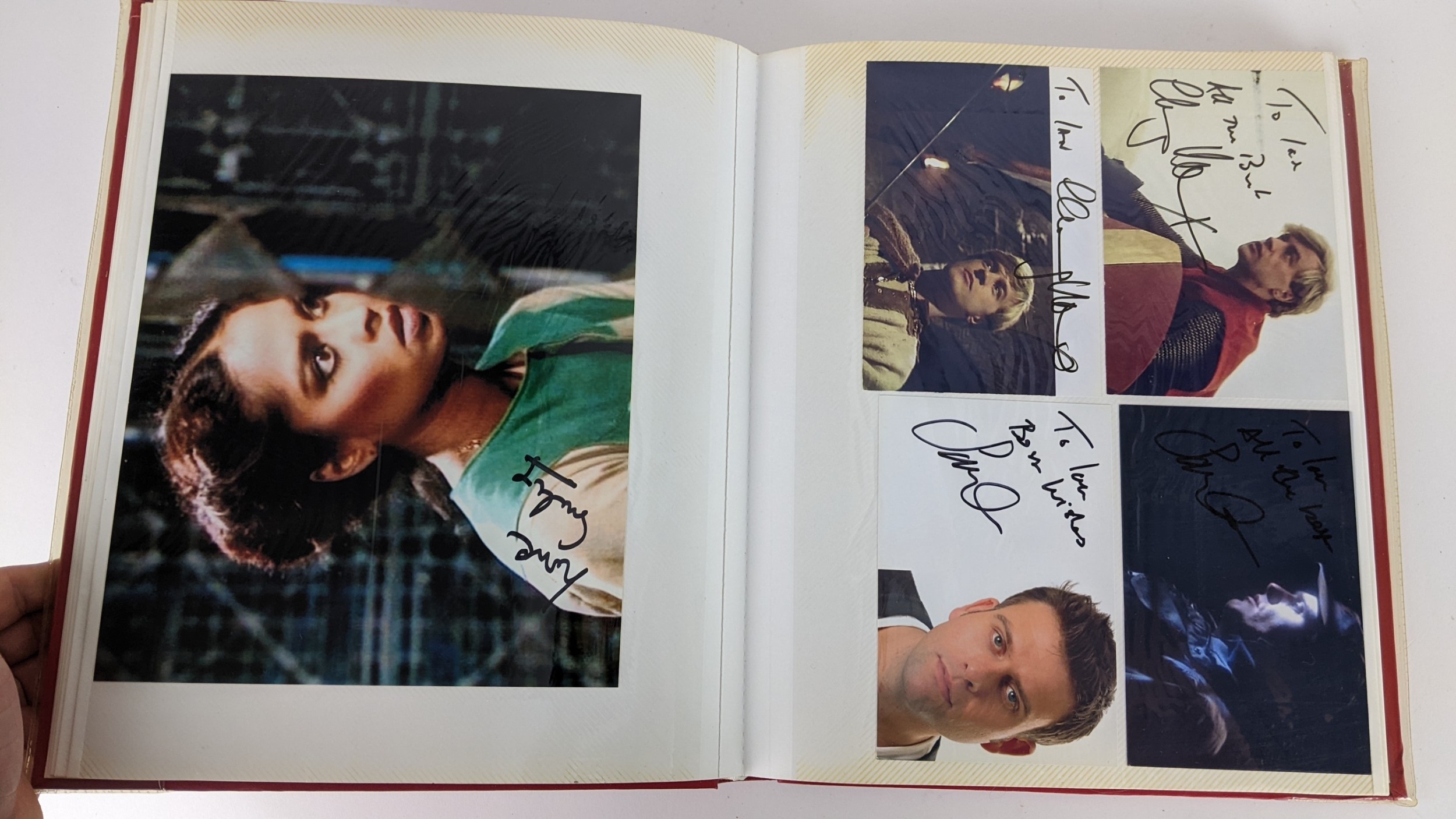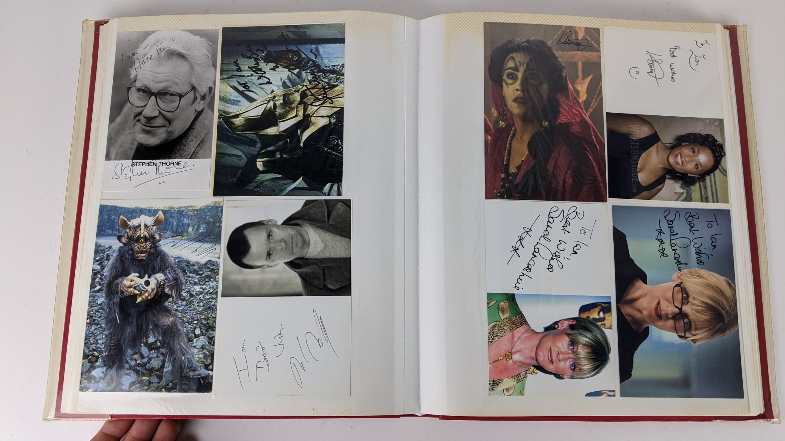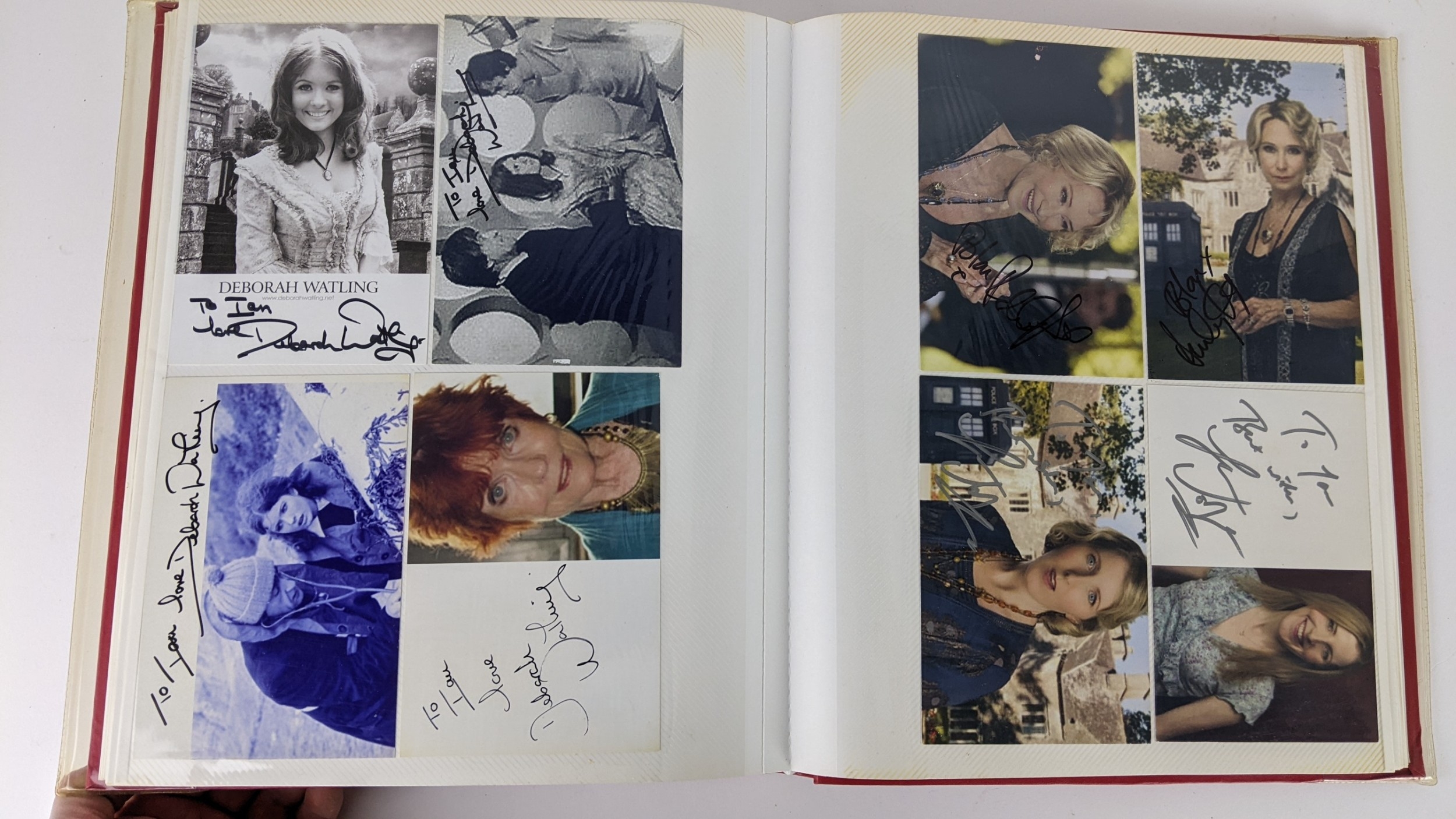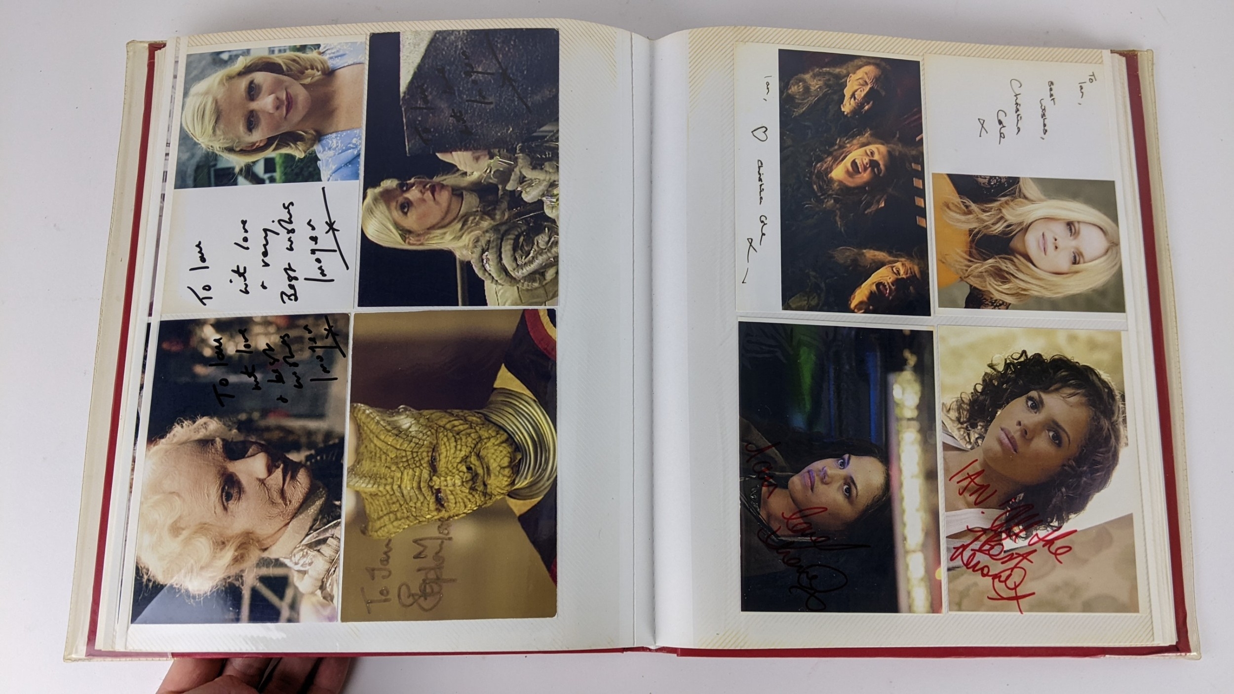 A Doctor Who album of autographs on photos, signed by several cast members to include Jacqueline Pearce, Tara Ward, Sarah Lancashire and others