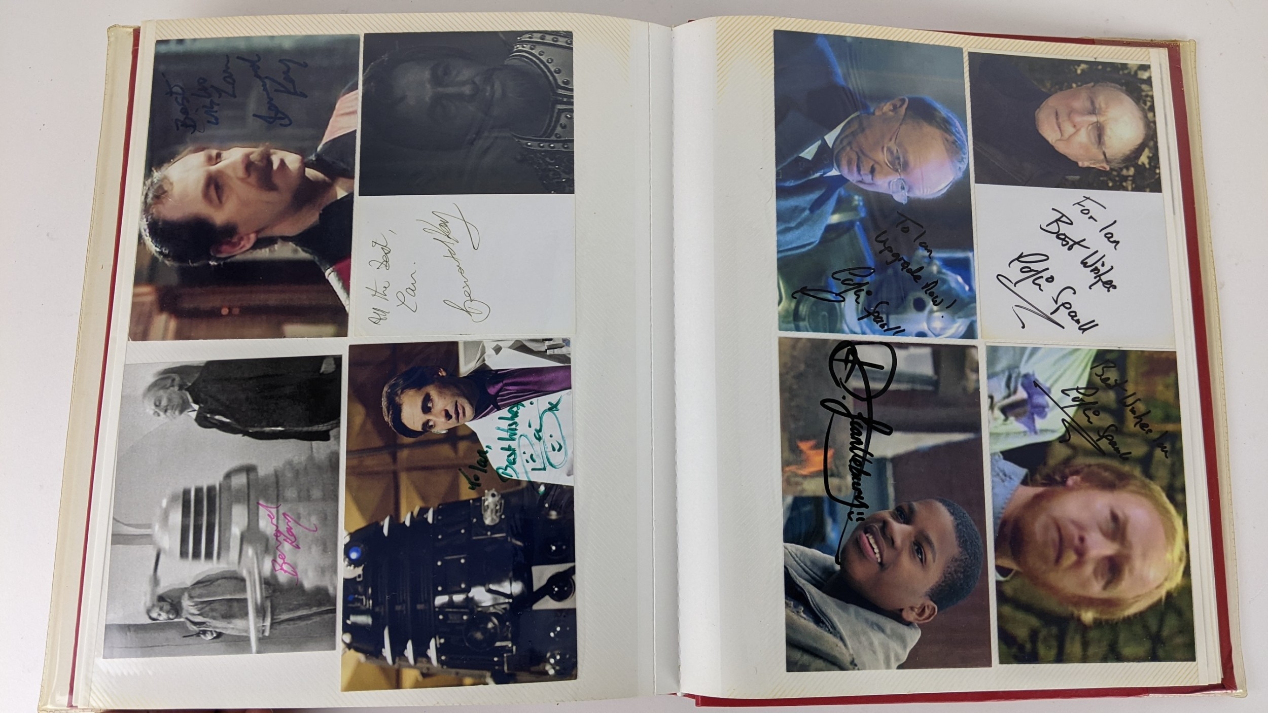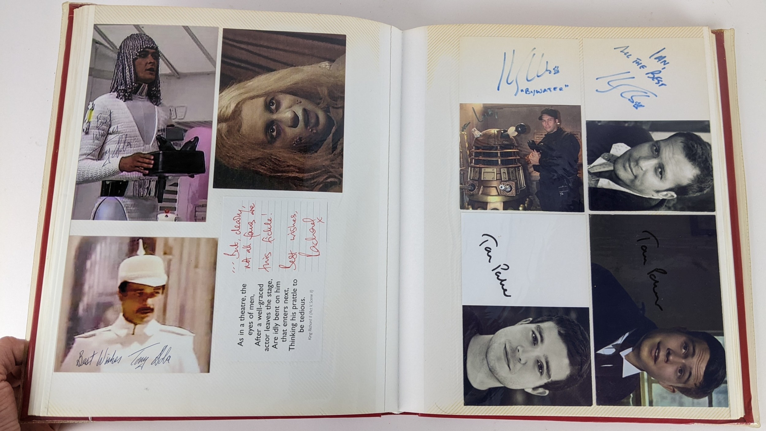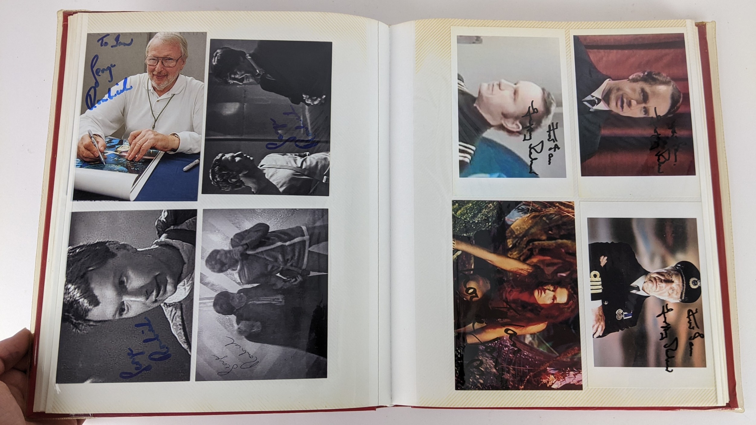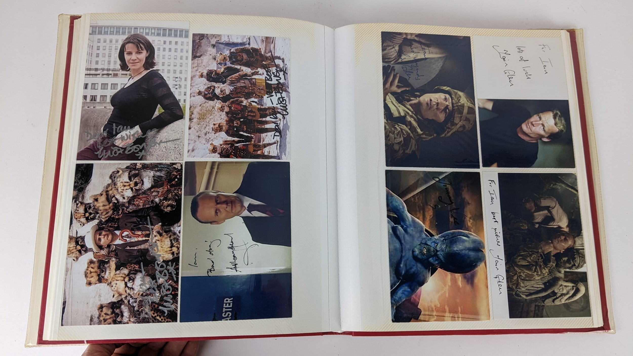 A Doctor Who album of autographs on photos, signed by several cast members to include Jacqueline Pearce, Tara Ward, Sarah Lancashire and others