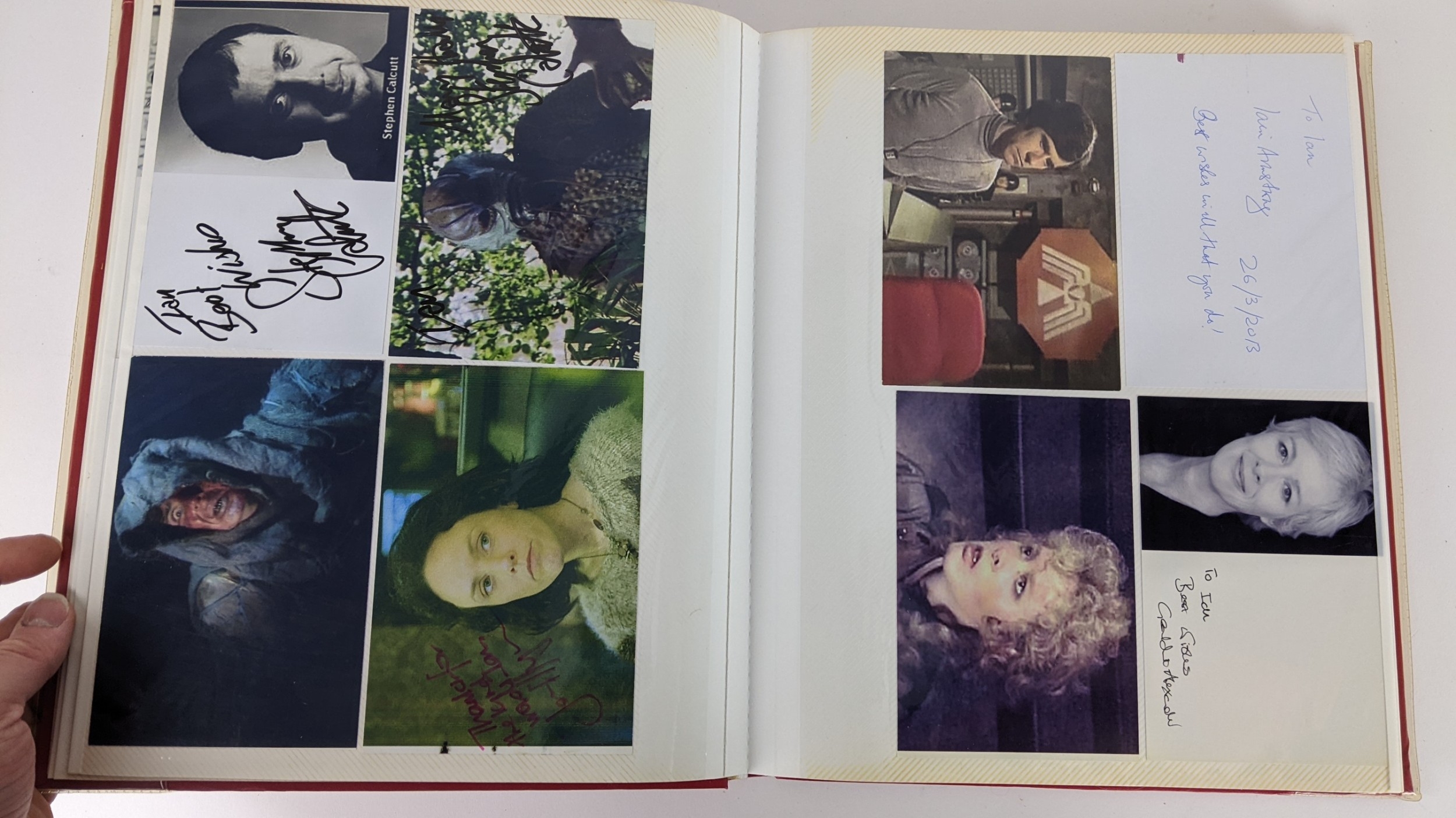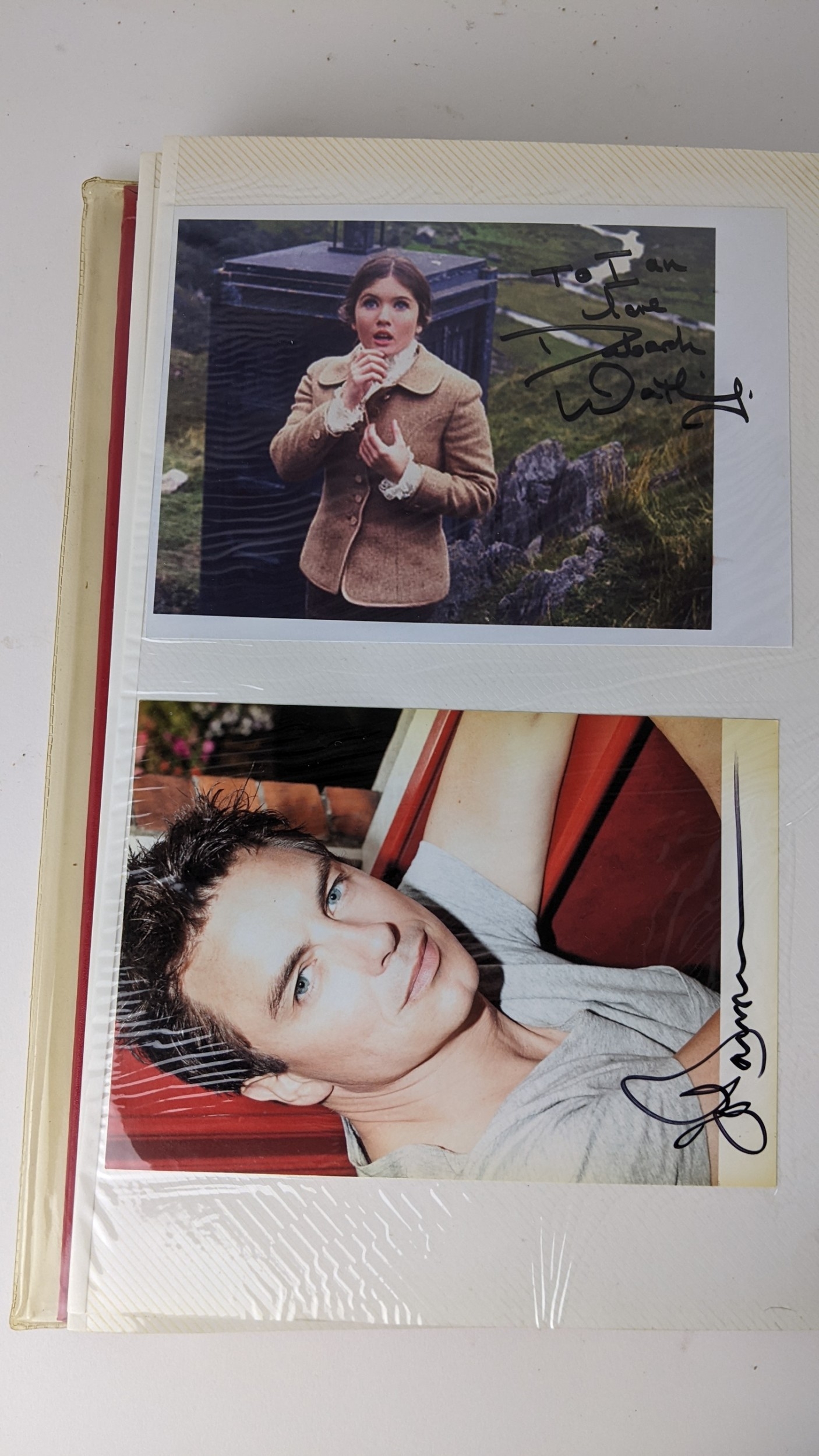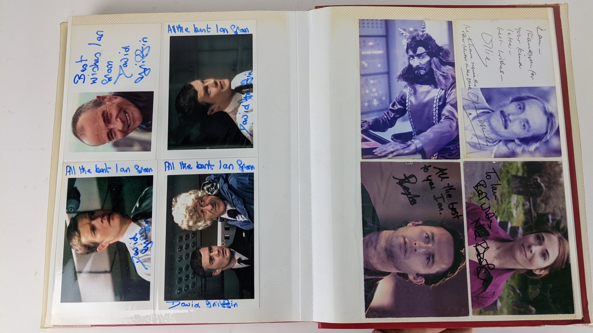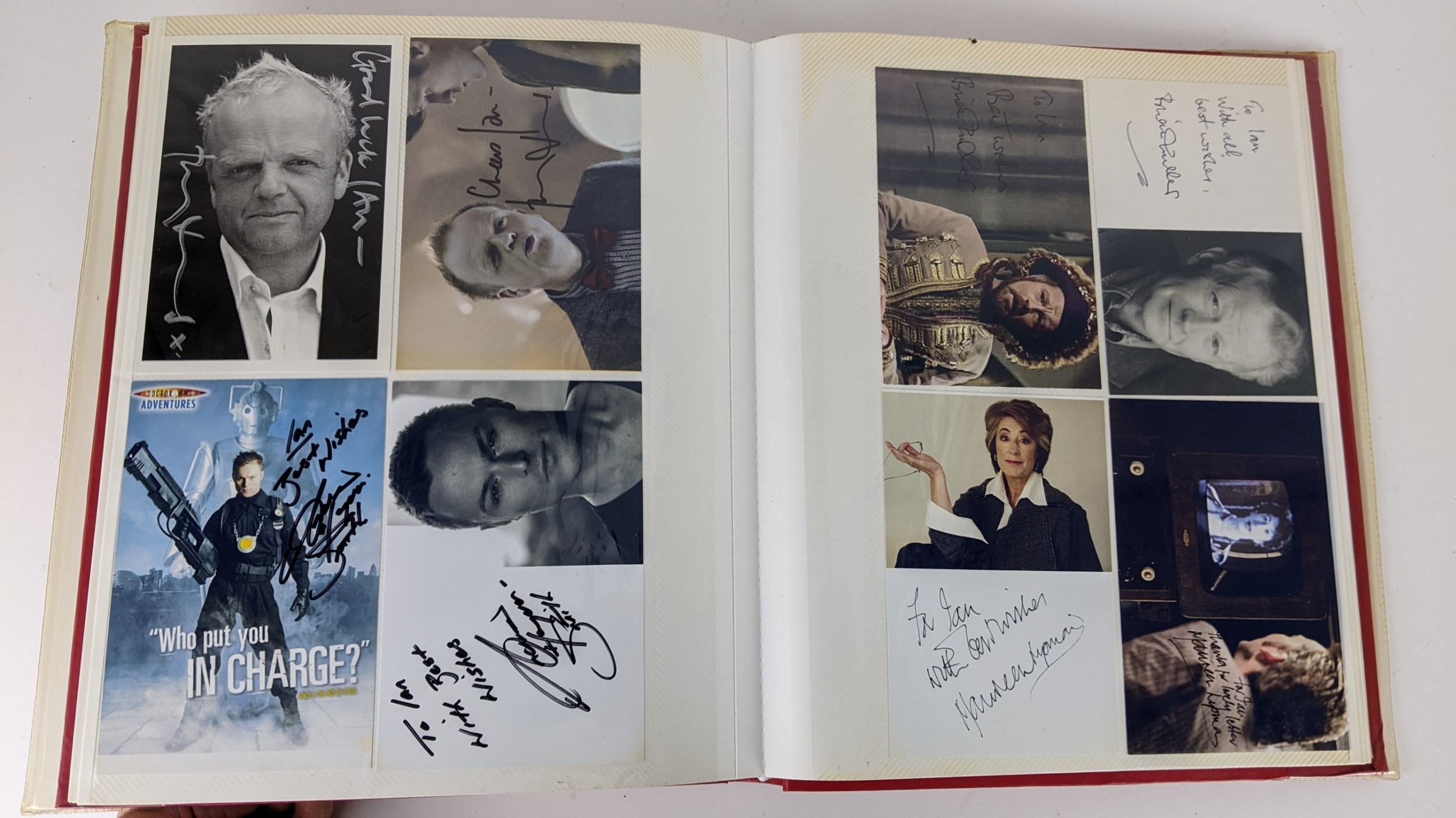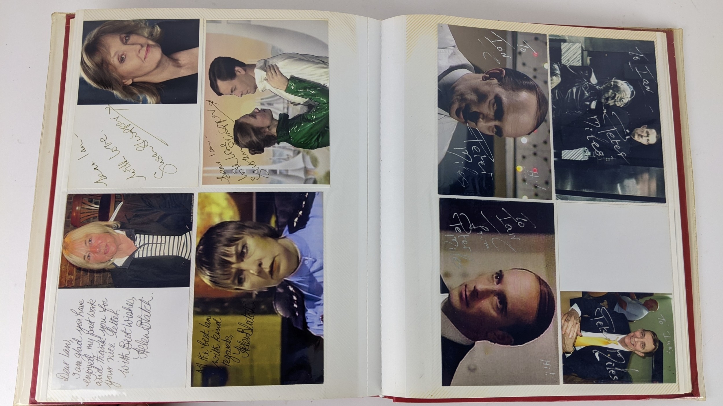 A Doctor Who album of autographs on photos, signed by several cast members to include Jacqueline Pearce, Tara Ward, Sarah Lancashire and others